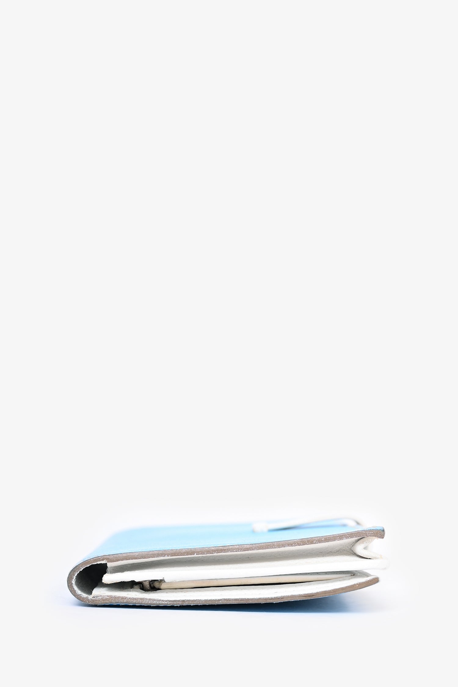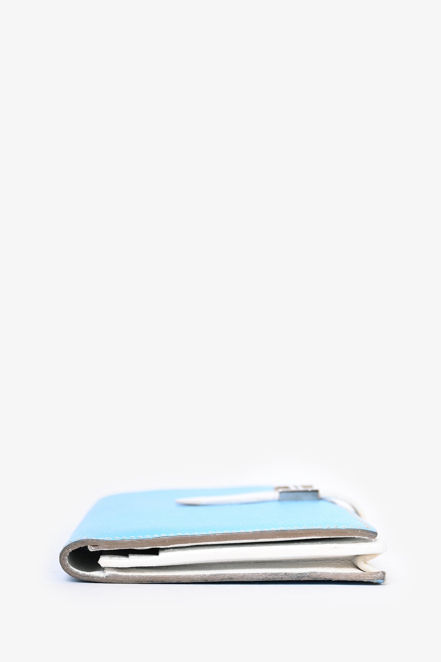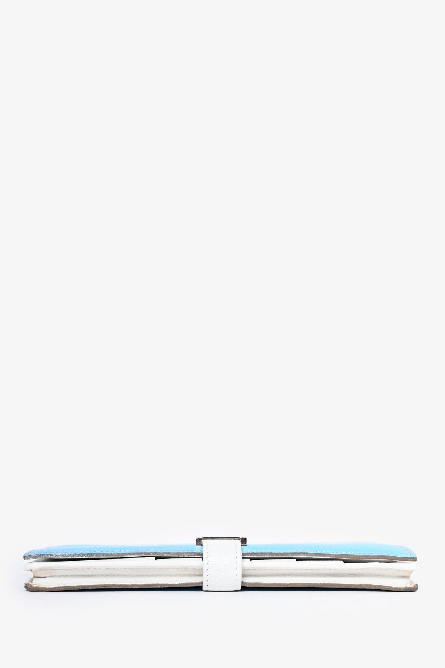 Refresh availabilityHermès 2011 Blue/White Epsom Leather Bearn Wallet. Front fold-over strap closure. 5 card slots. 4 billfold compartments. 1 zippered coin compartment. Silver-tone hardware. Lining repainted.