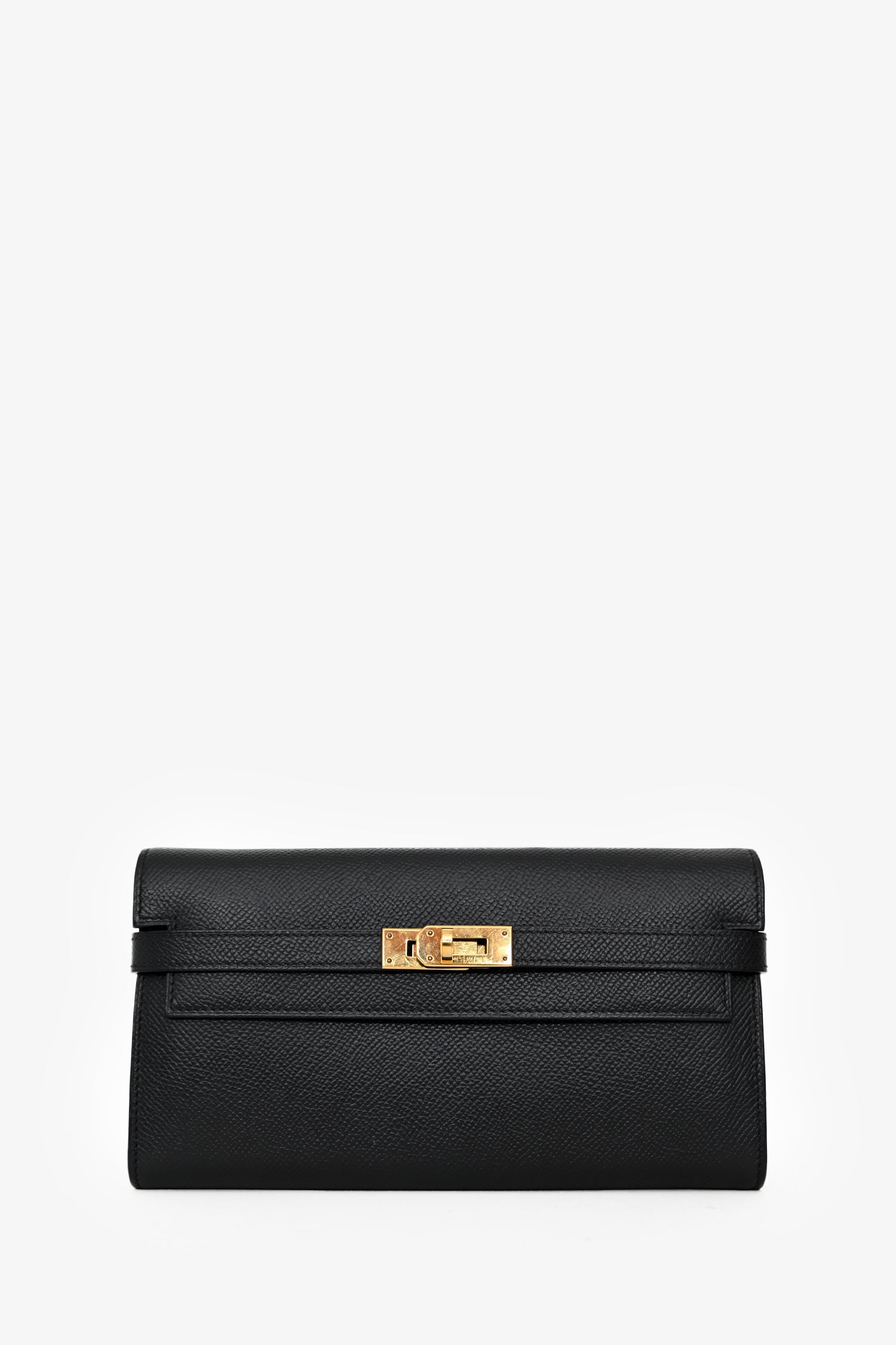 Refresh availabilityHermès 2012 Black Epsom Leather Kelly Wallet. Front flap with signature Kelly turn-lock closure. Leather-lined interior with multiple card slots, bill compartments, and zip coin pocket. 3 main compartments; 2 open and 1 center zipped. Gold-tone hardware. Tonal stitching.