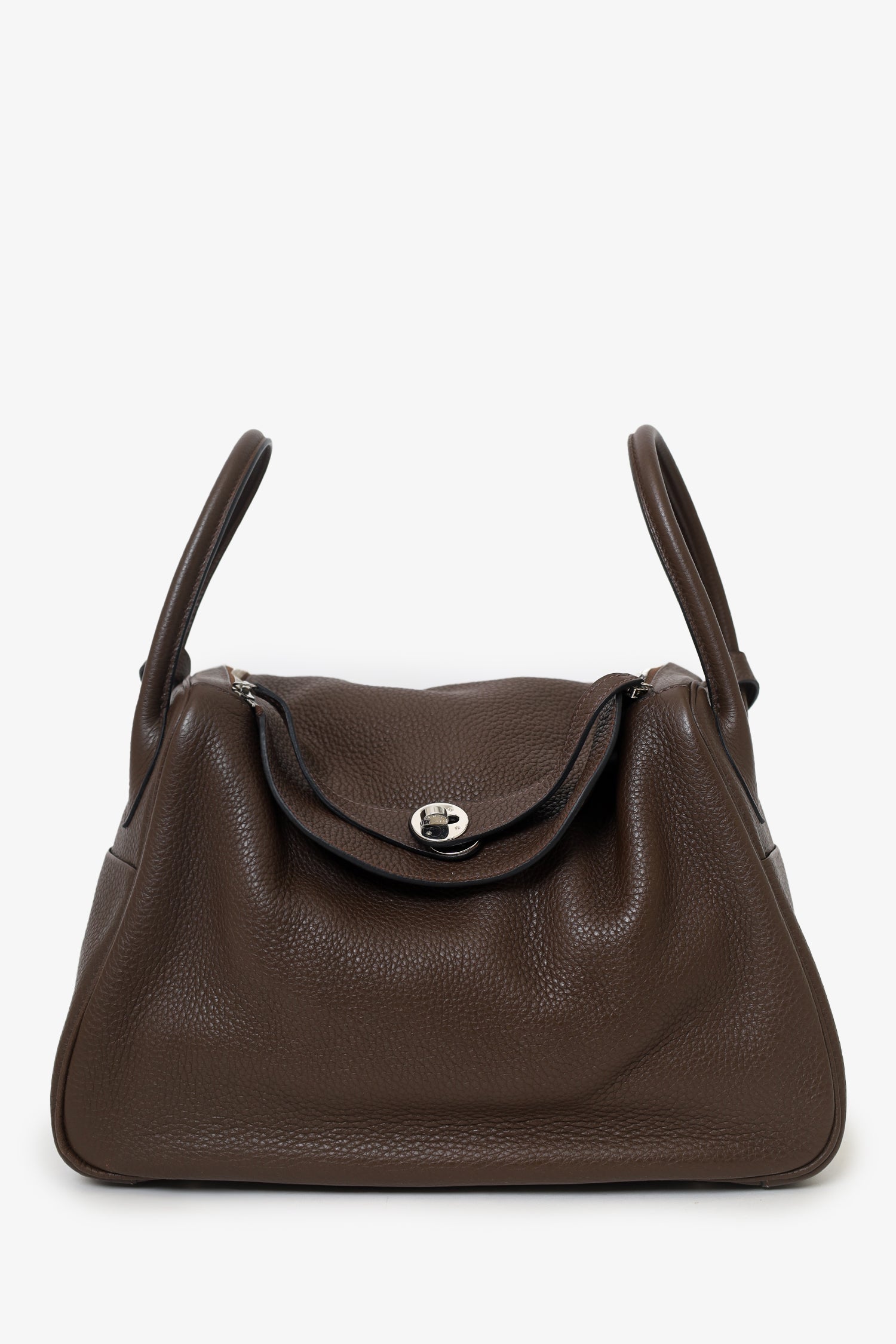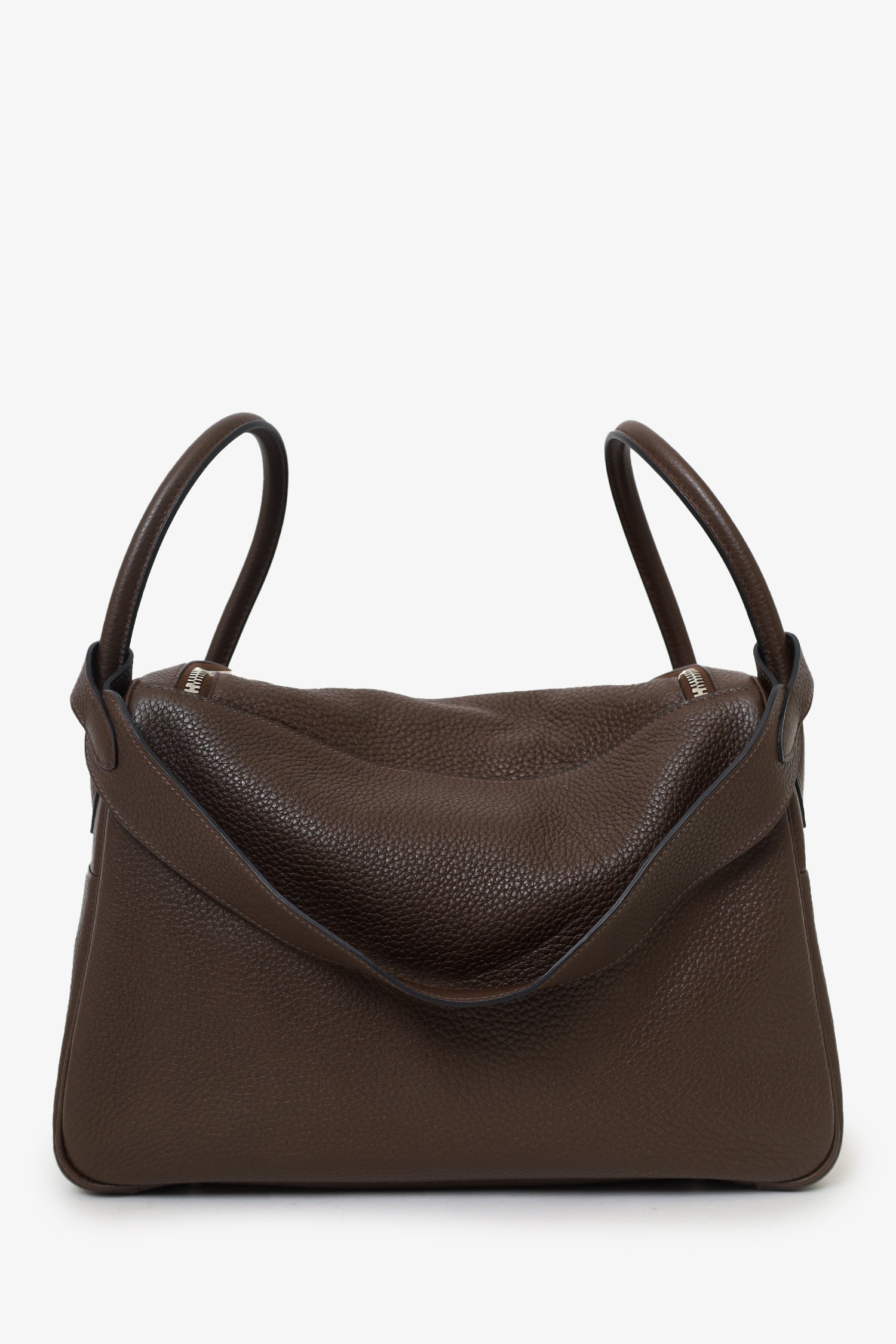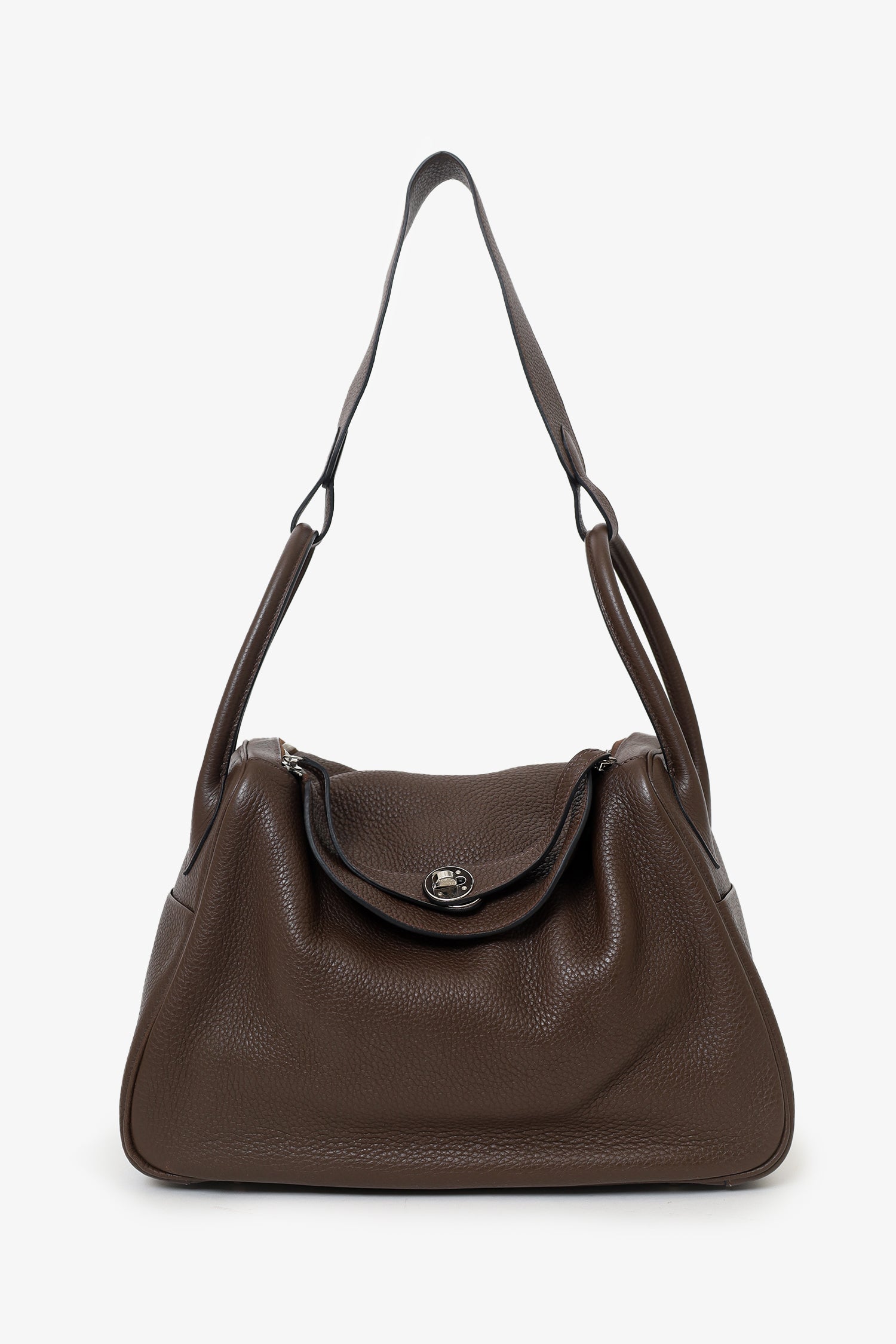 Refresh availabilityHermes 2012 Chocolate Brown Clemence Leather Lindy. Top zip and turn-lock closure. Twin top handles with leather piece that can convert into single shoulder strap. Protective studs on bottom. 2 interior slip pockets. Silver-tone hardware. Tonal stitching.
