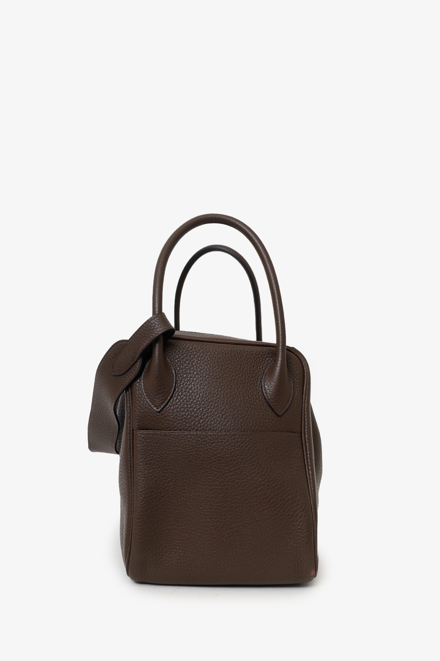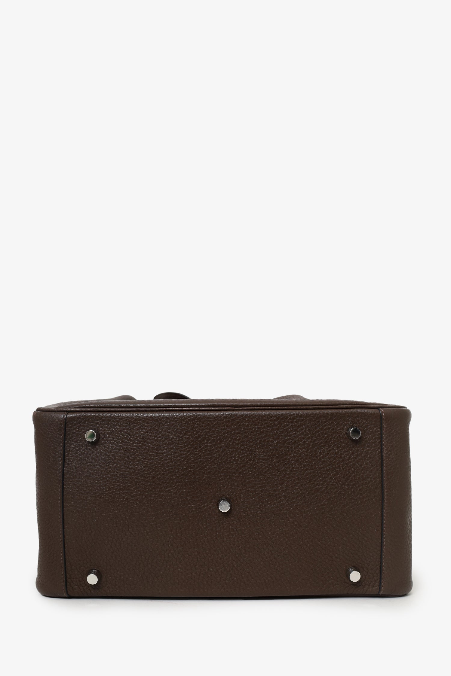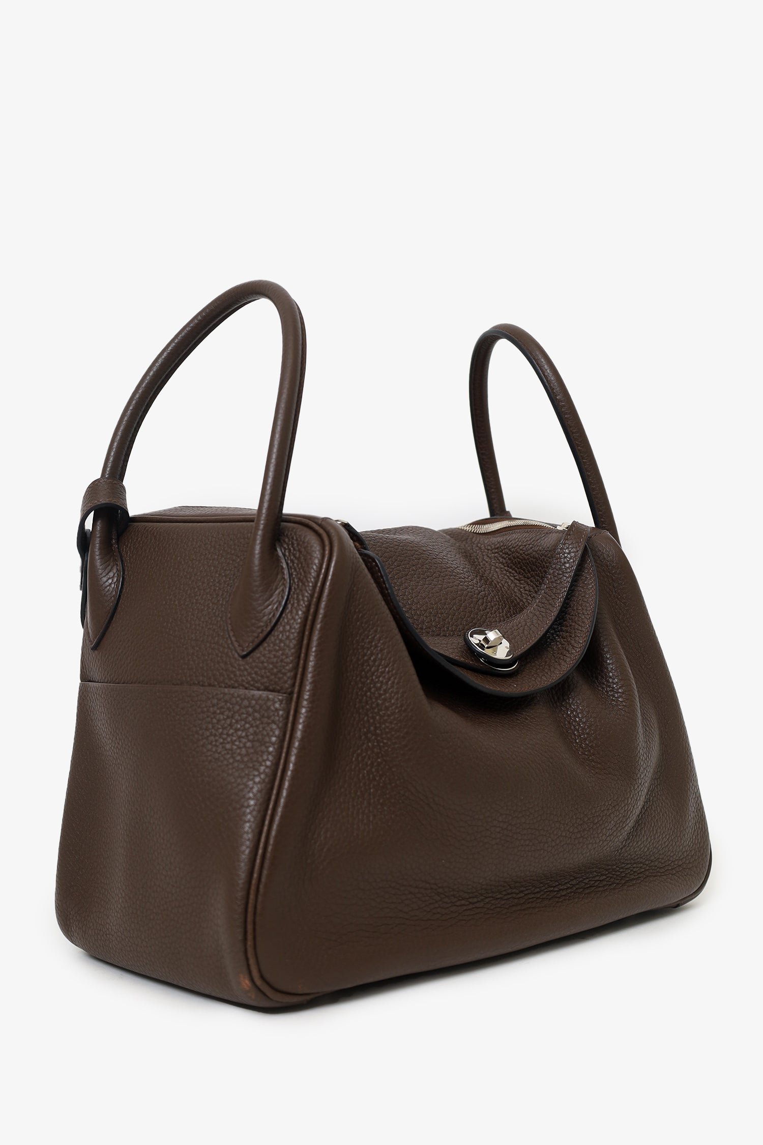 Refresh availabilityHermes 2012 Chocolate Brown Clemence Leather Lindy. Top zip and turn-lock closure. Twin top handles with leather piece that can convert into single shoulder strap. Protective studs on bottom. 2 interior slip pockets. Silver-tone hardware. Tonal stitching.