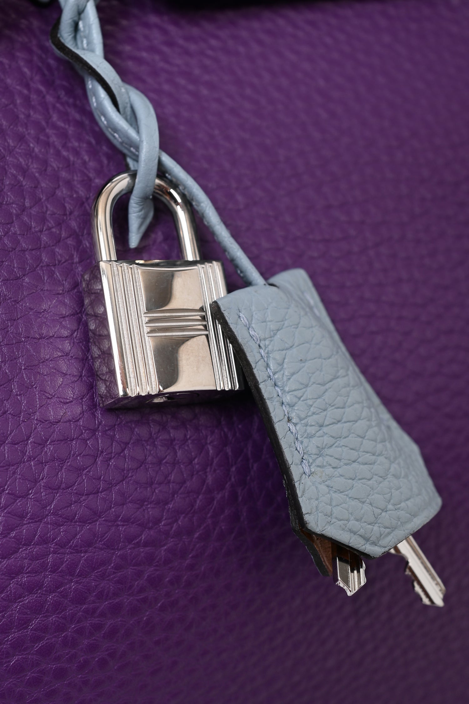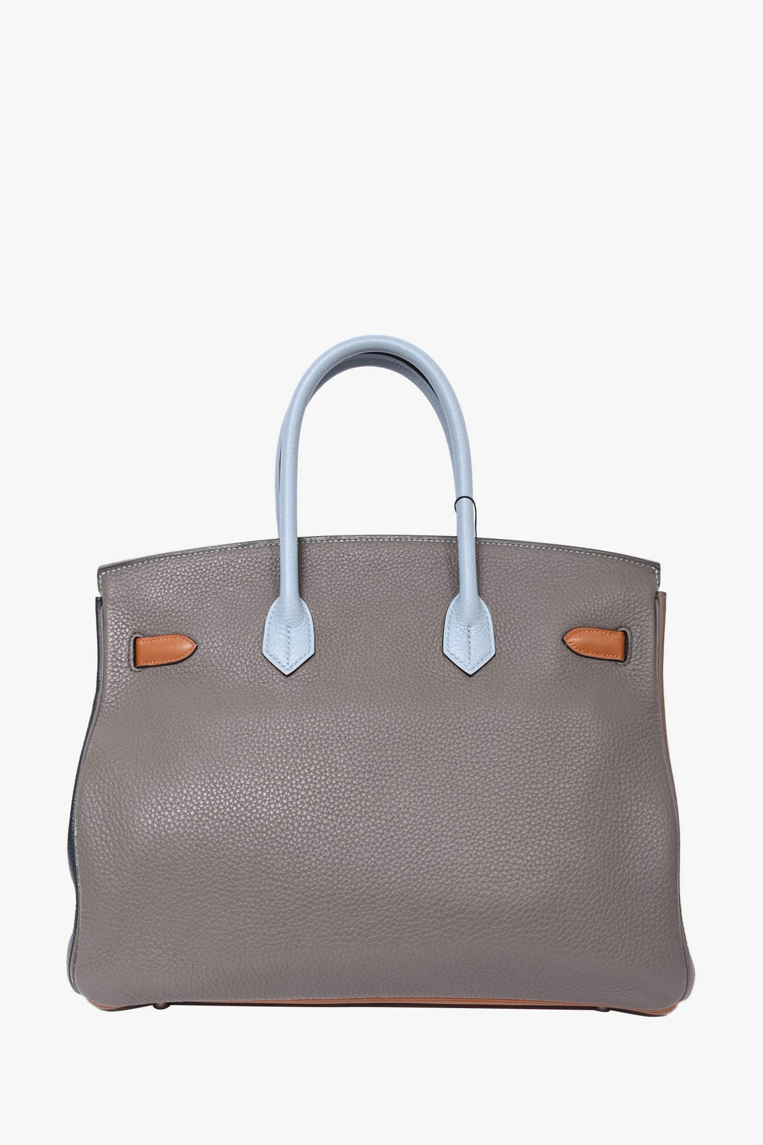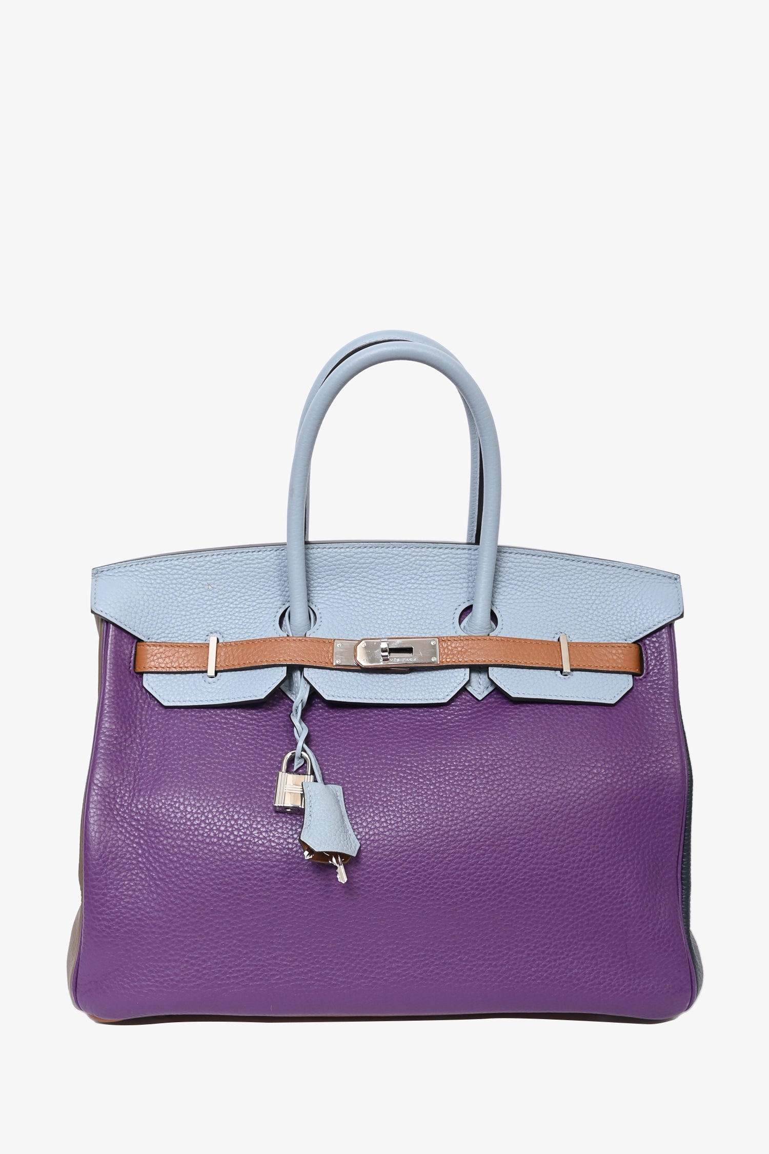 Refresh availabilityHermes 2012 Clemence Leather Arlequin Birkin 35. Turn-lock closure at front. Dual rolled top handles. Protective studs at the bottom. Contrast leather lining. 2 interior wall pockets; 1 slip and 1 with zip closure. Removable felt interior lining. Silver-tone hardware. Detachable clochette with lock-box. Contrast stitching.