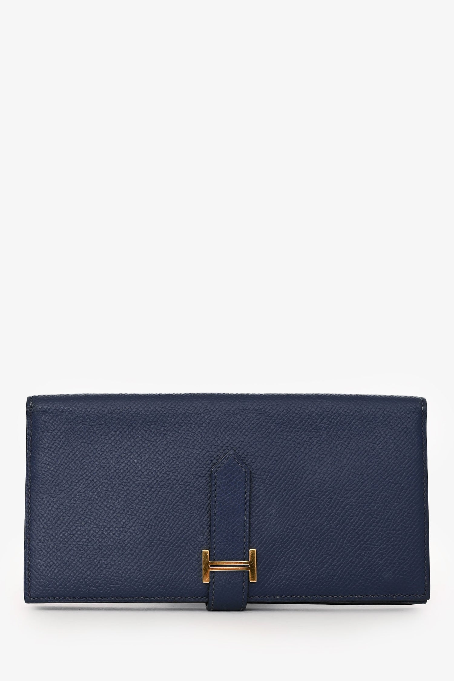 Refresh availabilityHermès 2011 Navy Epsom Leather Bearn Long Wallet Gold Hardware. Fold-over strap with H logo tab closure. Interior zip coin pocket, 4 slip pockets, and 5 card slots. Gold-tone hardware. Tonal stitching.