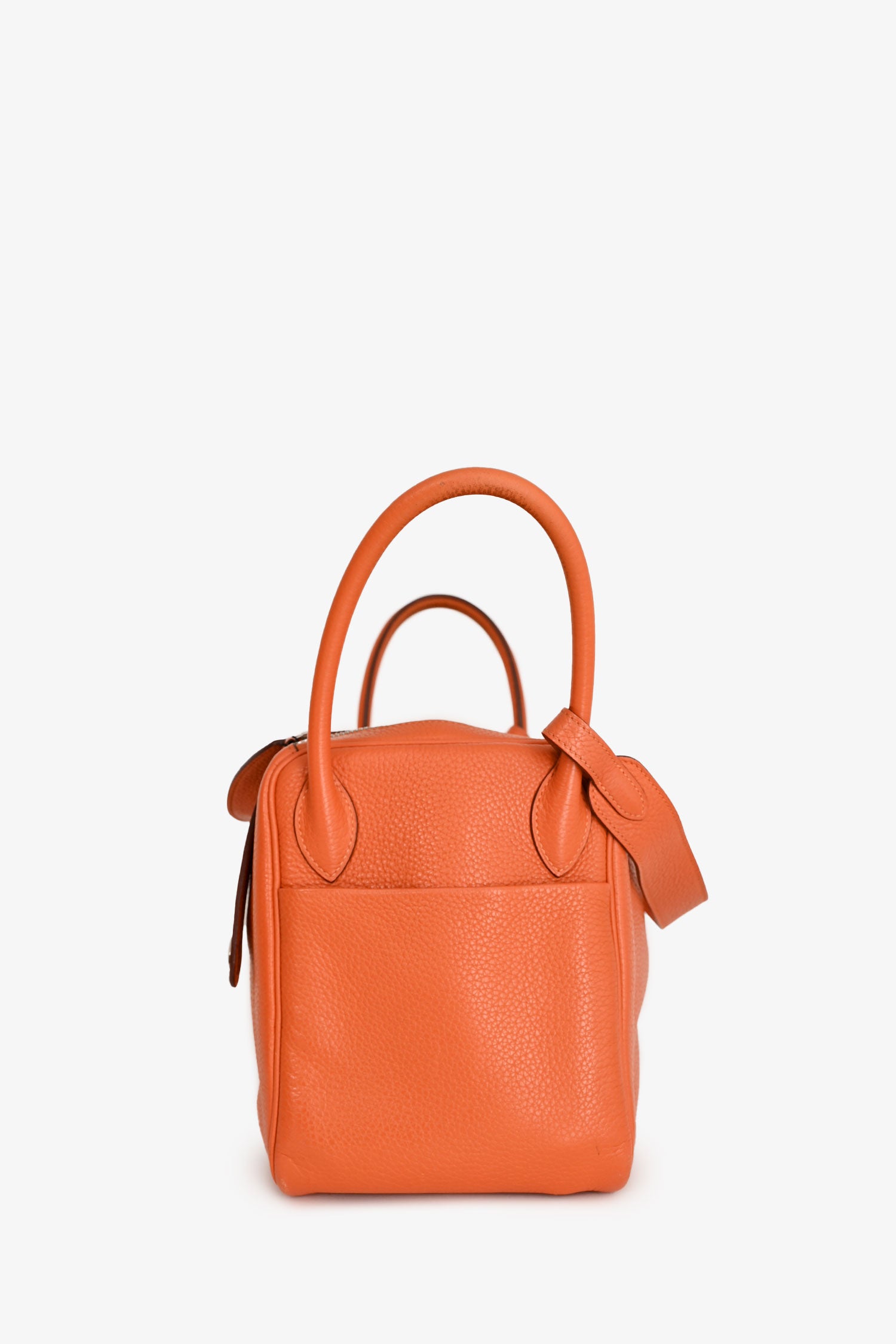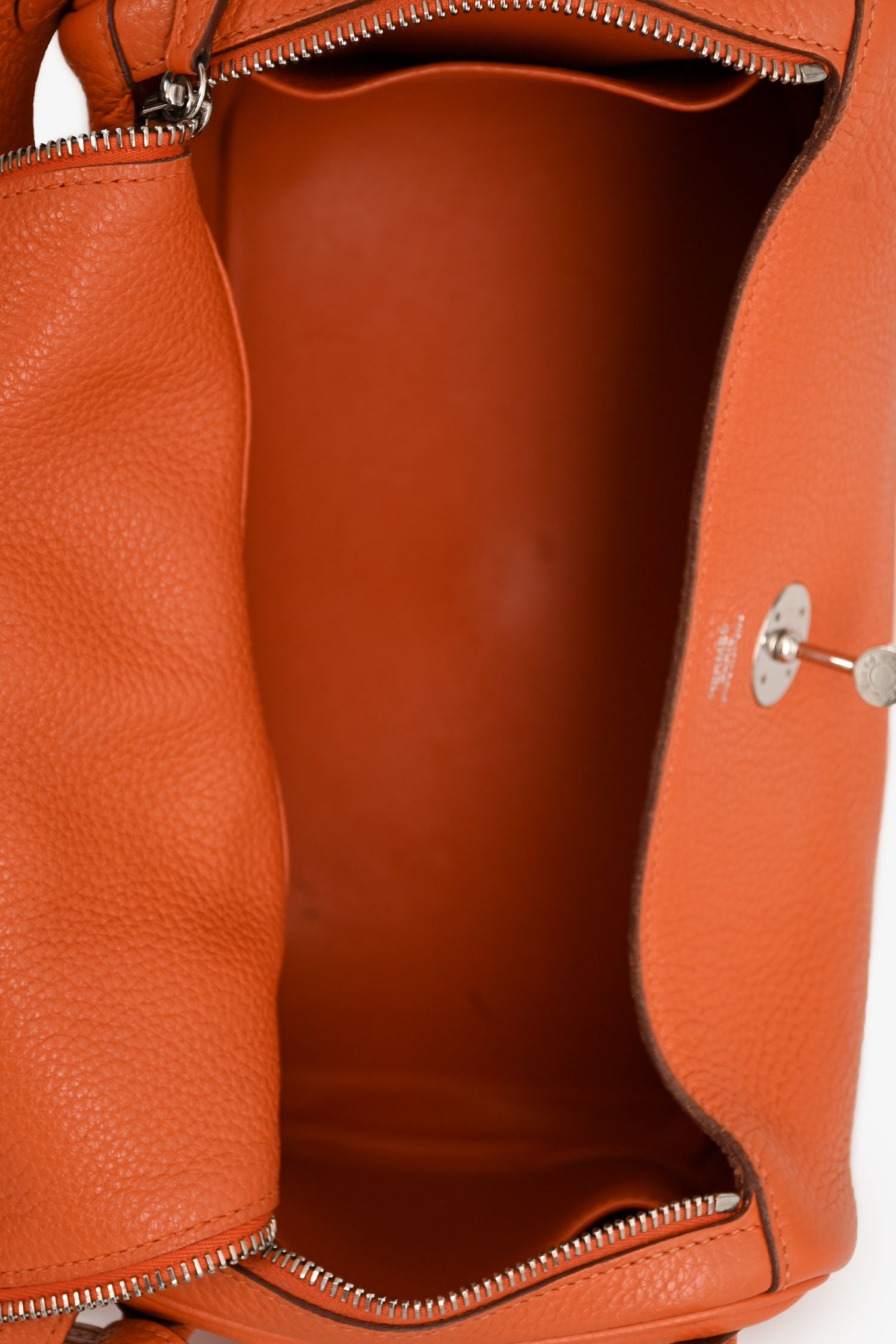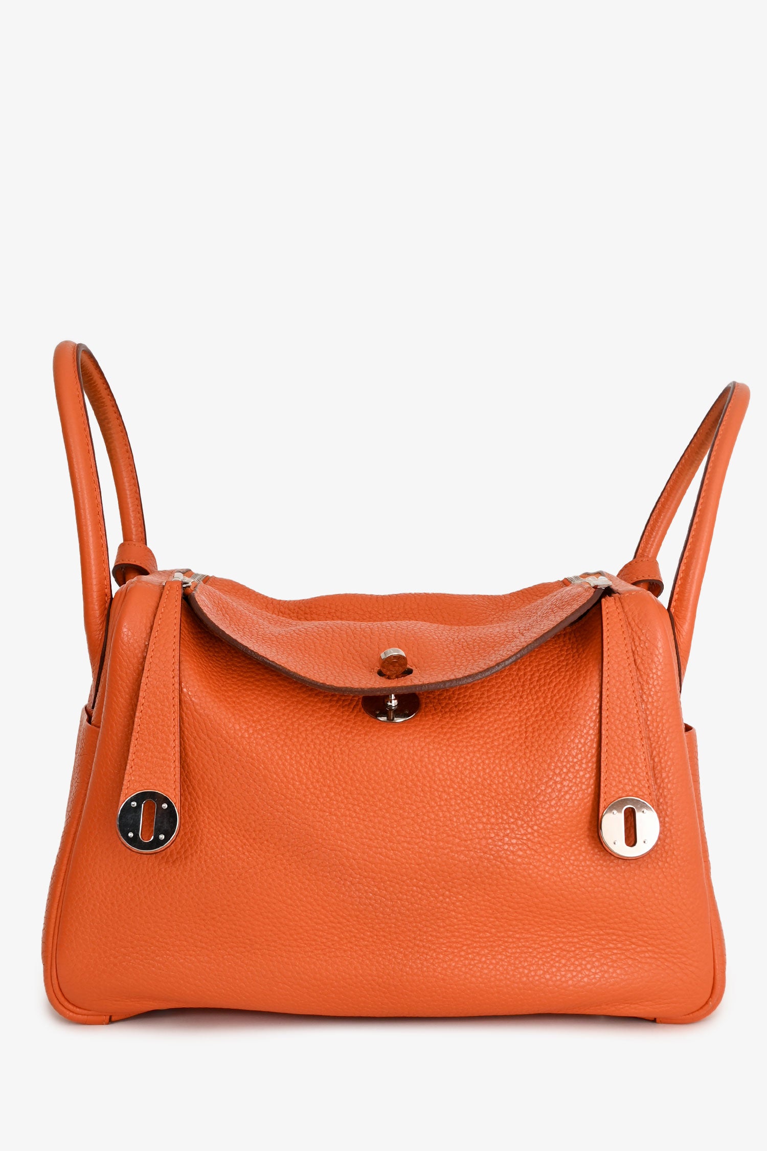 Refresh availabilityHermès 2012 Orange Clemence Lindy 30. Dual rolled top handles with additional shoulder strap. Top zip closures with dual zippers. Two side exterior and interior pockets. Spacious leather-lined interior with slip pockets. Tonal stitching.