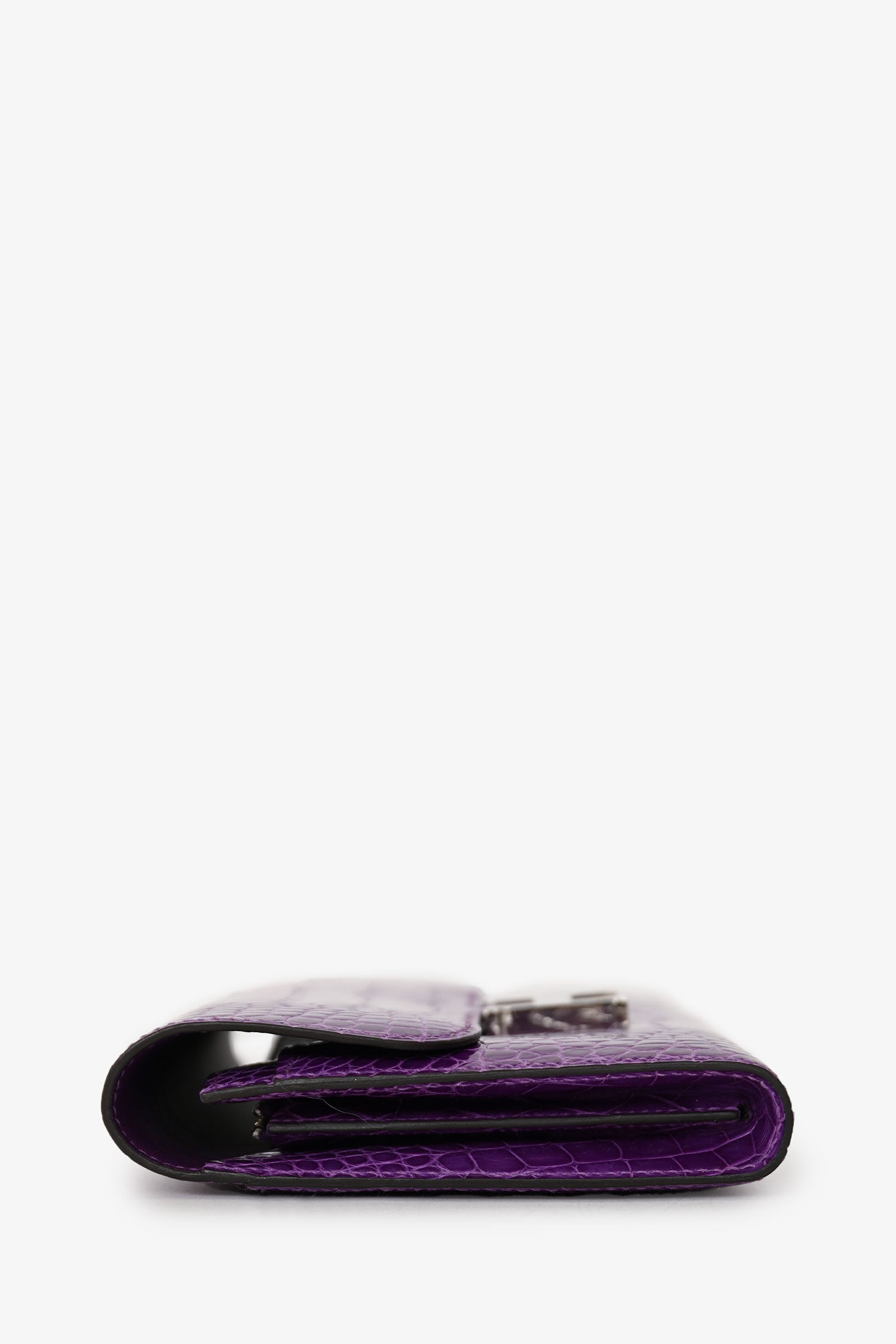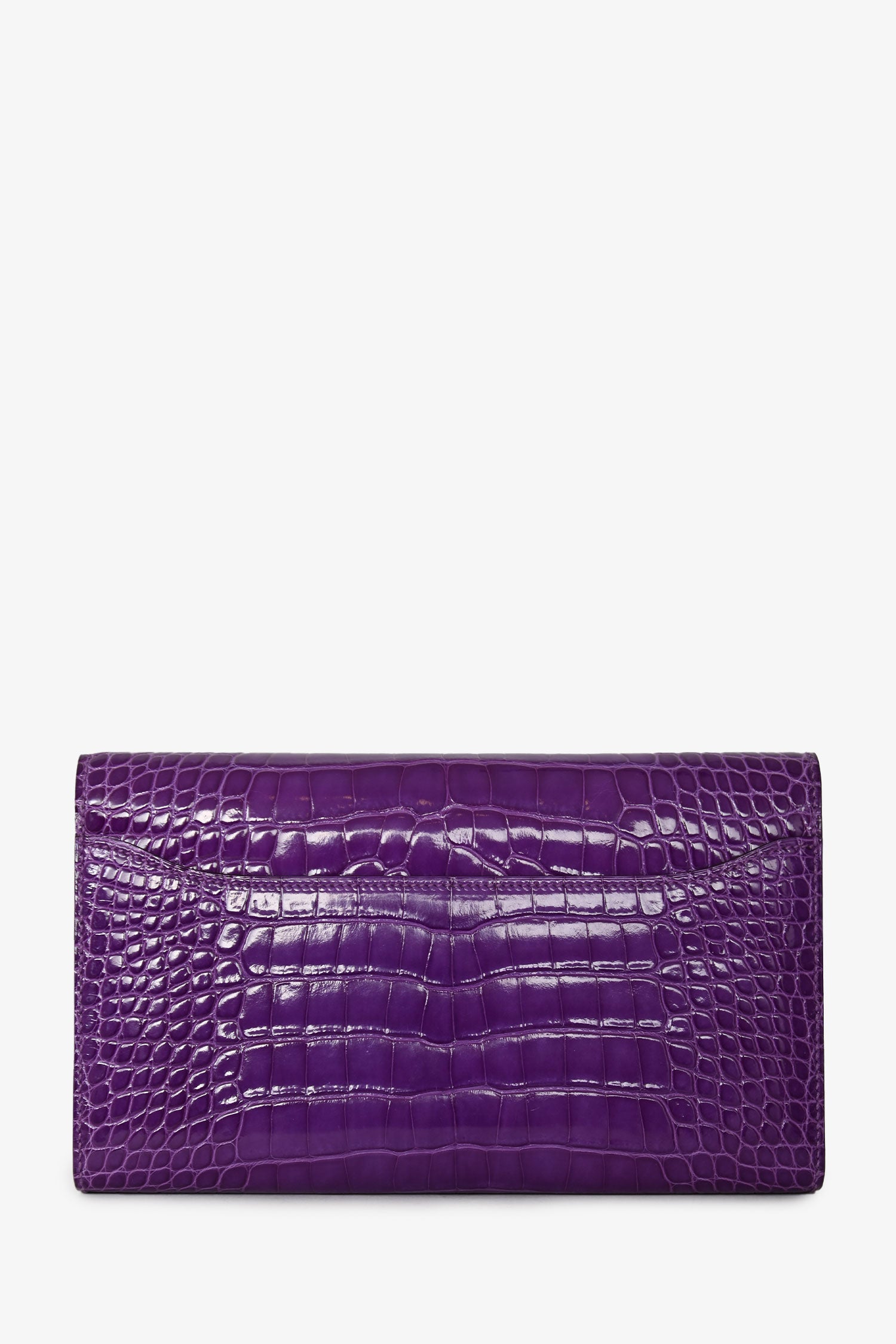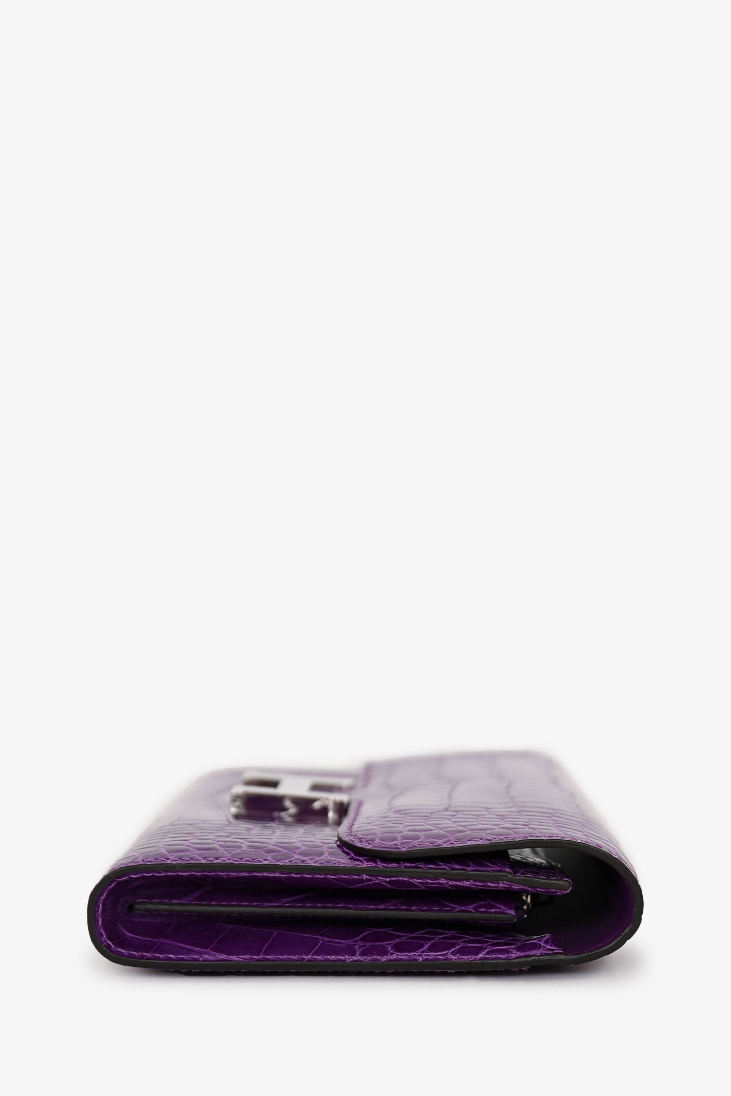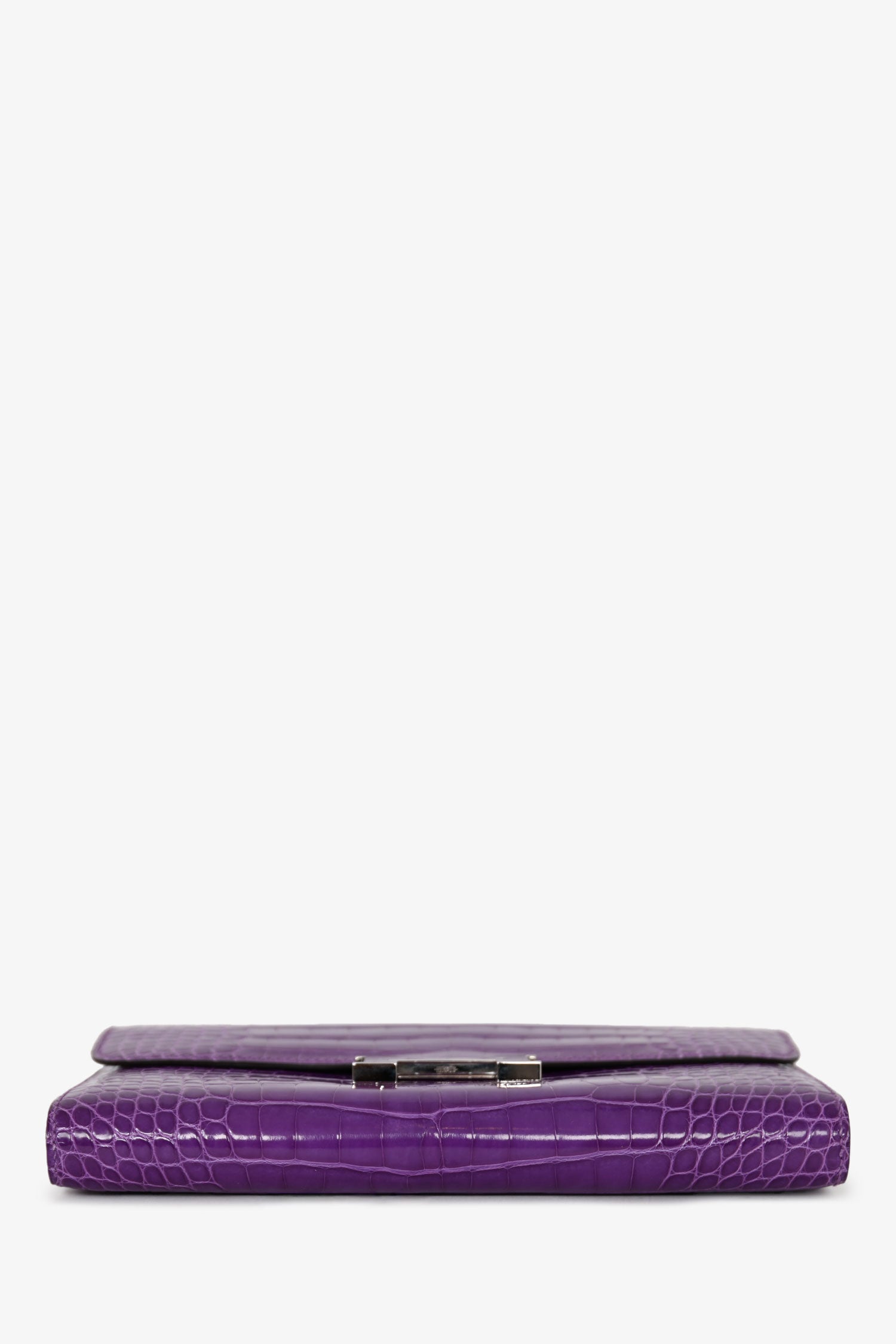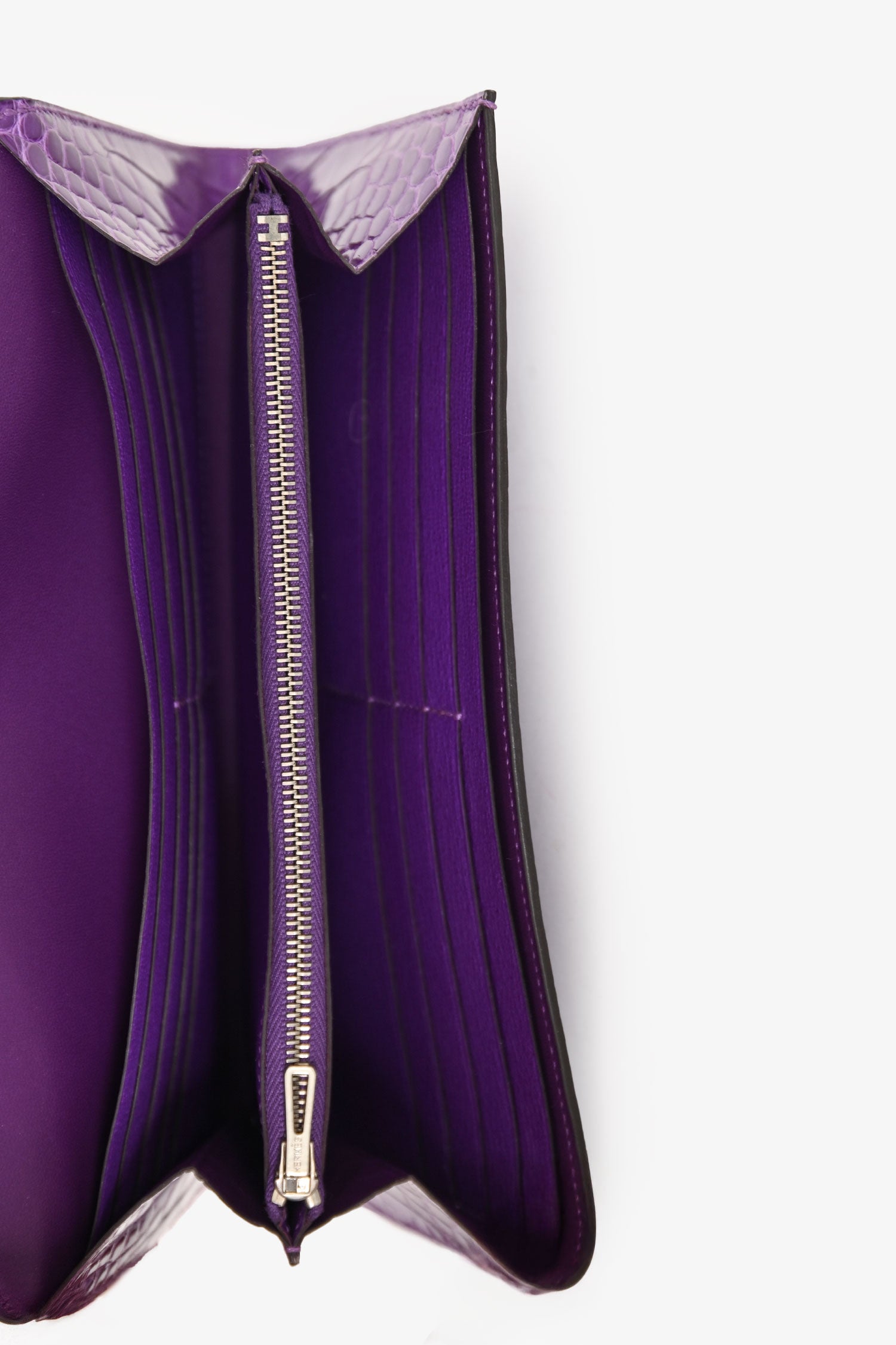 Refresh availabilityHermès 2013 Purple Shiny Alligator Constance Wallet. Fold-over flap with a click closure. 5 interior compartments: 1 zip and 4 slip. 14 card slots. Single exterior slip pocket in the rear. Silver-tone hardware. Tonal stitching.