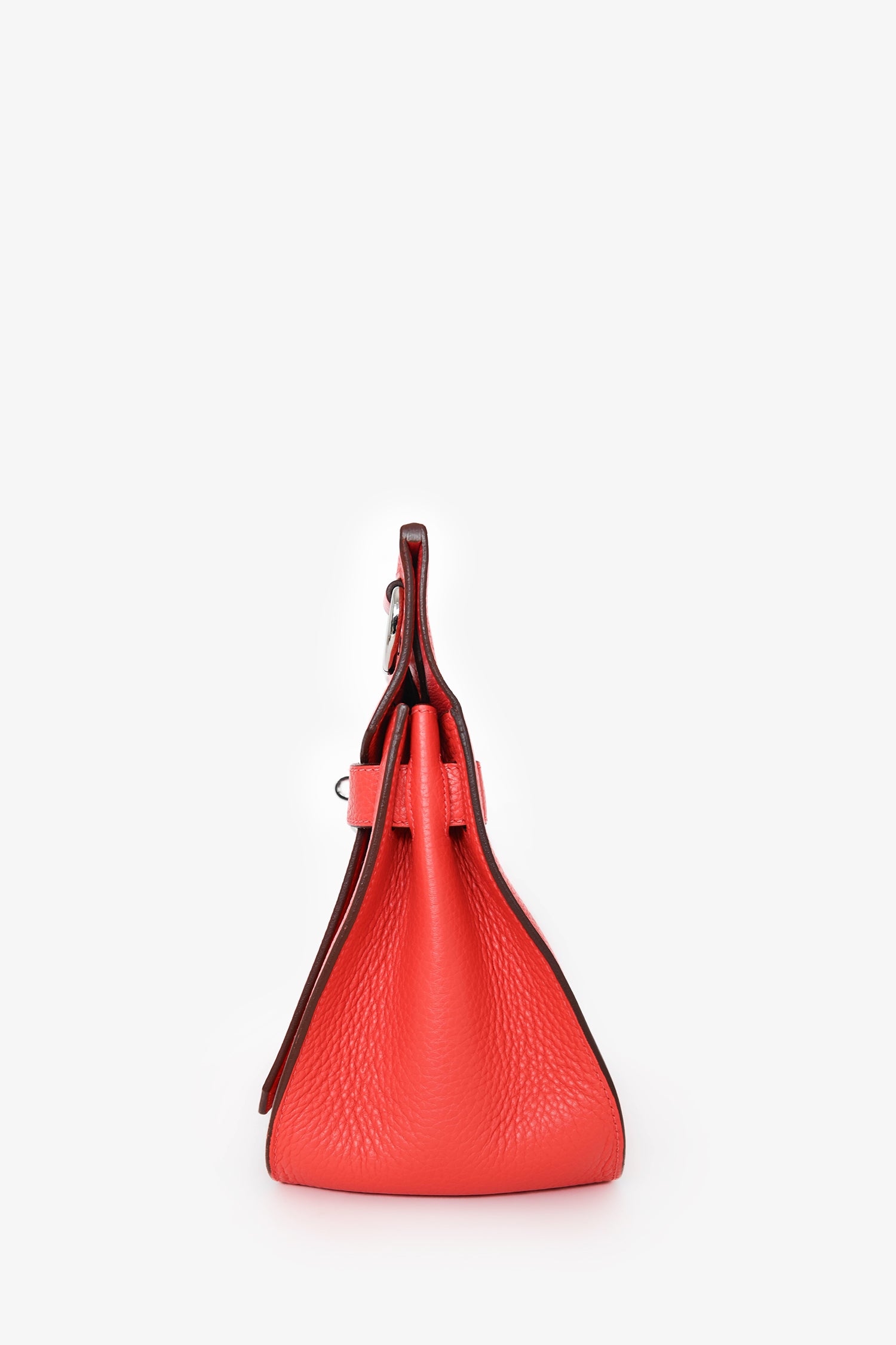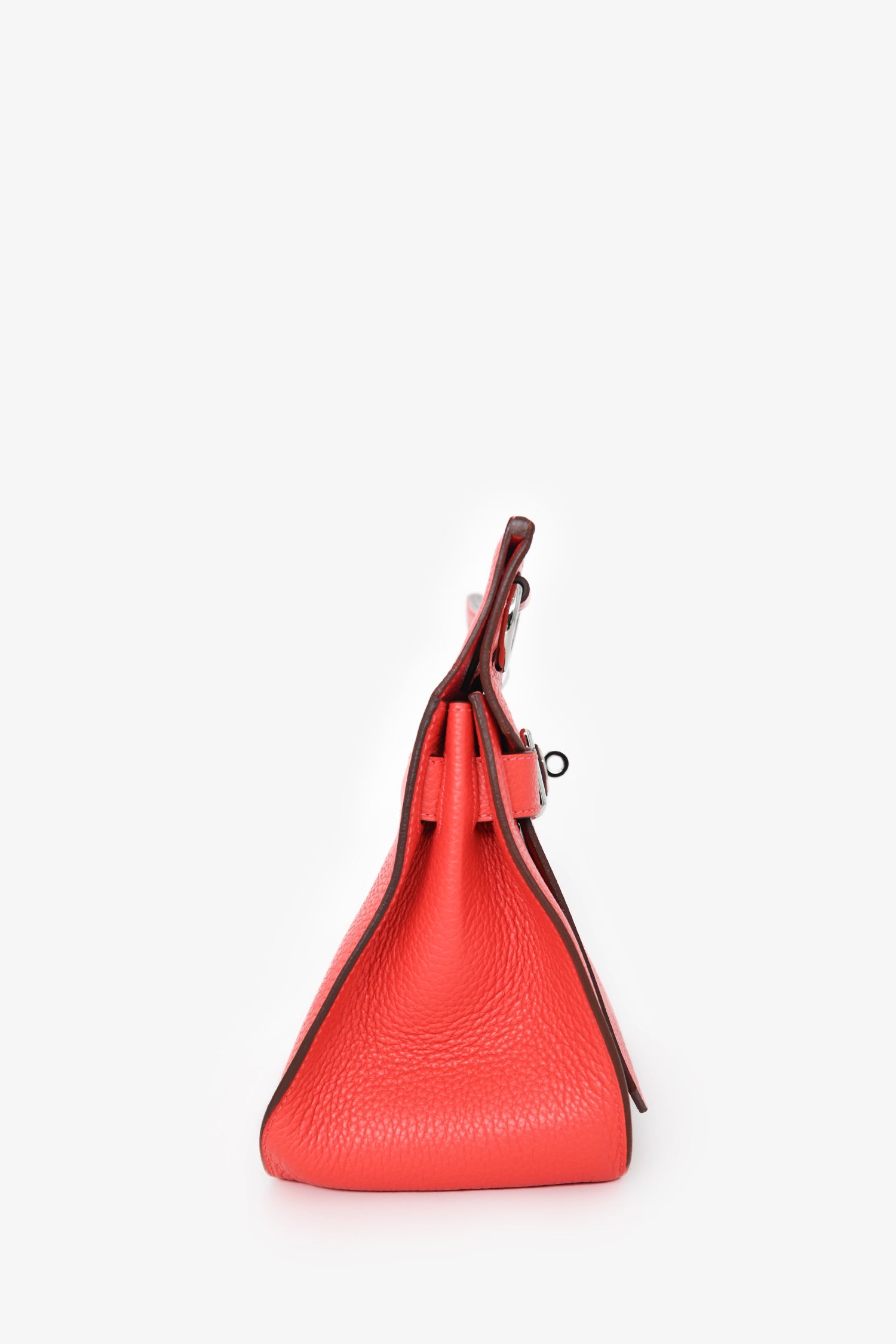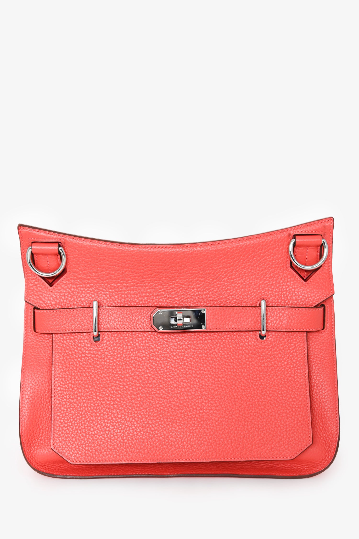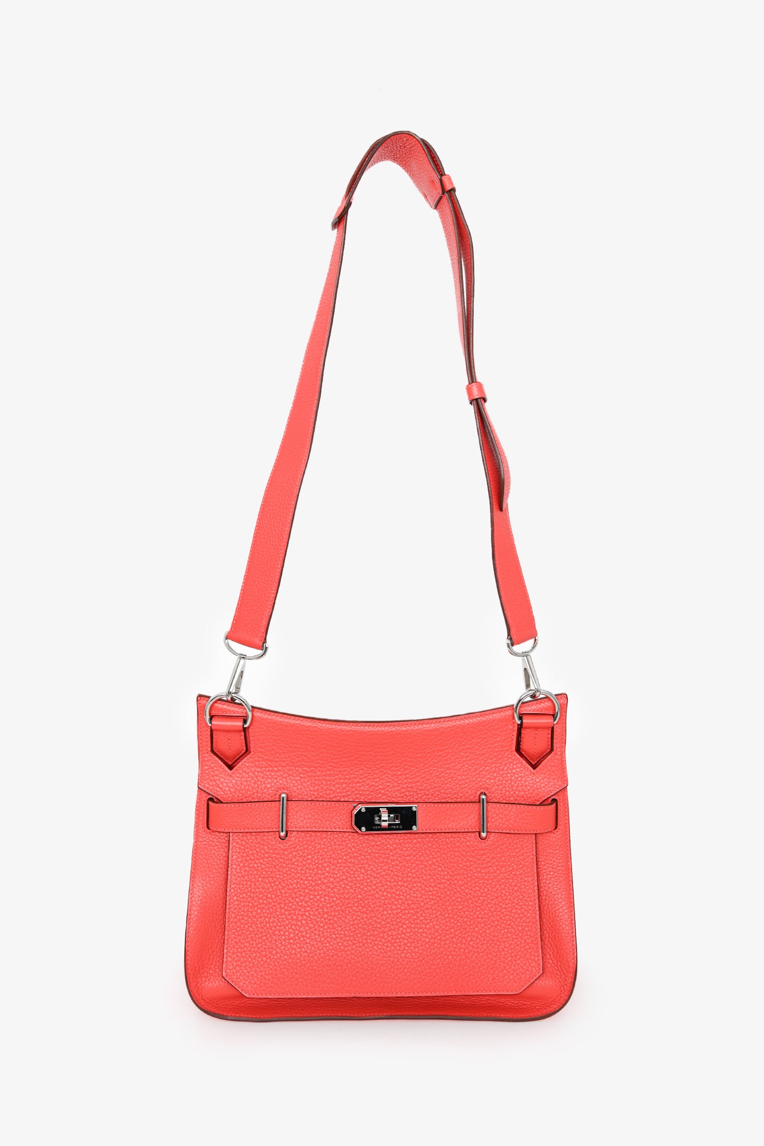 Refresh availabilityHermès 2015 Orange Clemence Leather Jypsiere 31. Front straps with turn-lock closure. Detachable and adjustable strap. 3 interior wall pockets; 2 slip, 1 with zip closure. Palladium-tone hardware. Tonal stitching.