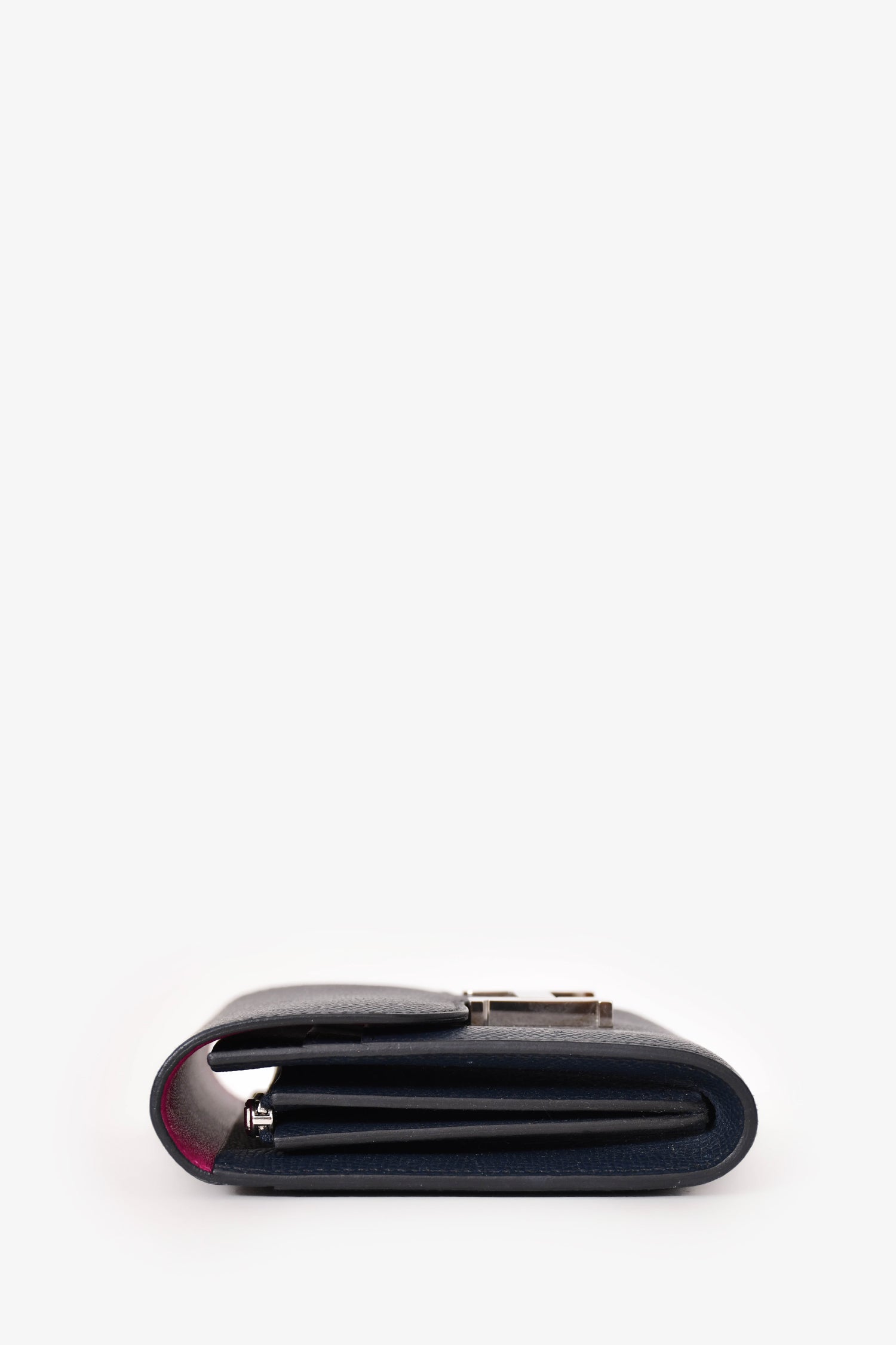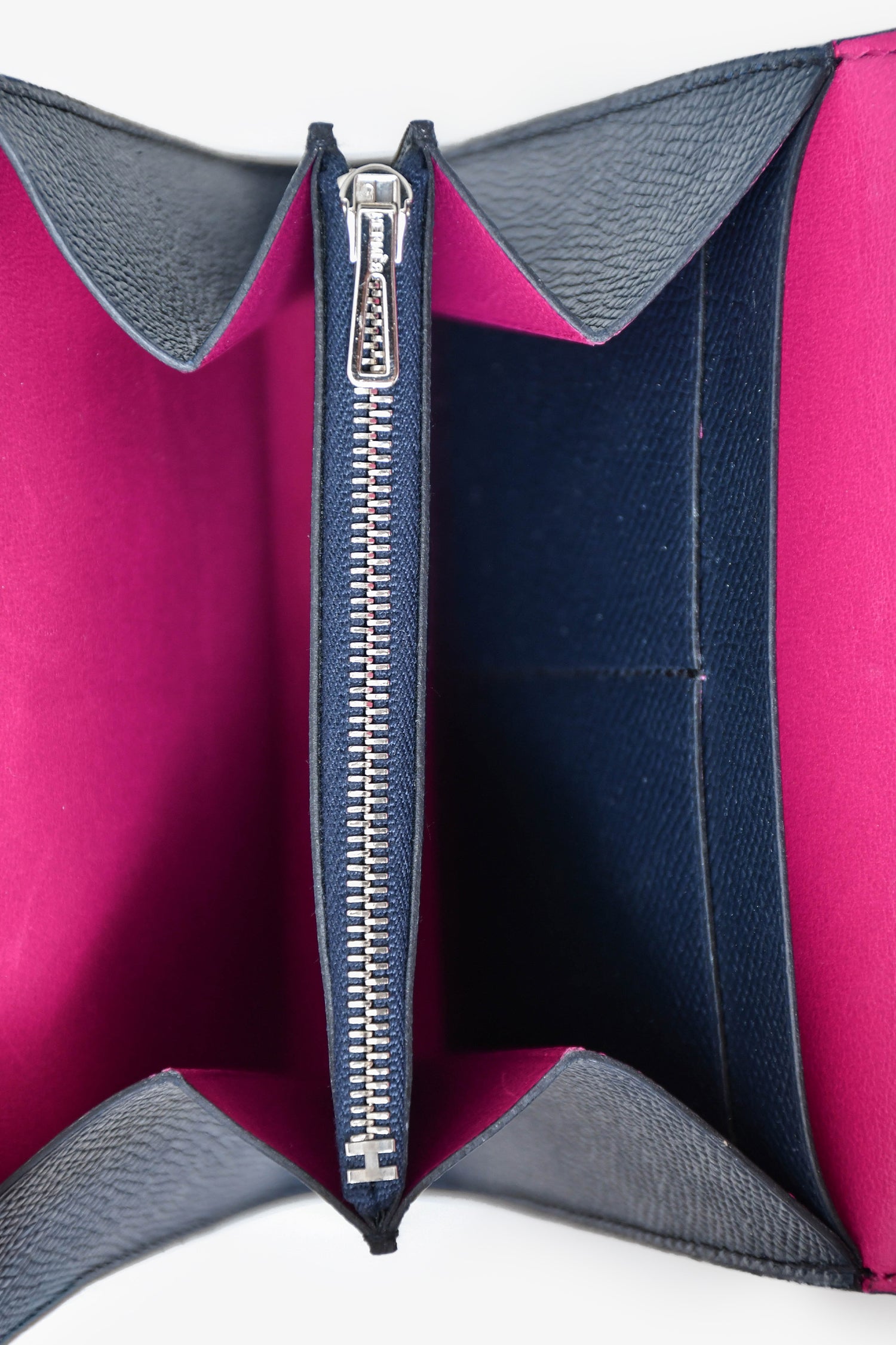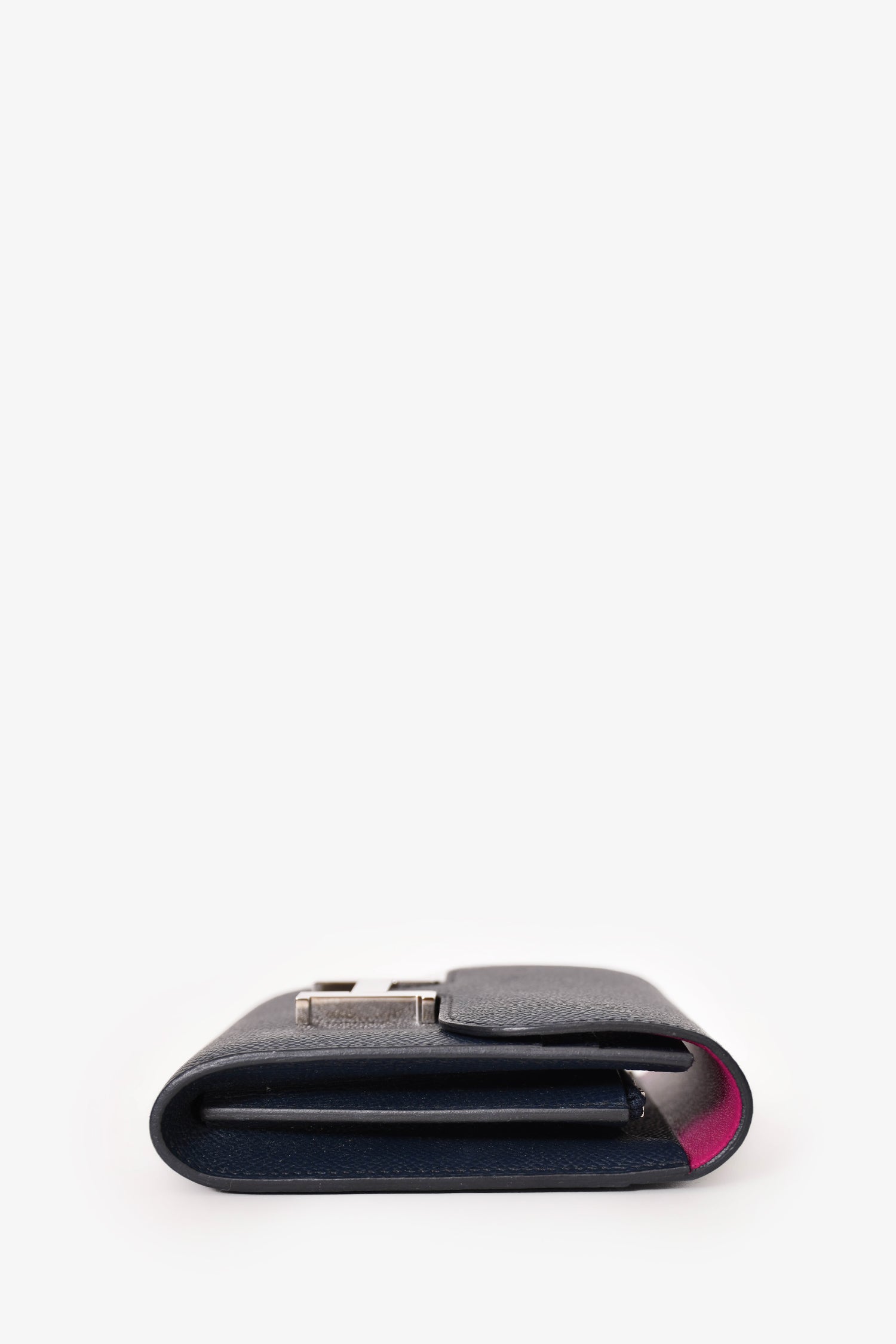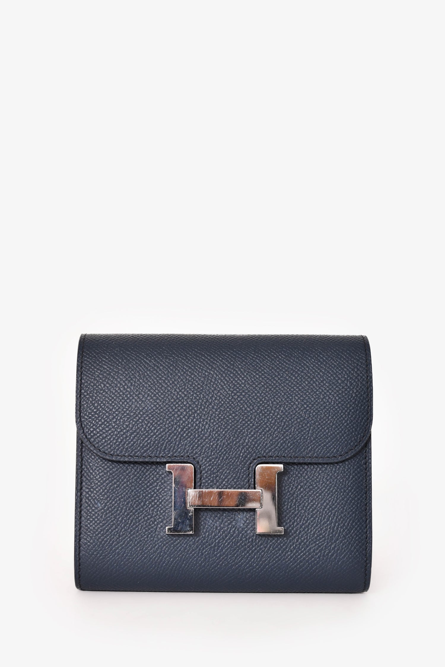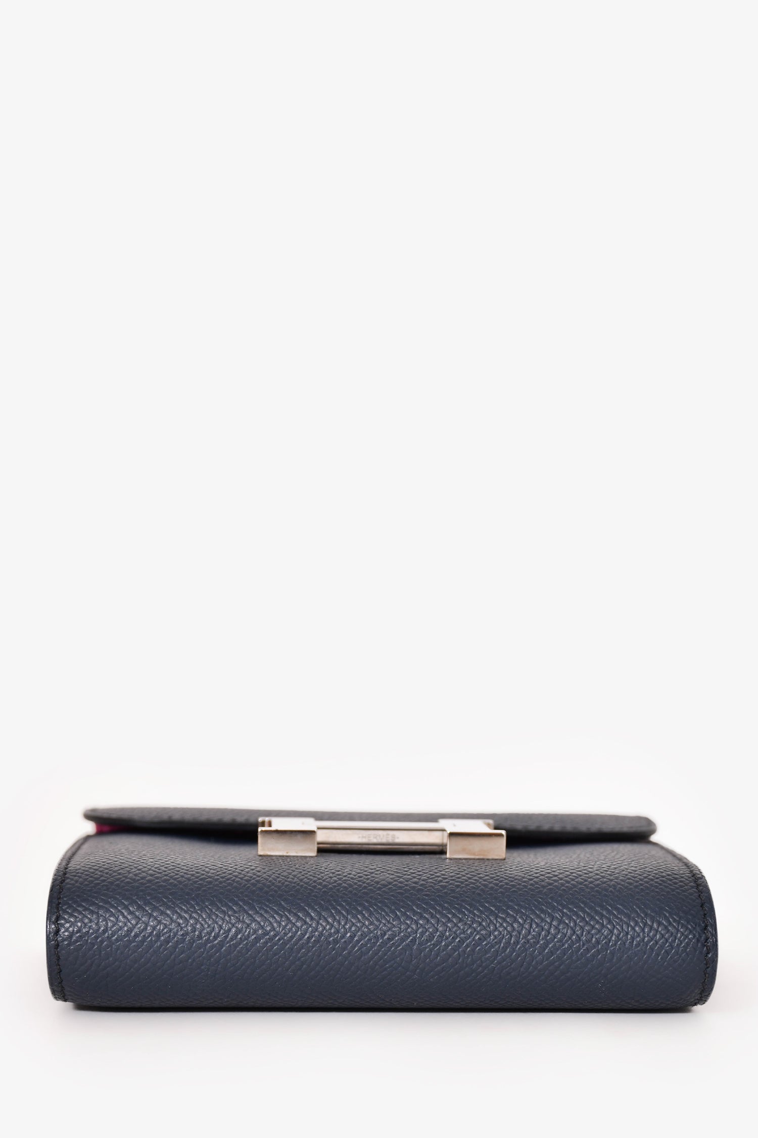 Refresh availabilityHermès 2018 Indigo Blue Epsom Constance Pasant Wallet. Front fold-over flap closure. 7 interior pockets; 6 slip, 1 with zip closure. Single exterior pocket in the back. Palladium hardware. Tonal stitching.