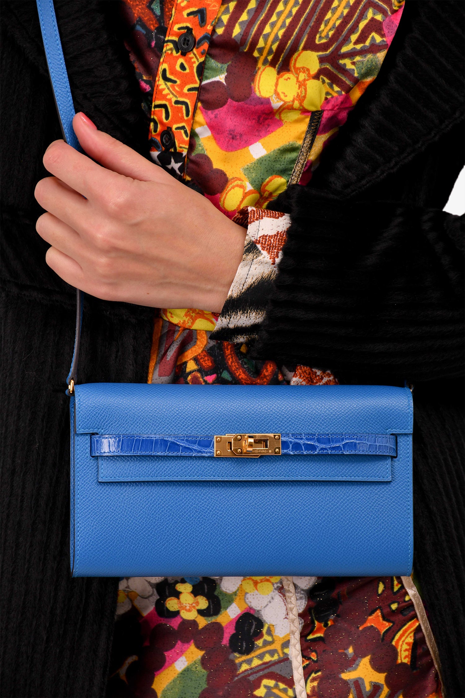 Refresh availabilityHermès 2018 Mykonos Bleu Zellige Epsom Kelly To Go Alligator Touch. 4 interior wall-slip pockets. 1 interior wide-zip pocket. Removable cross-body strap. Gold-tone hardware. Tonal stitching.