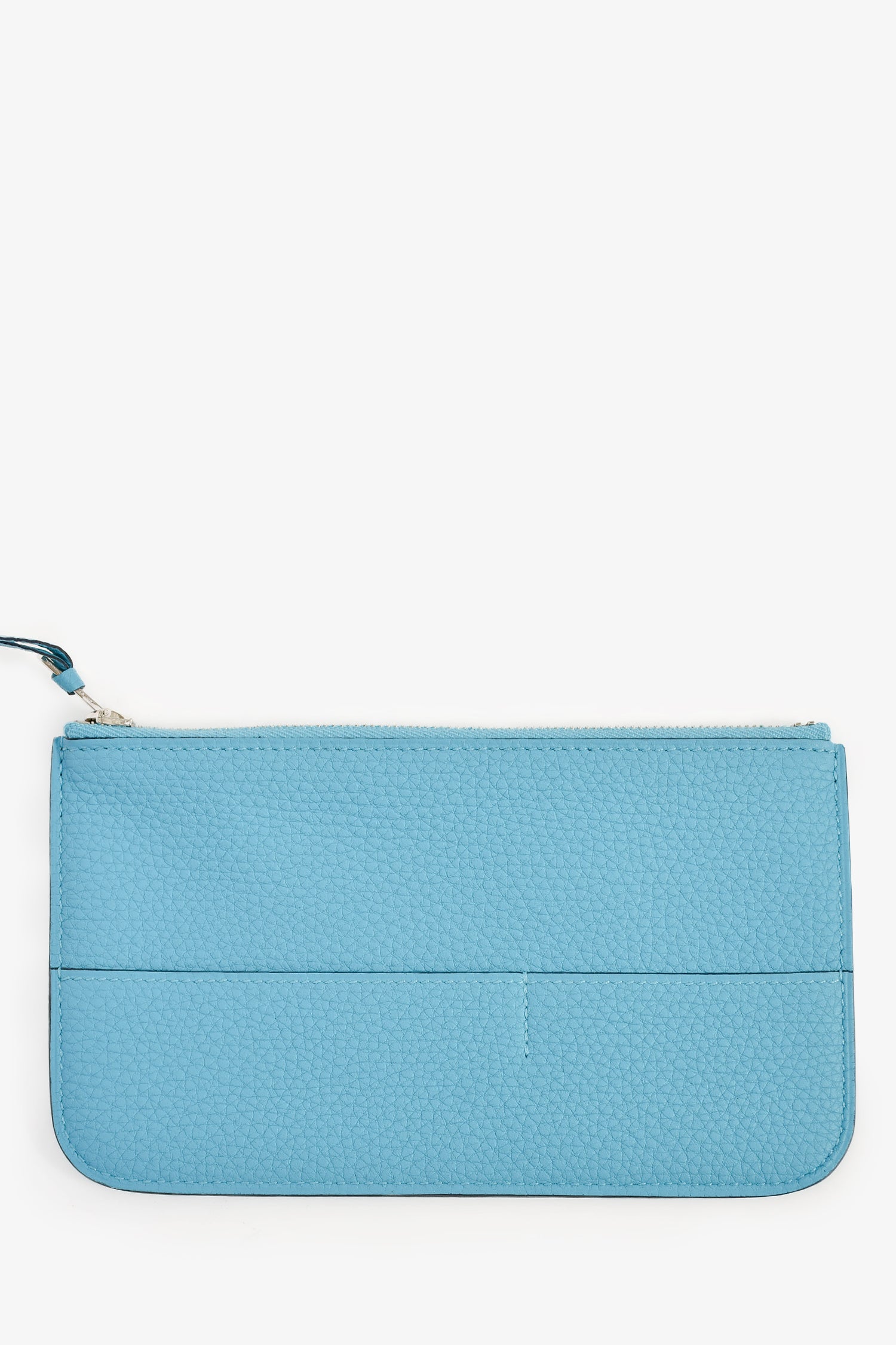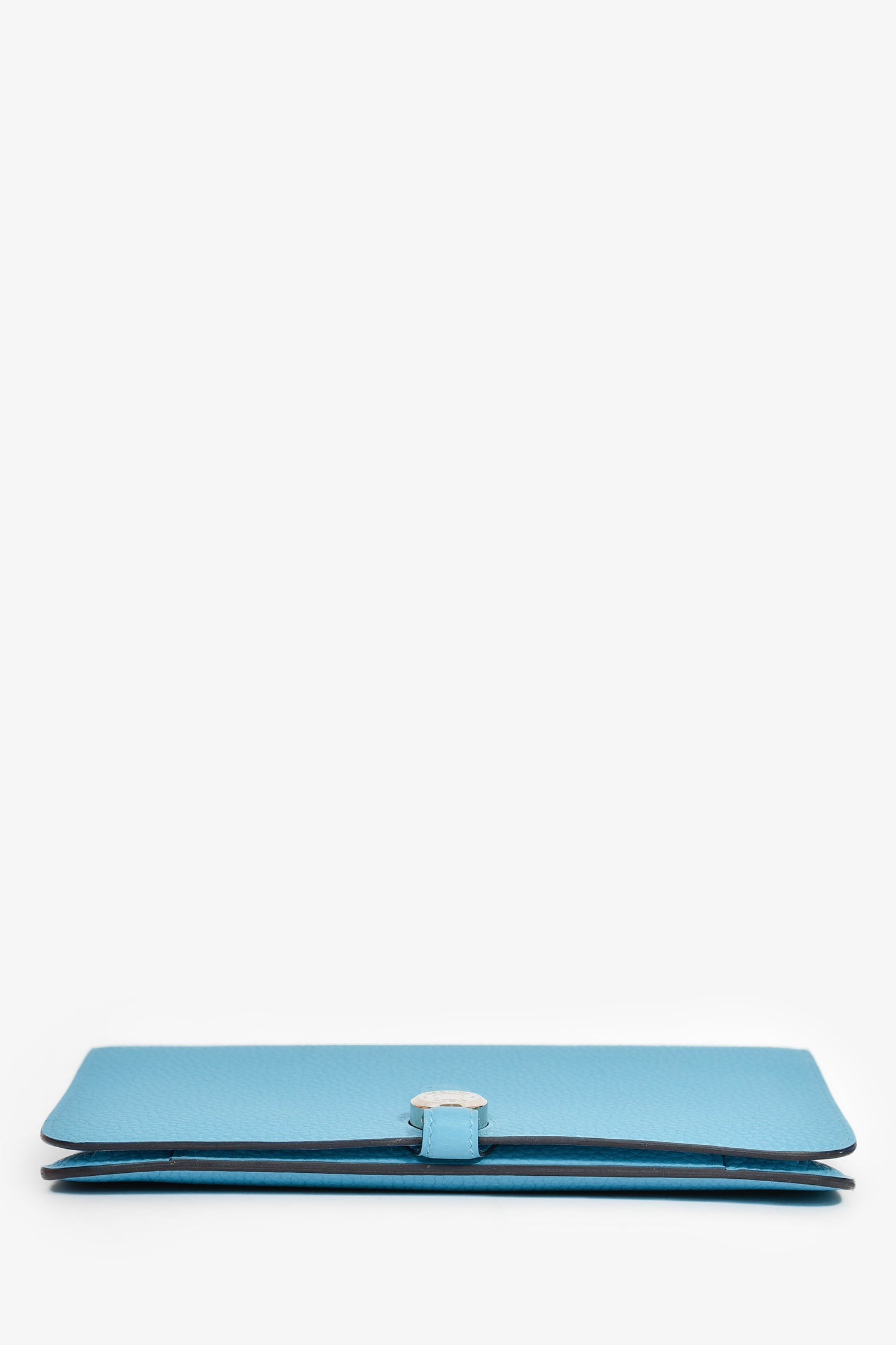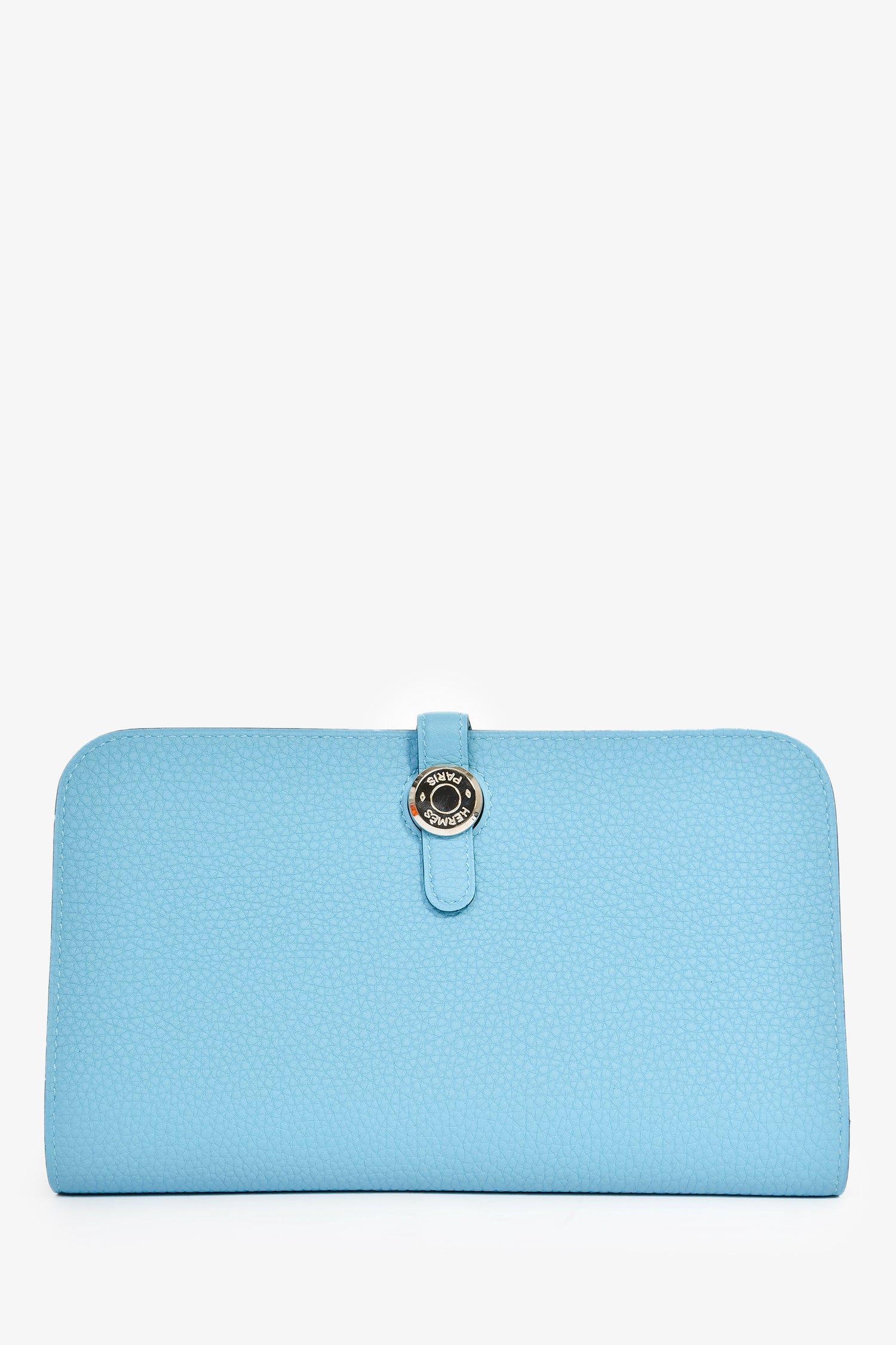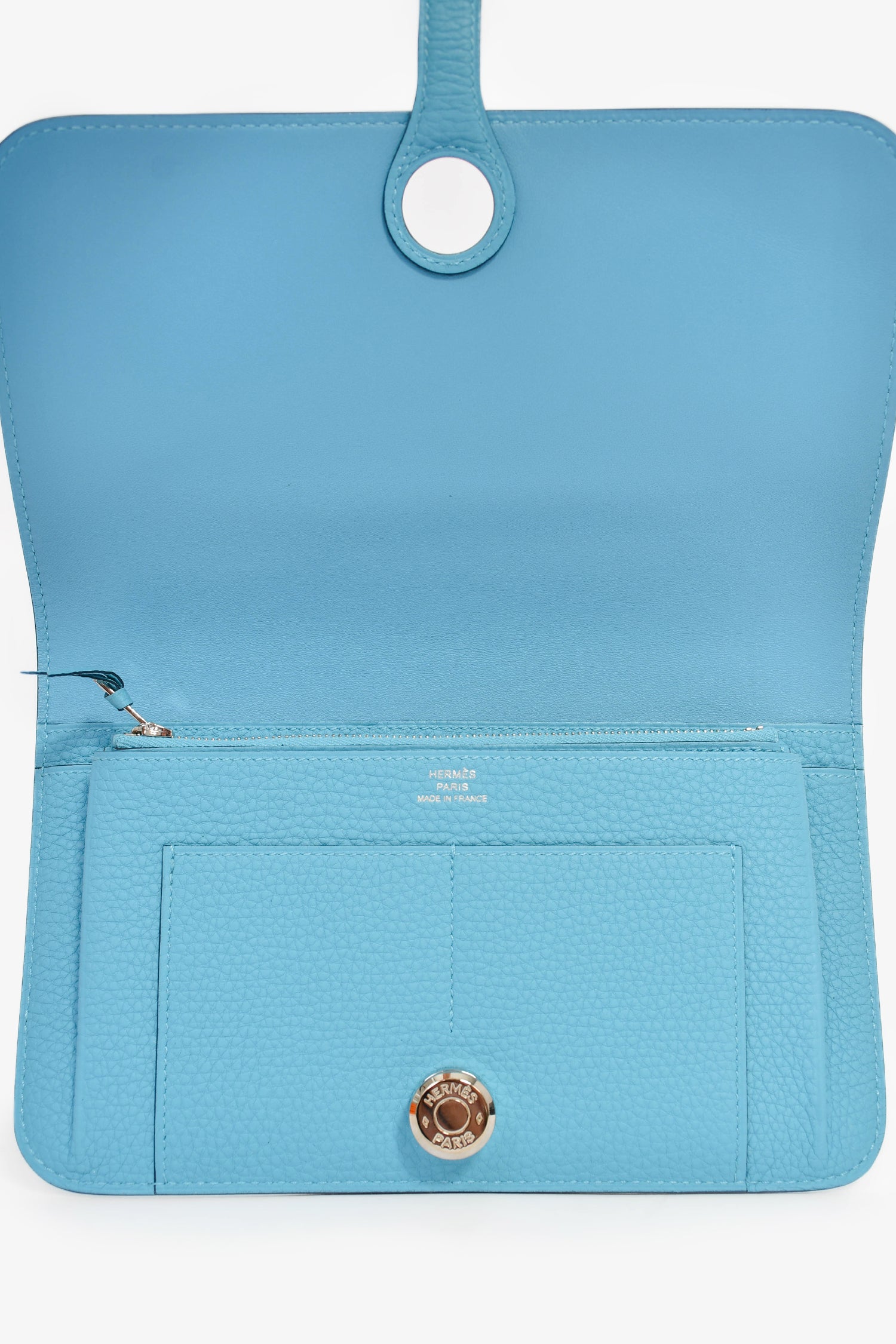 Refresh availabilityHermès 2019 Blue Leather 'Dogon' Long Wallet. Bi-fold with pull-through closure. Two interior compartments with five wall slip pockets. A detachable zip pouch with two exterior slip pockets. Leather lining. Palladium-tone hardware.