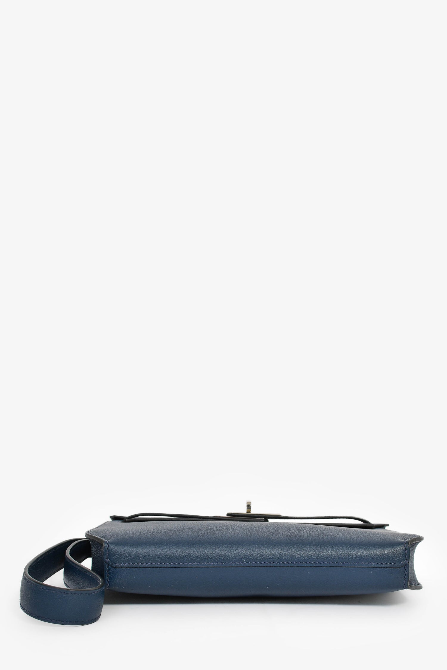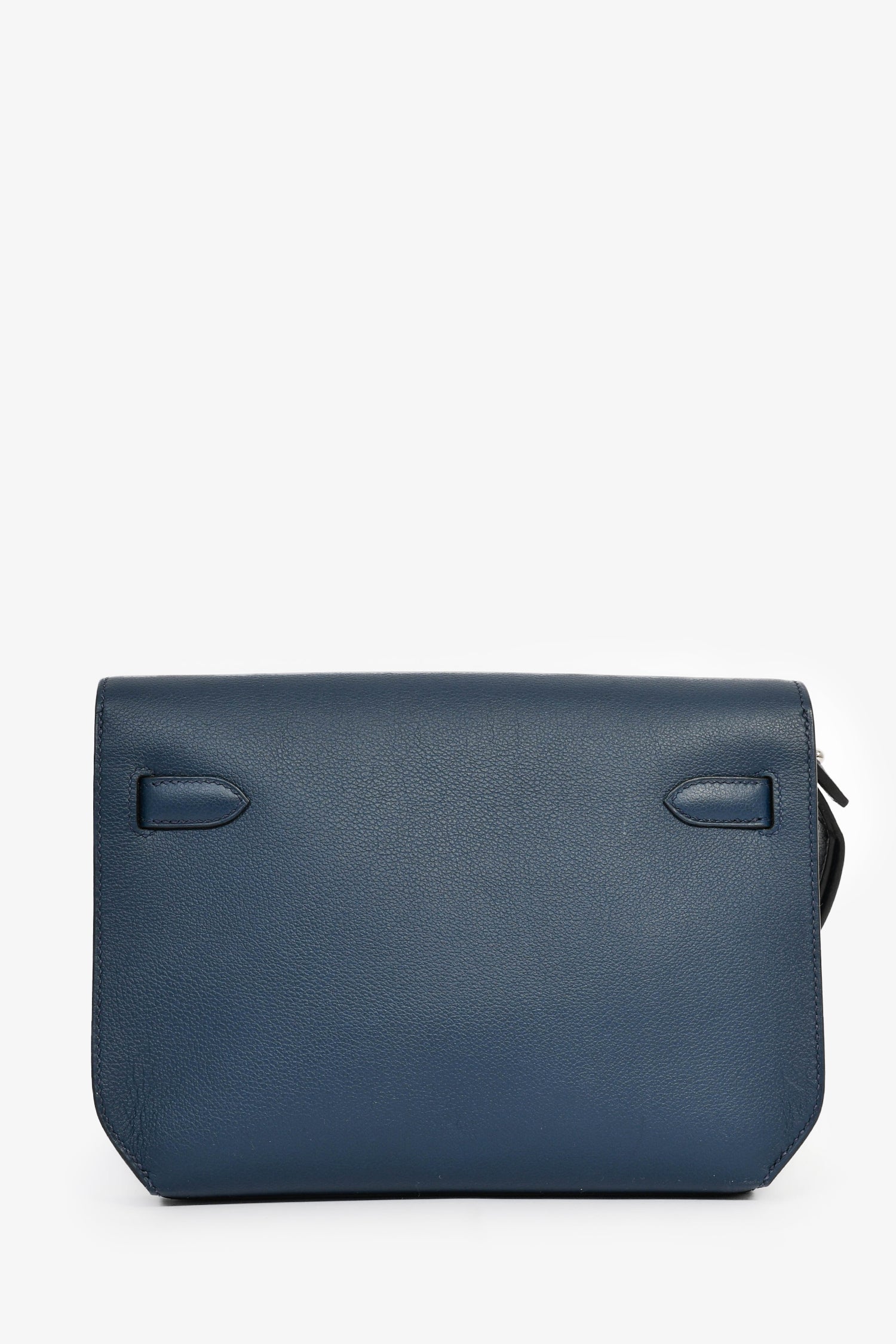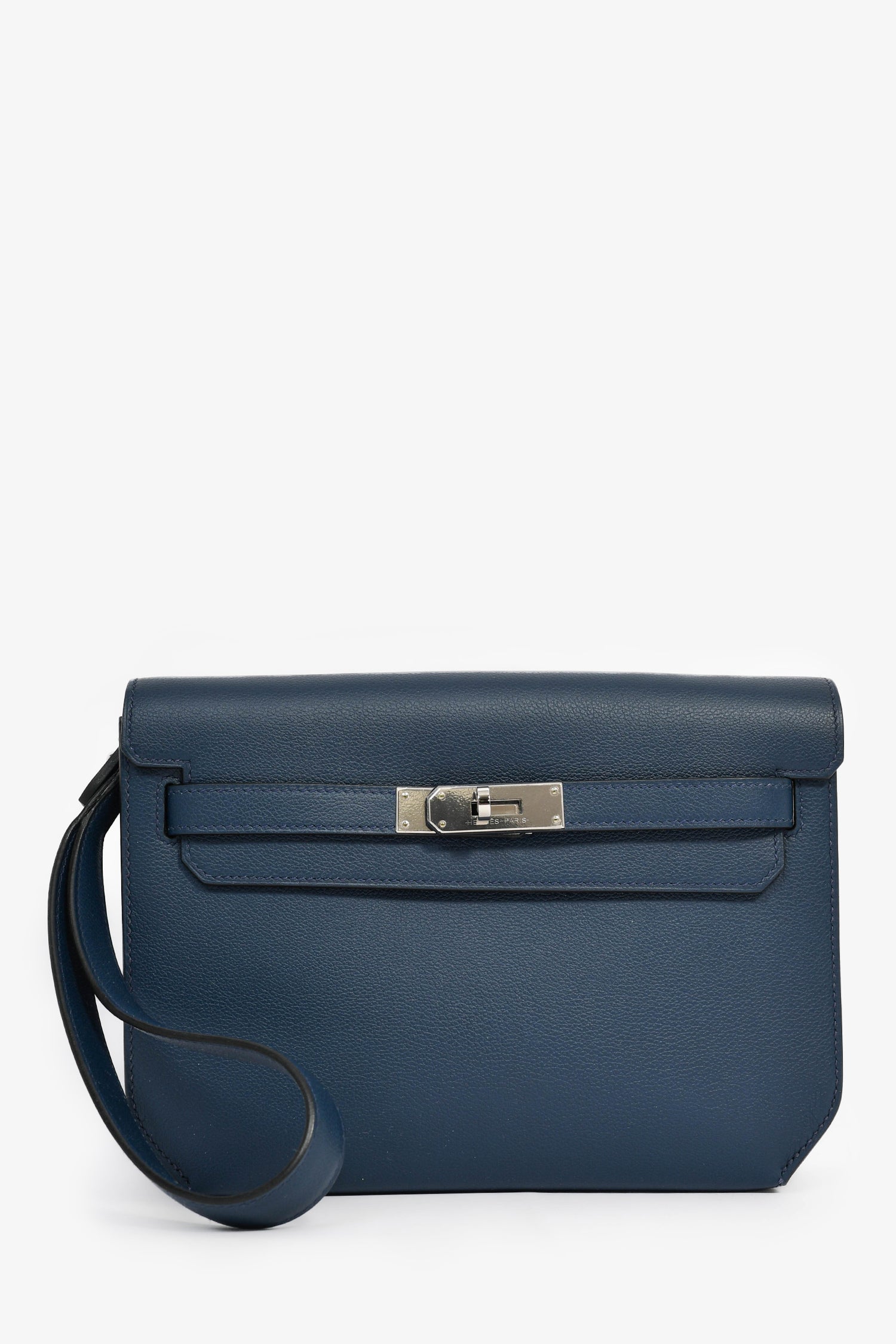 Refresh availabilityHermès 2019 Navy Blue Epsom Leather Kelly Dépêches 25. Front fold-over straps with turn-lock closure. Front slip pocket. Open interior. Silver-tone hardware. Wrist strap.