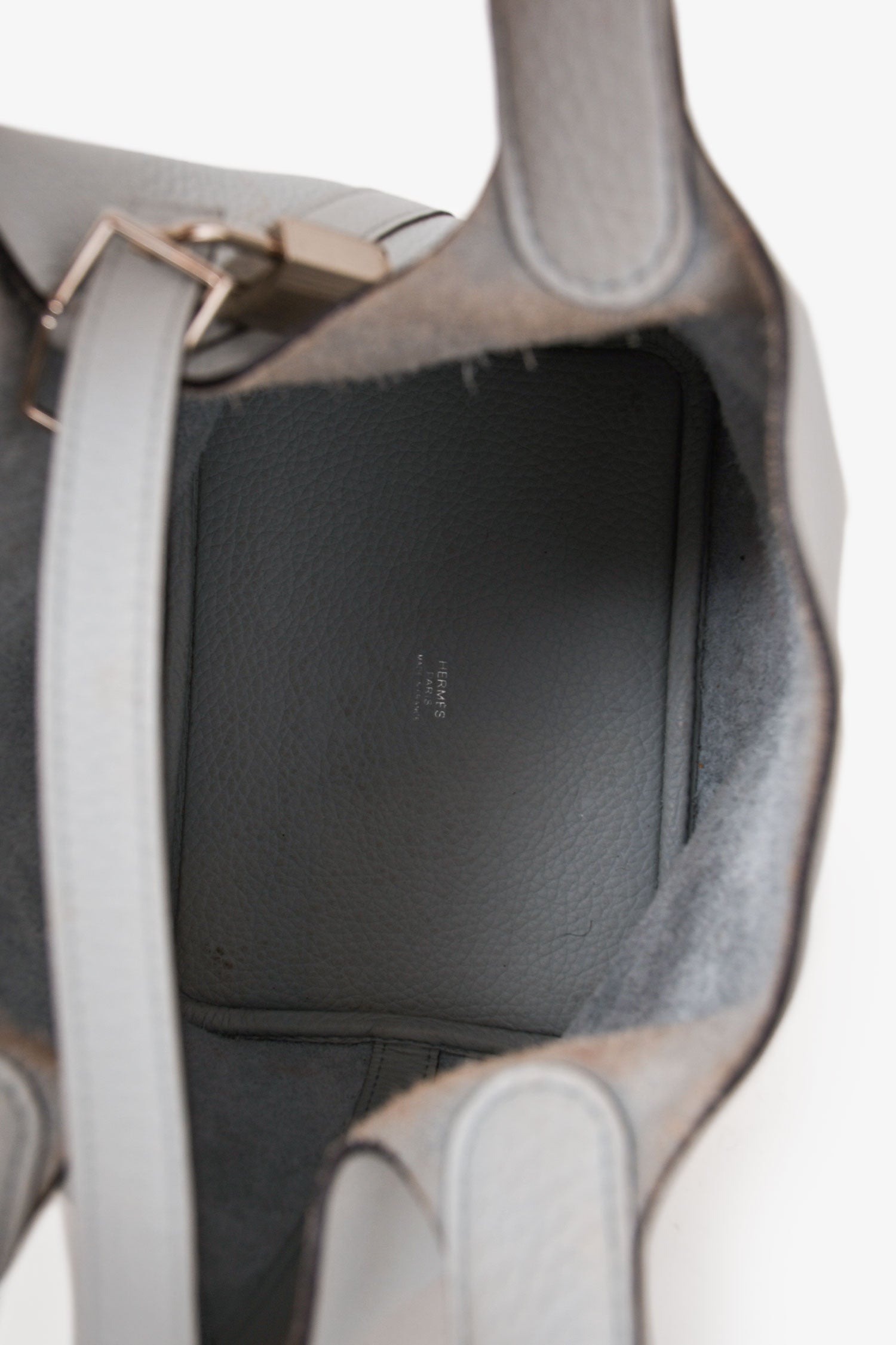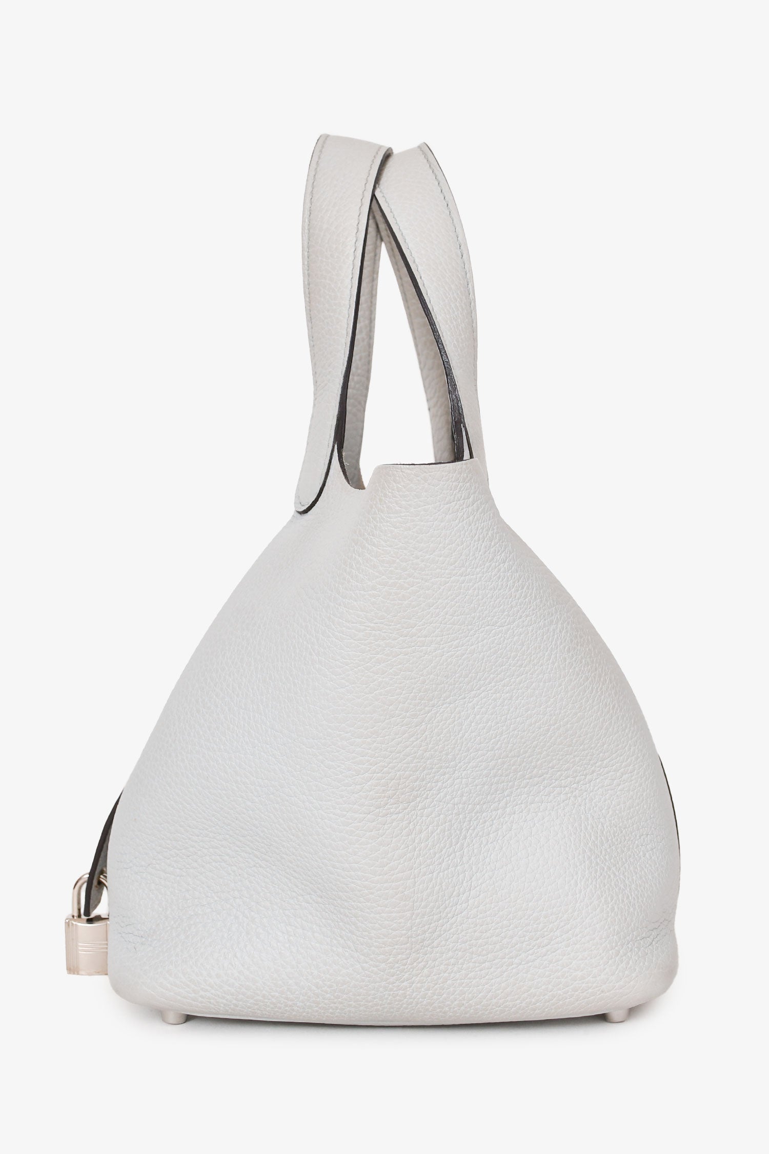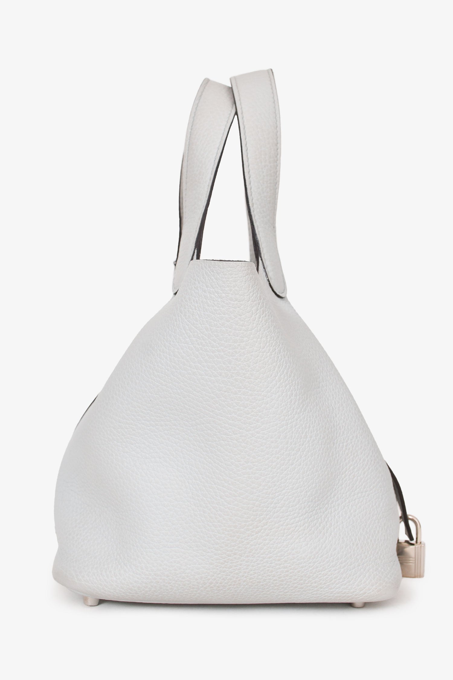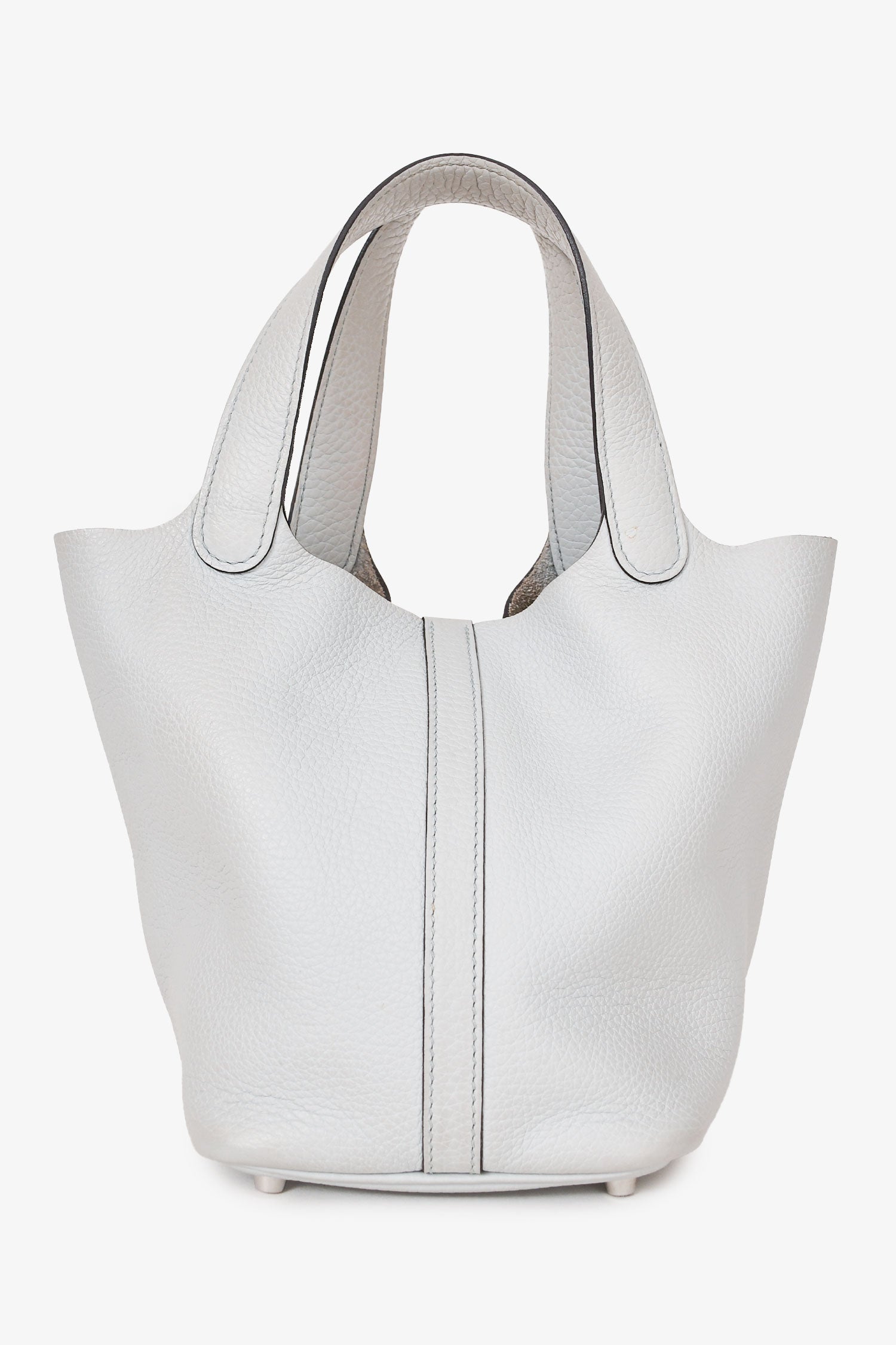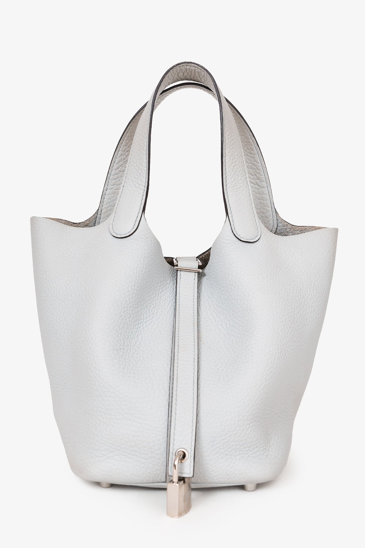 Refresh availabilityHermès 2021 Pale Blue Clemence Picotin 18. Silver-tone hardware. Lined suede interior. Attached lock. Comes with keys. Coated trimming. Two flat handles. Tonal stitching.