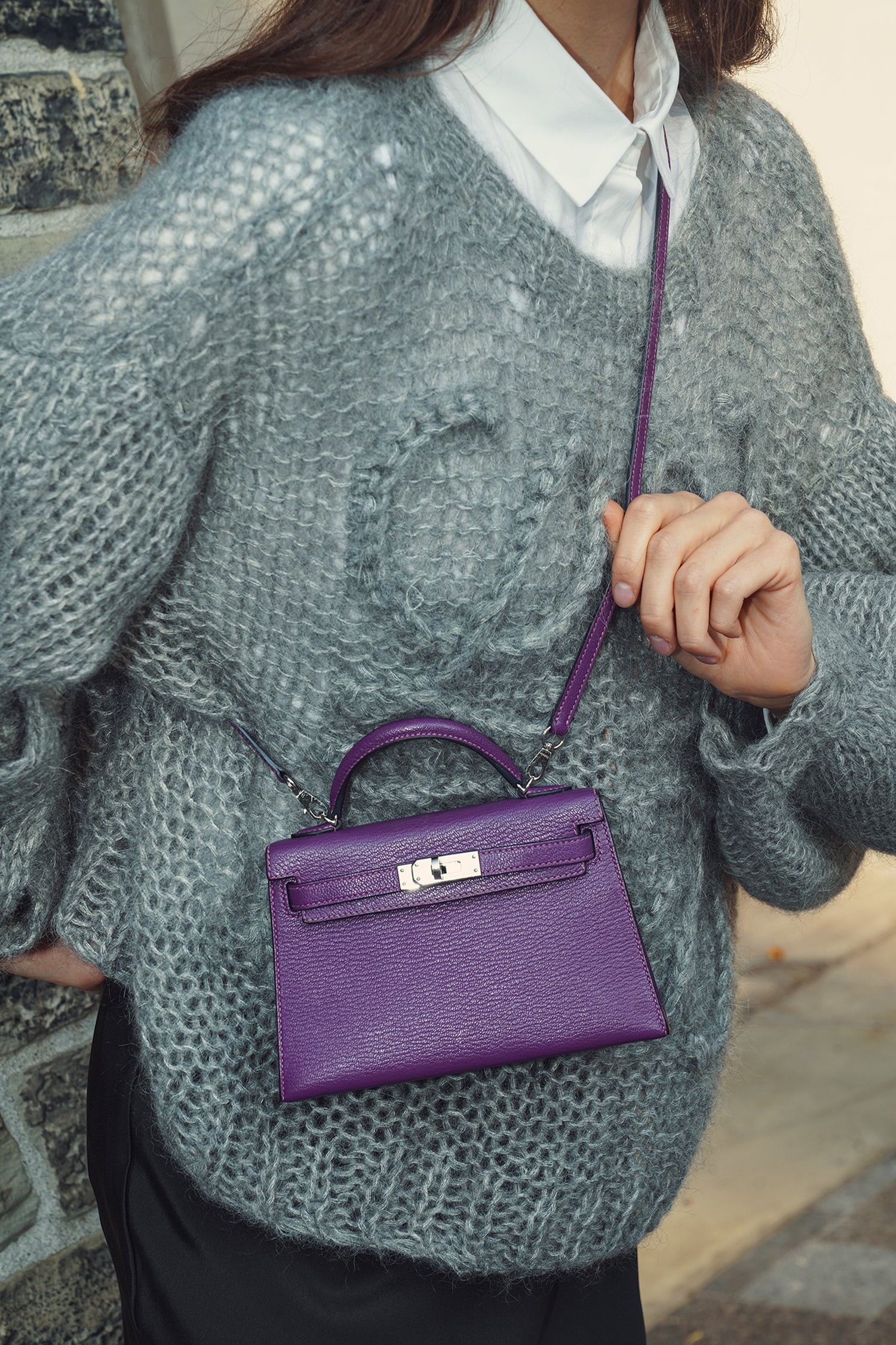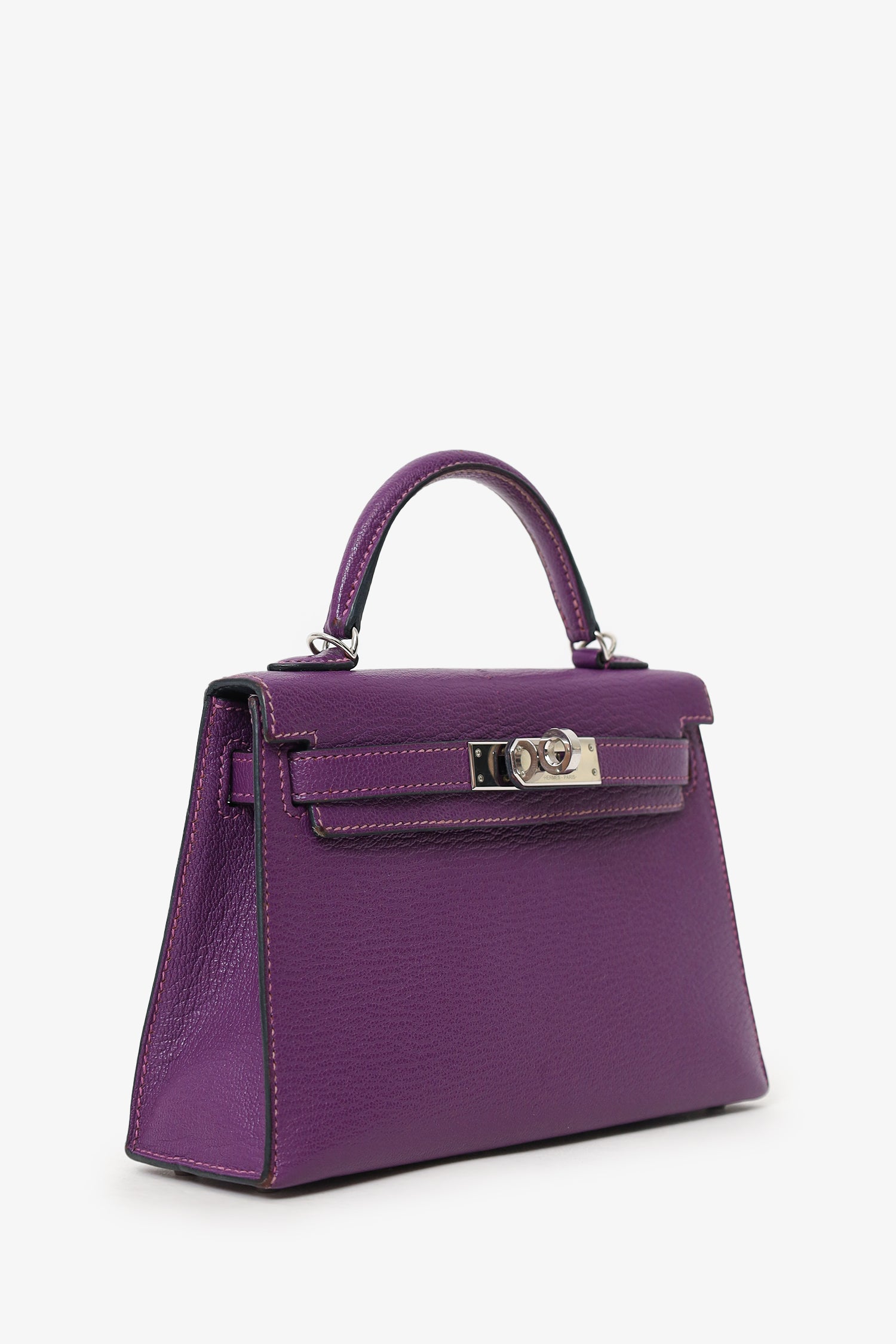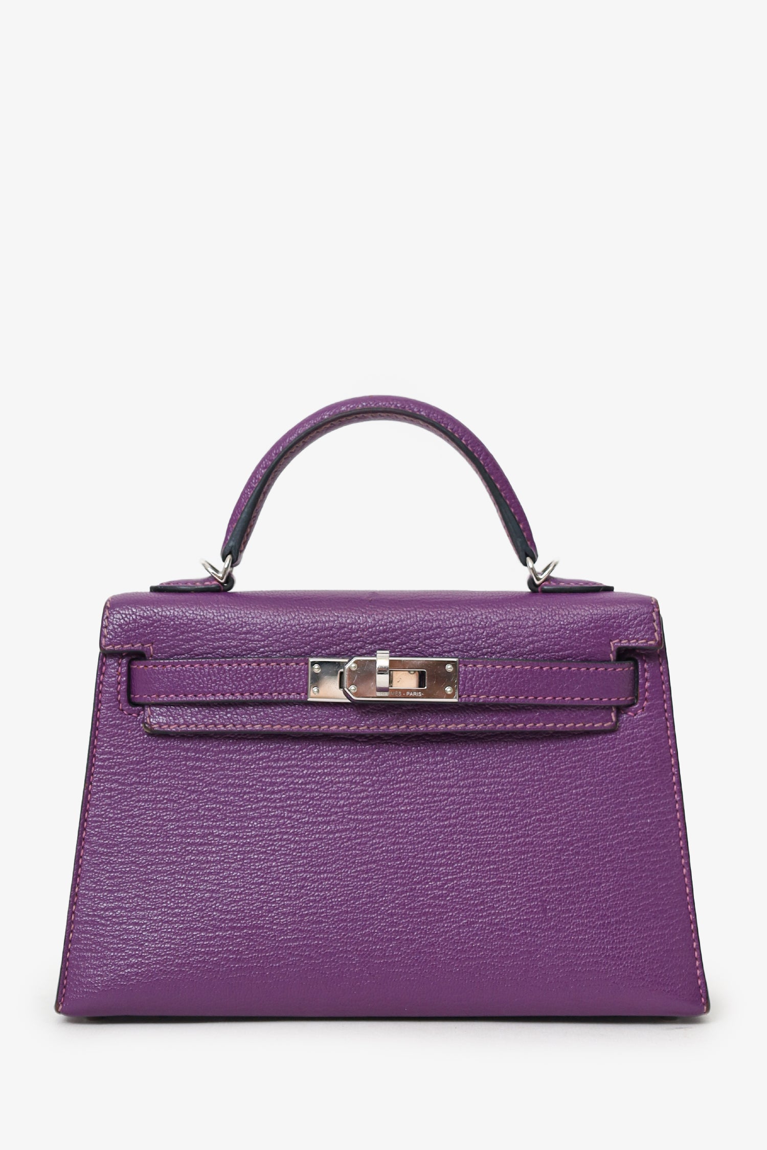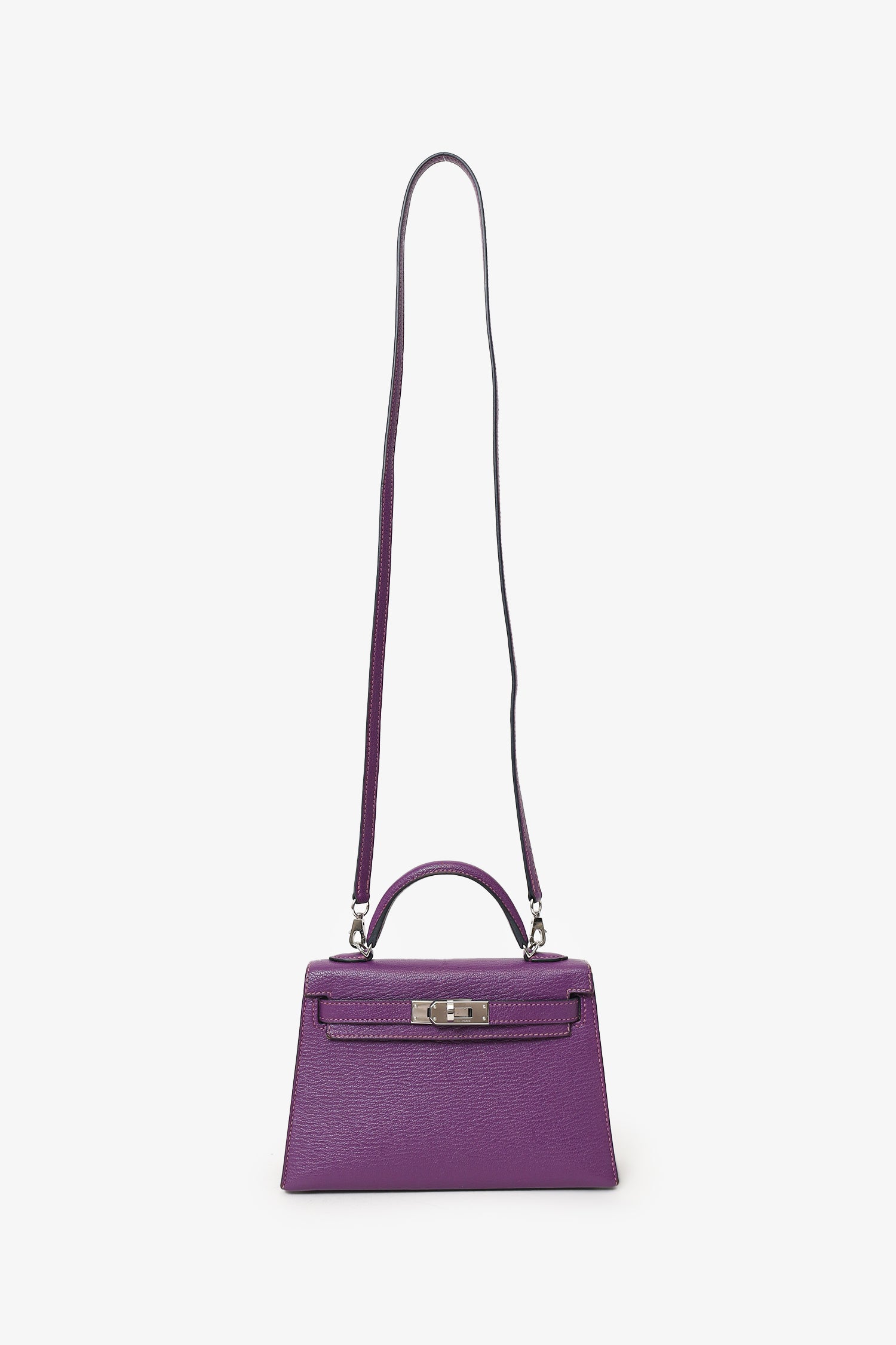 Refresh availabilityHermès 2021 Violet/Blue Marine Mysore Chevre Leather Mini Kelly PHW With Strap. Front pull-through straps with turn-lock closure. Top handle. Removable strap. Protective base studs. Leather-lined interior. Single interior slip pocket. Palladium-tone hardware.
