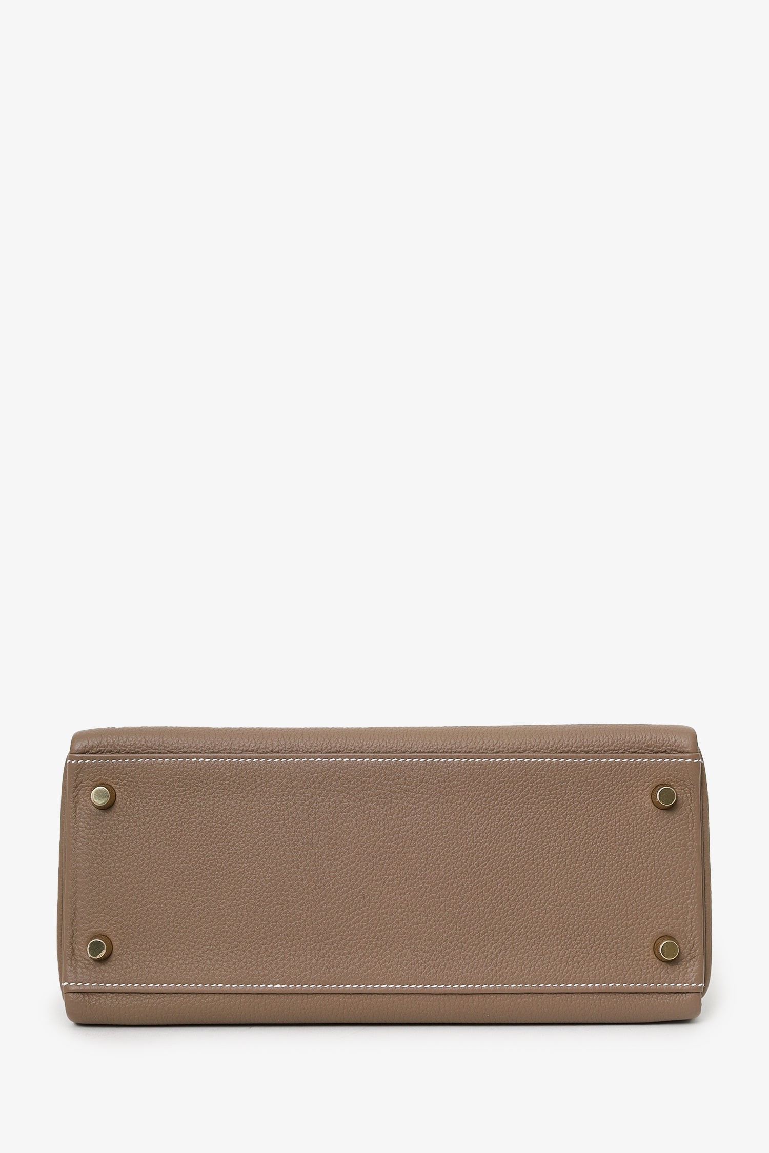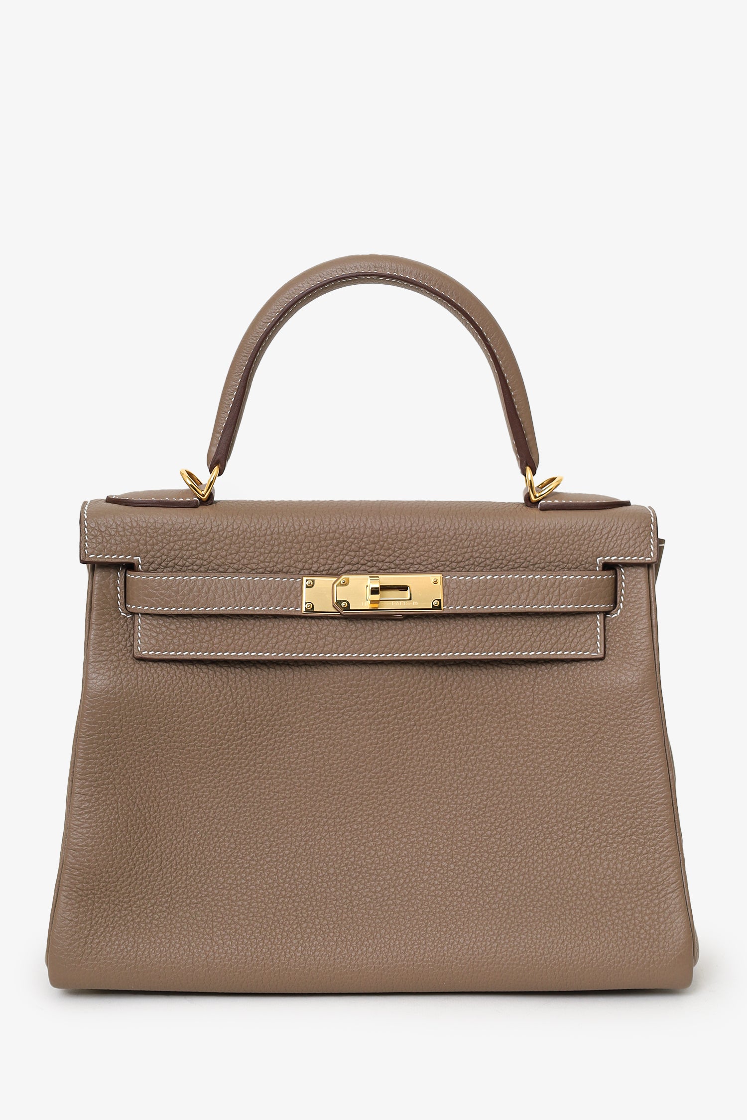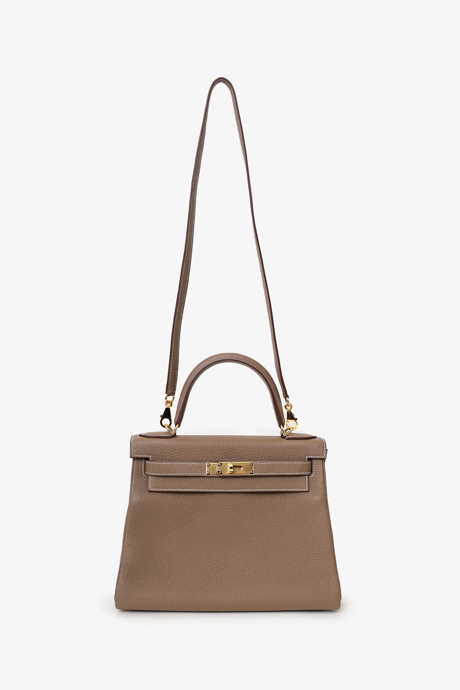 Refresh availabilityHermès 2022 Etoupe Togo Leather Kelly II Retourne 28 with Strap. Front fold-over flap with turn-lock closure. Top handle. Removable strap with lobster clasp closure. Leather interior. 3 interior pockets; 2 wall slip and 1 zip. Protective stubs on bottom. Includes removable clochette. Gold-tone hardware. Contrast stitching.