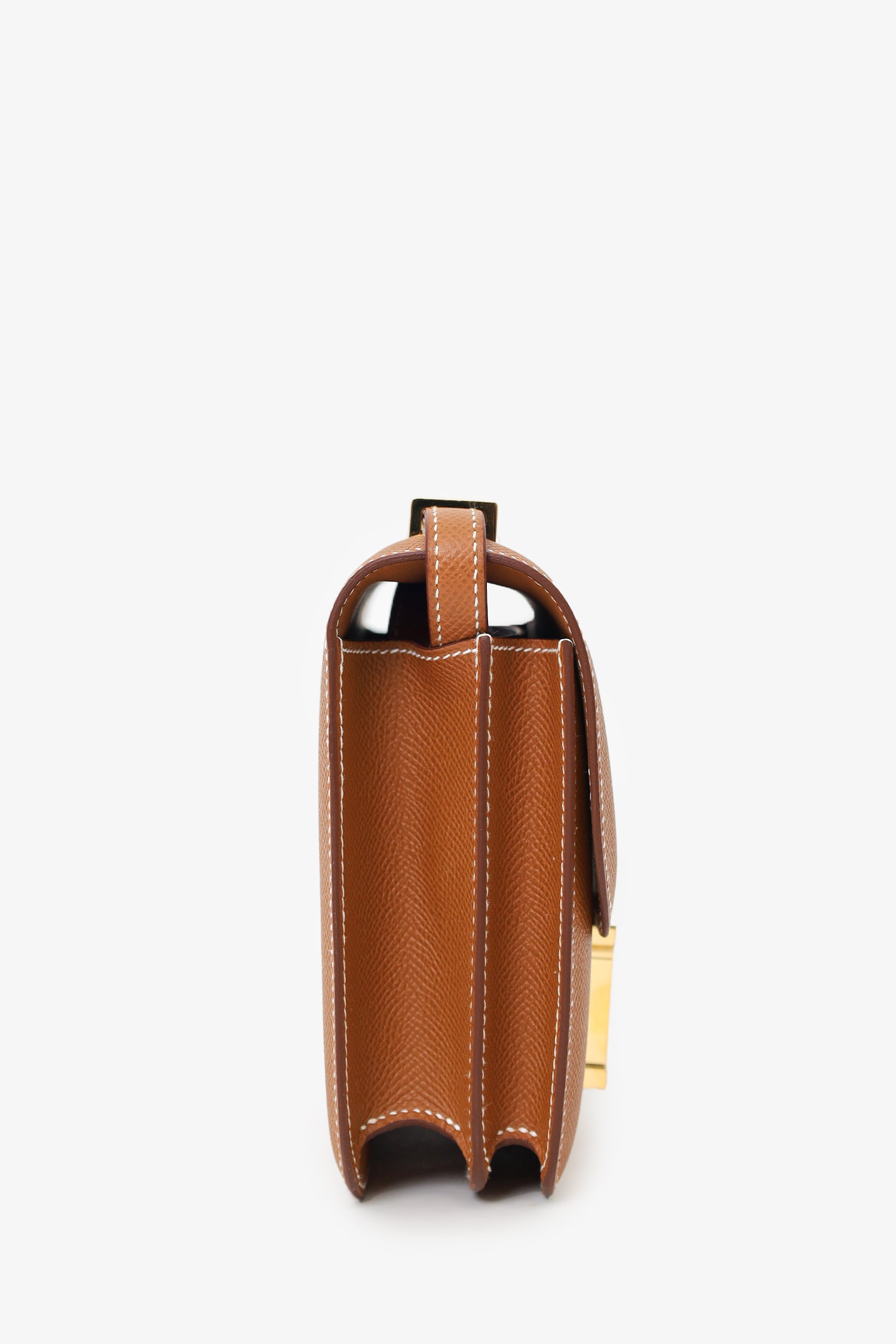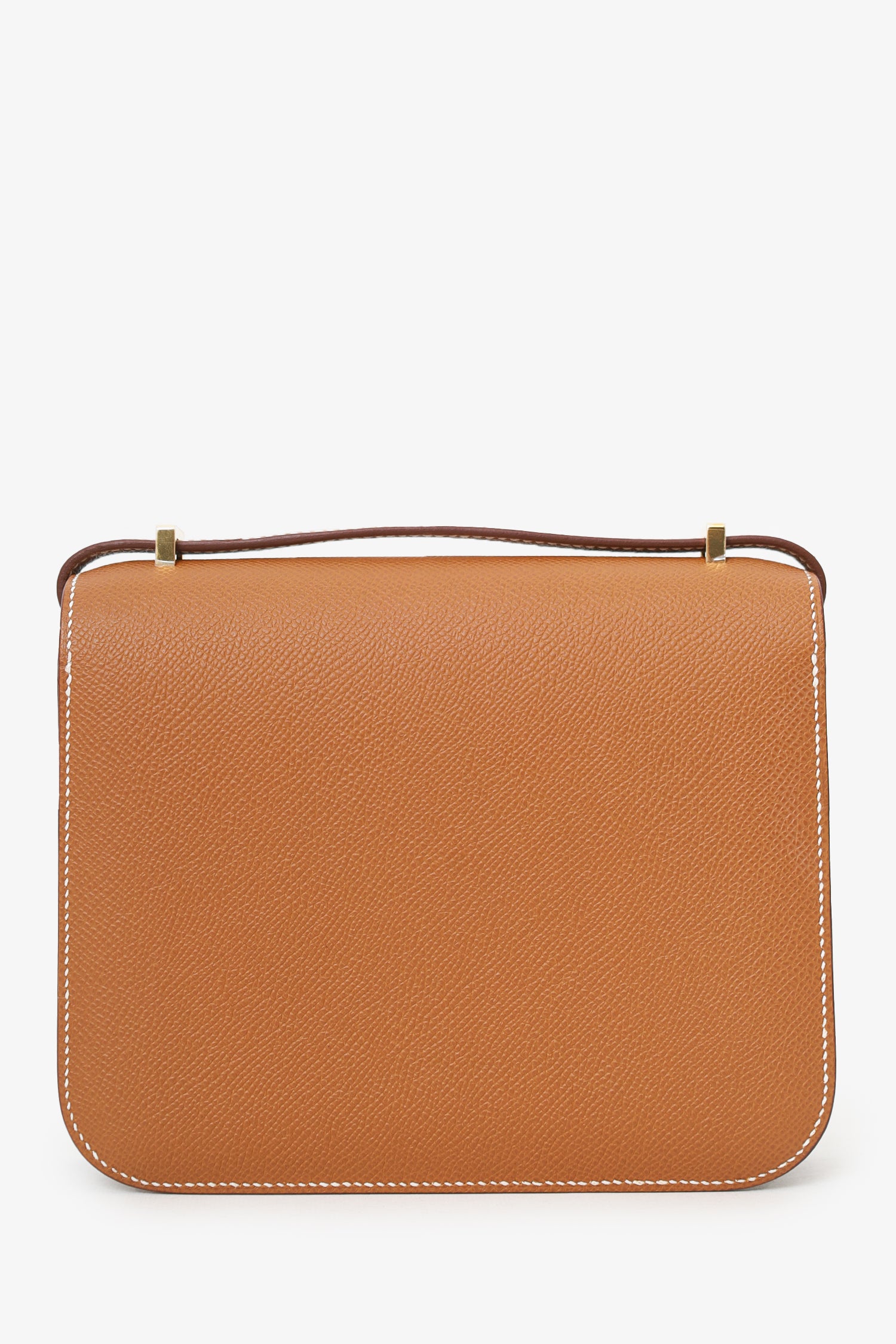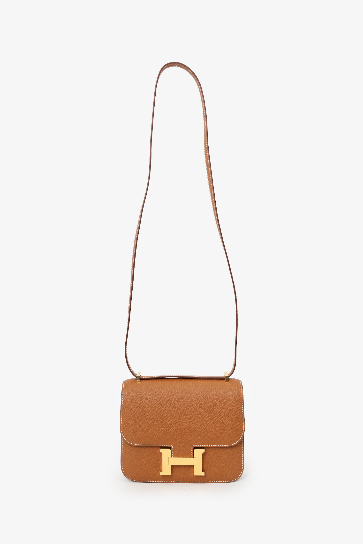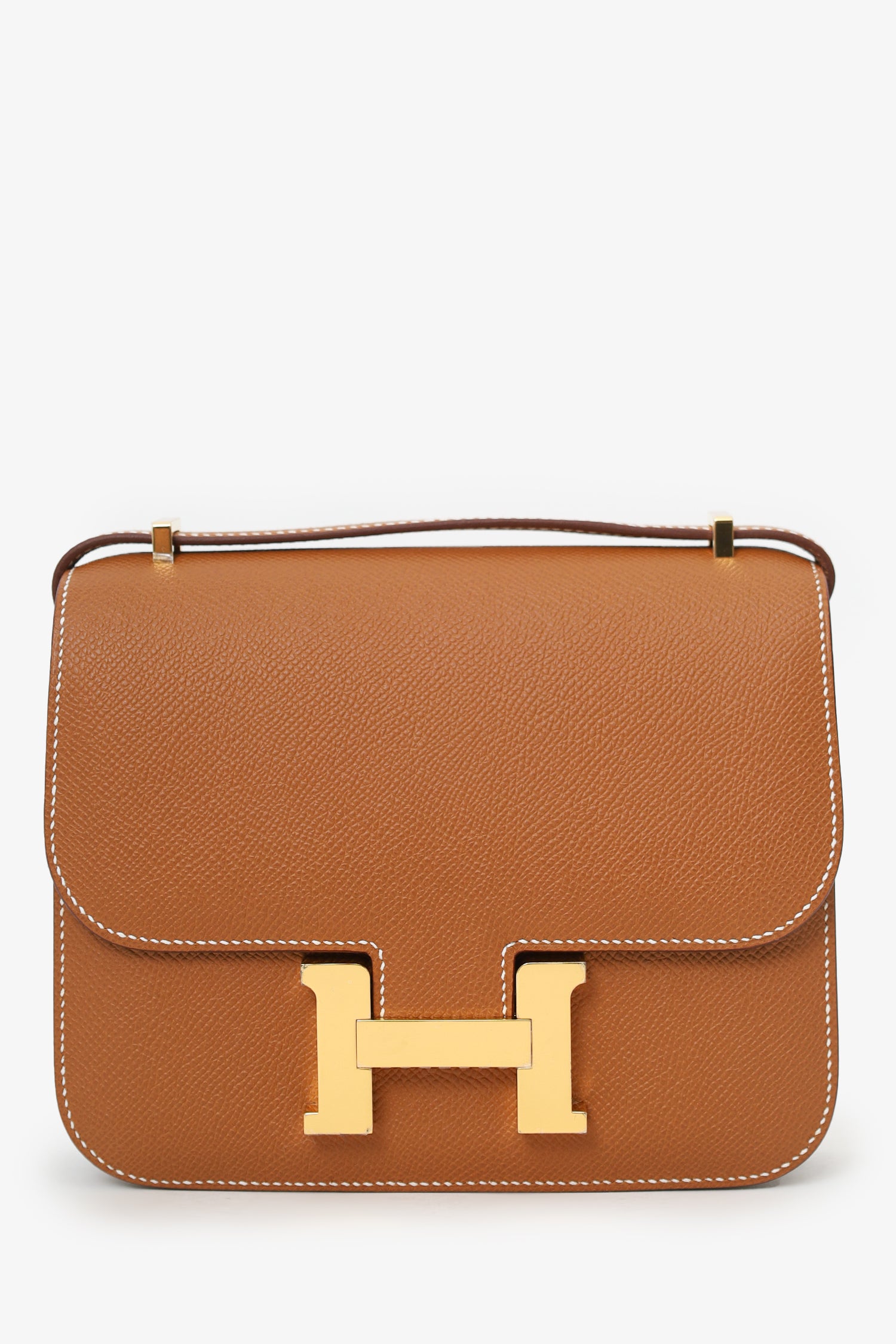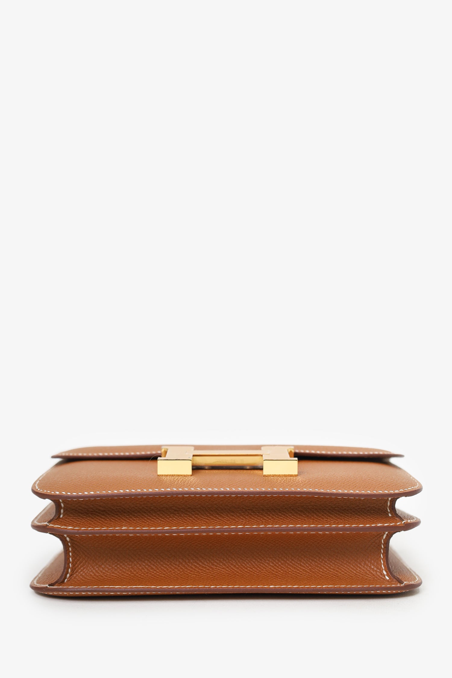 Refresh availabilityHermès 2023 Gold Epsom Leather Constance Mini 18. Front fold-over flap with pull-release closure. Single crossbody strap. Two compartments; 1 with 2 front wall slip pocket, 1 with rear wall slip pocket. Leather lining. Gold-tone hardware. Contrast stitching. Gold-tone hardware. Tonal stitching.