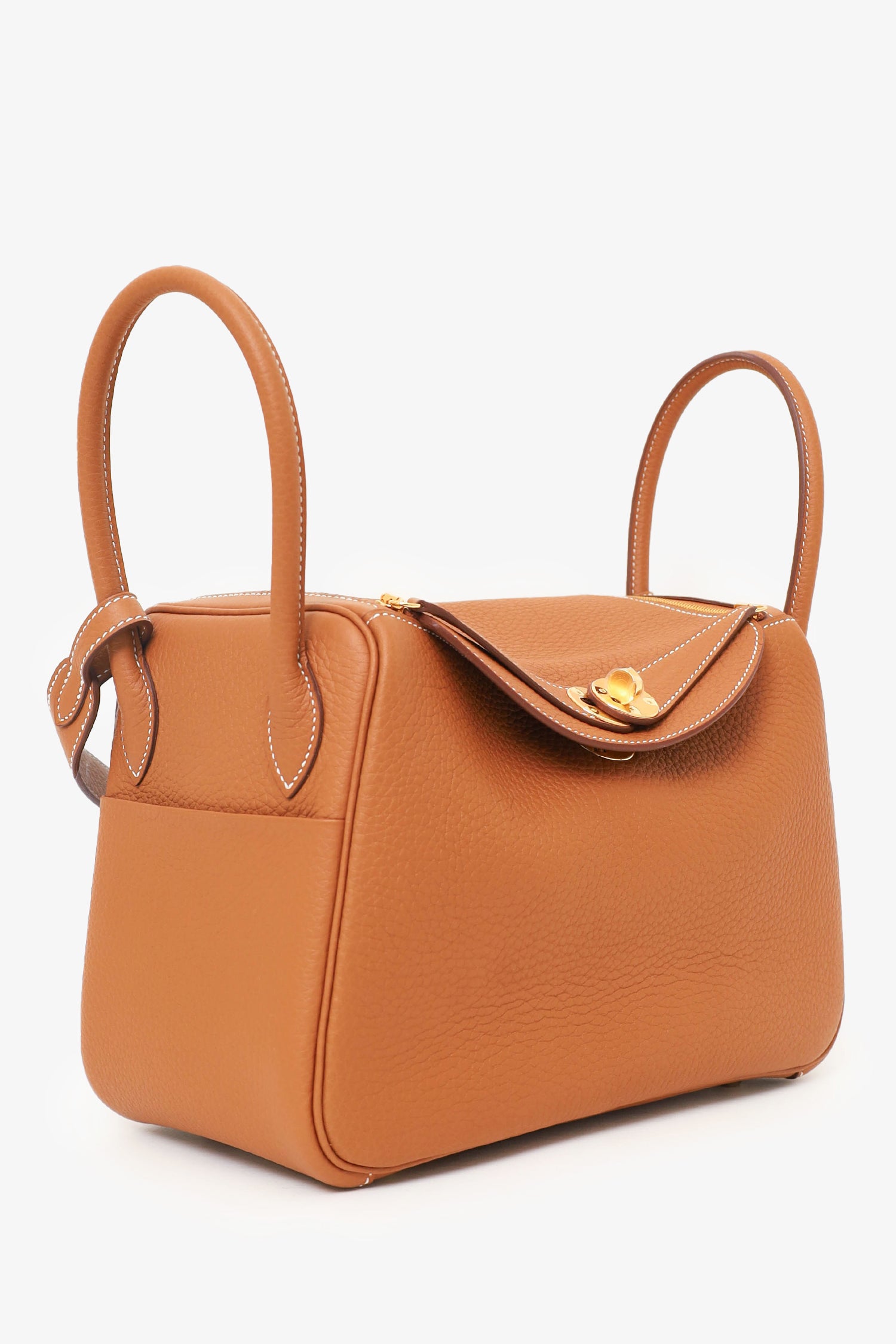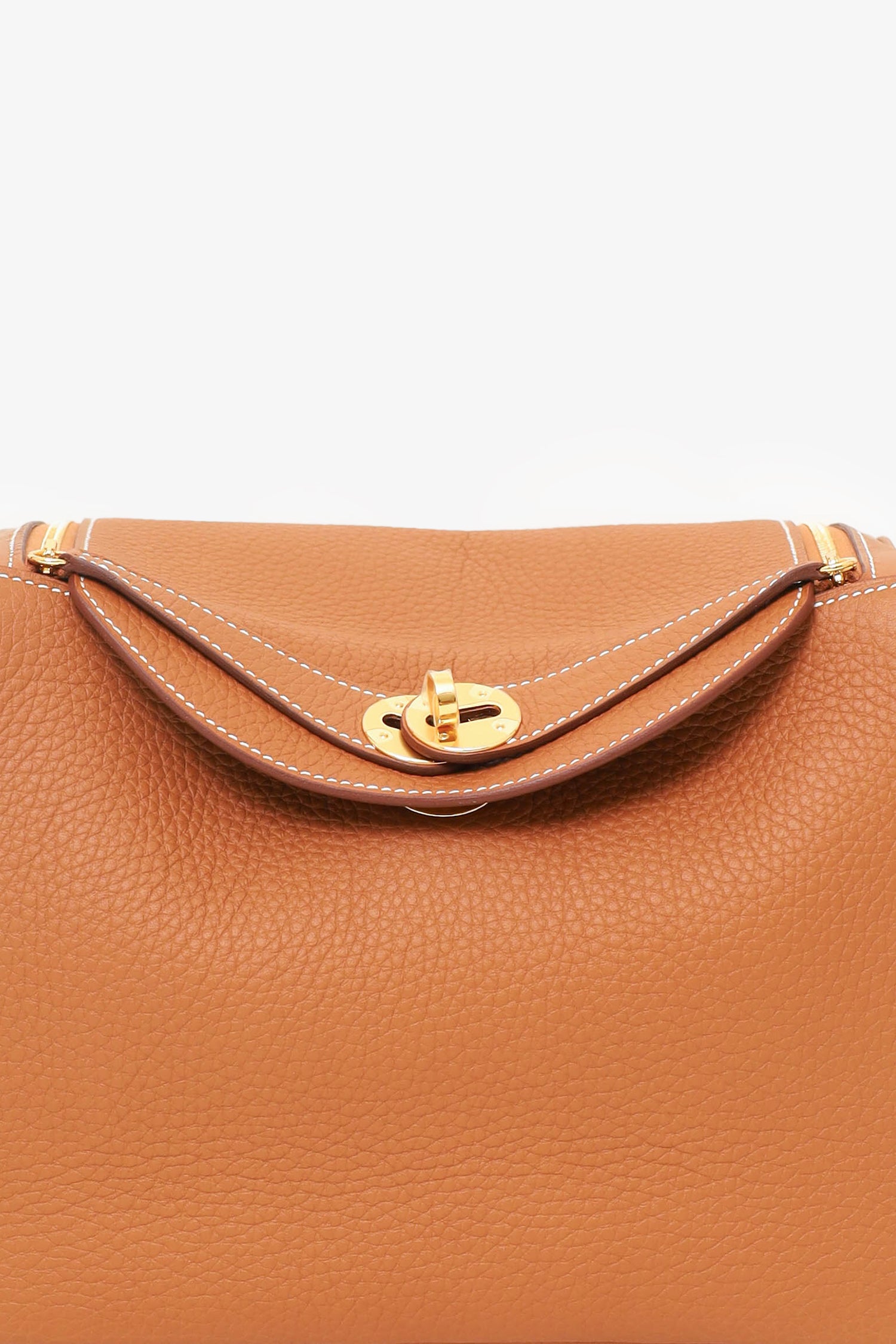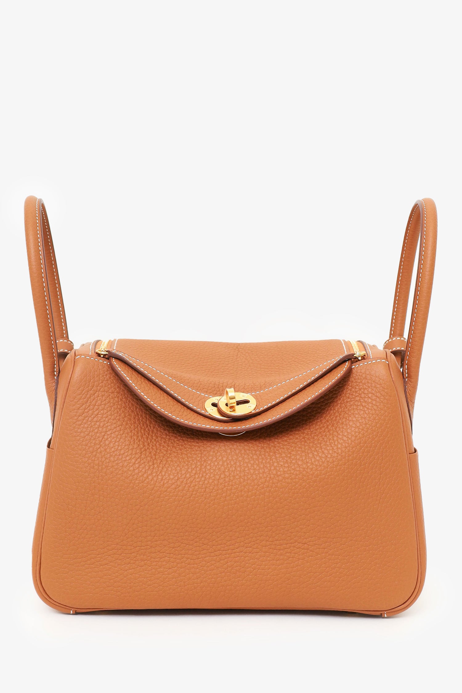 Refresh availabilityHermès 2024 Gold Clemence Lindy 26. Turn lock and zip closure. Attached shoulder strap. 2 exterior size slip pockets. Gold-tone hardware. Protective studs on the bottom. Contrast stitching.