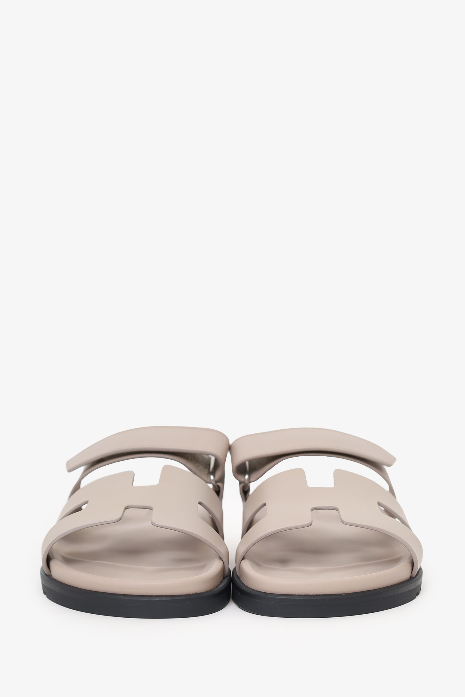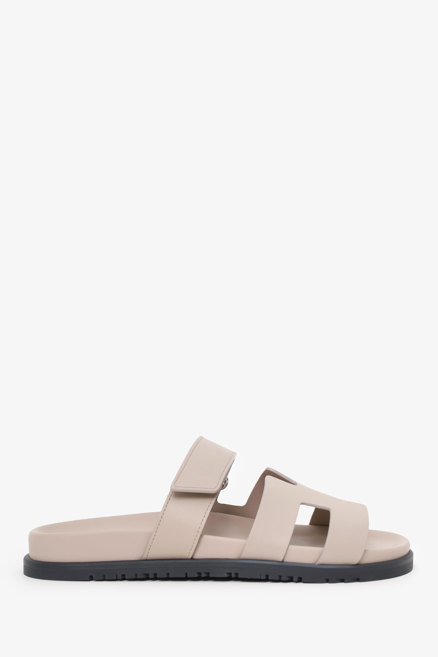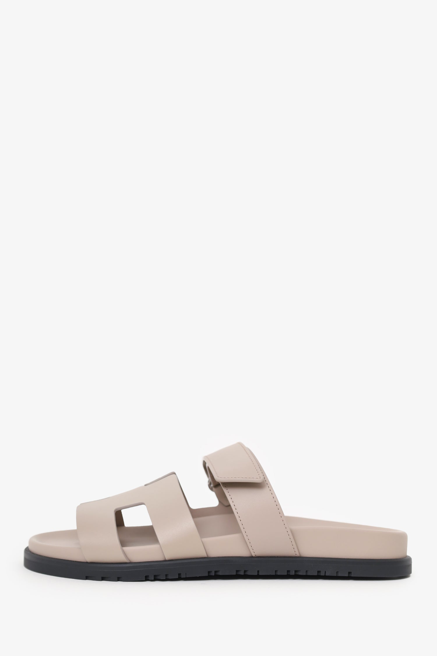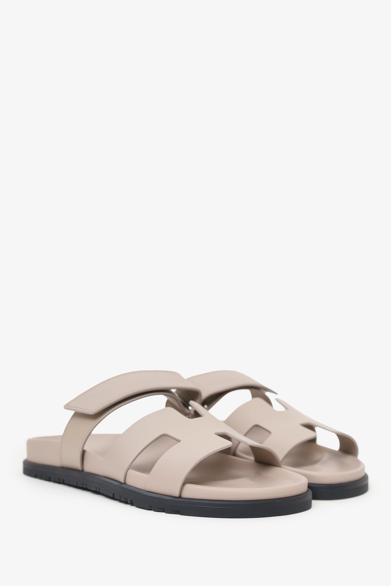 Refresh availabilityHermes Beige Leather Chypre Sandals. Slip-on. Open-squared toe. Top strap with velcro-closure. Tonal stitching. Silver-tone hardware.
