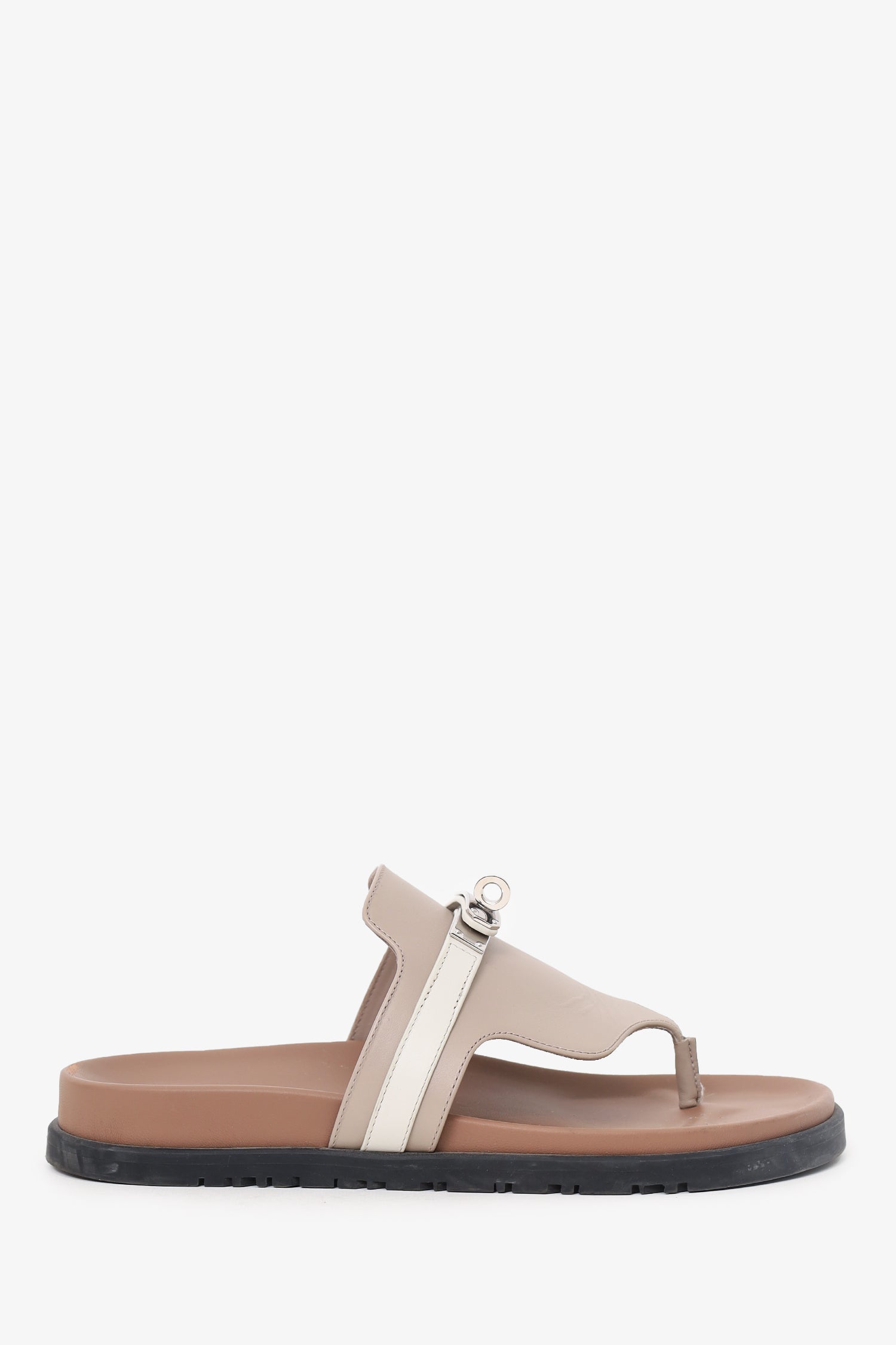 Refresh availabilityHermès Beige Mastic Leather Empire Sandal. Slip-on. Round open toe. Silver-tone hardware. Tonal stitching.