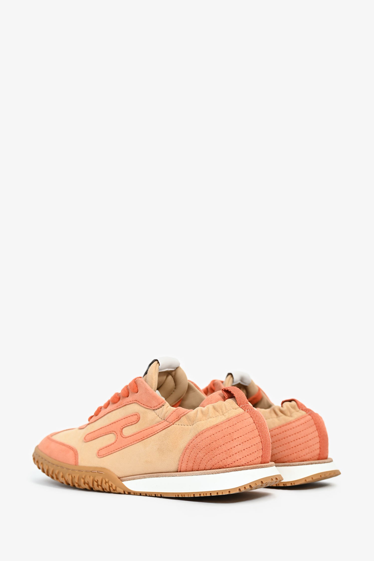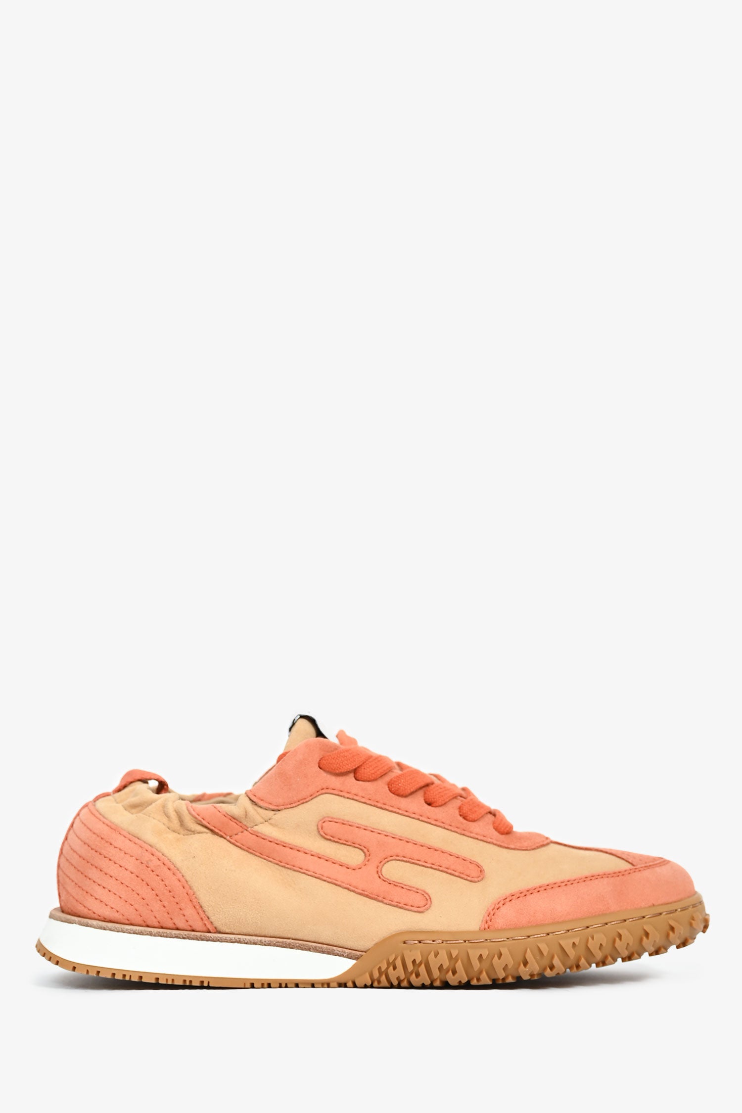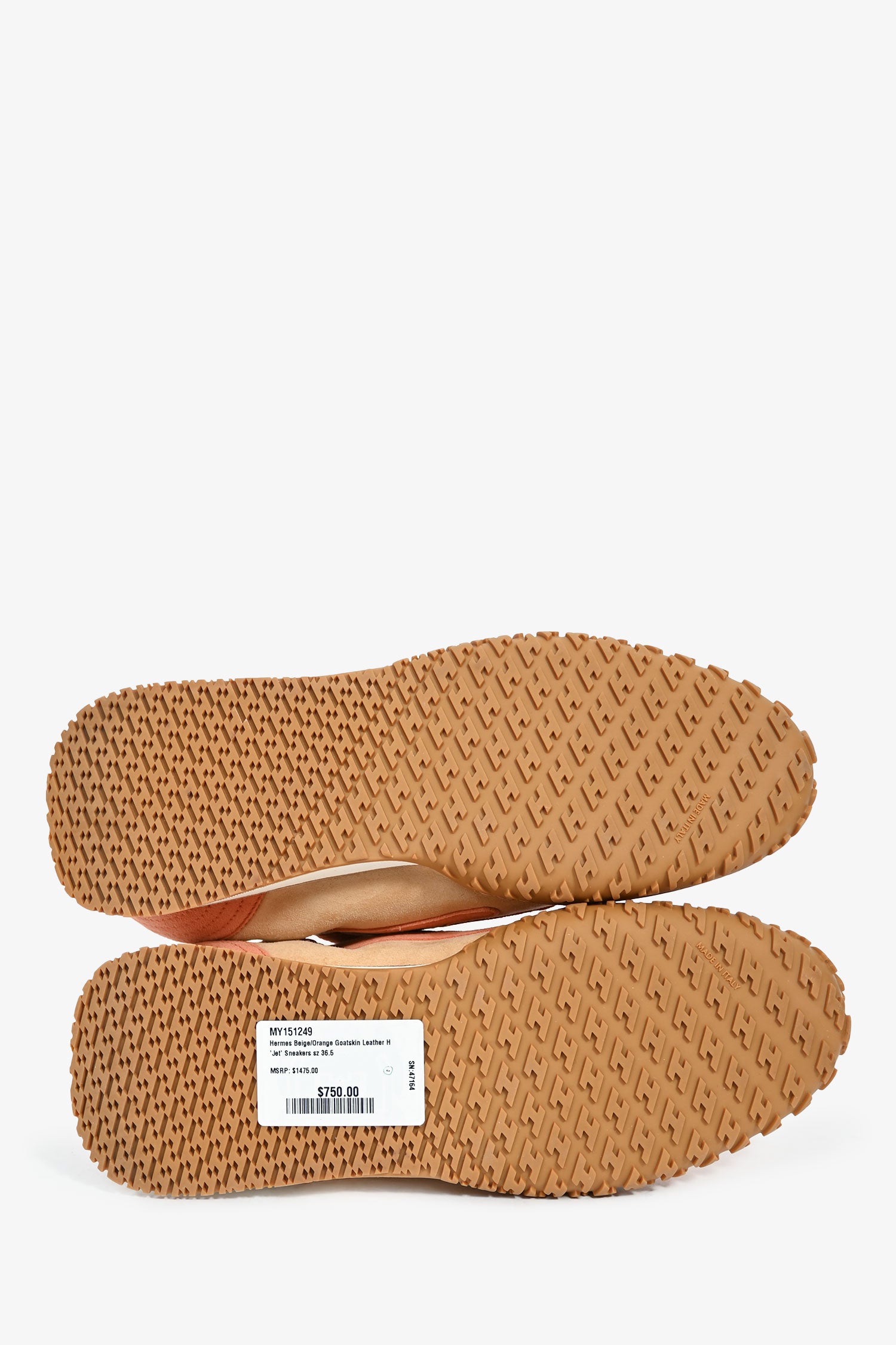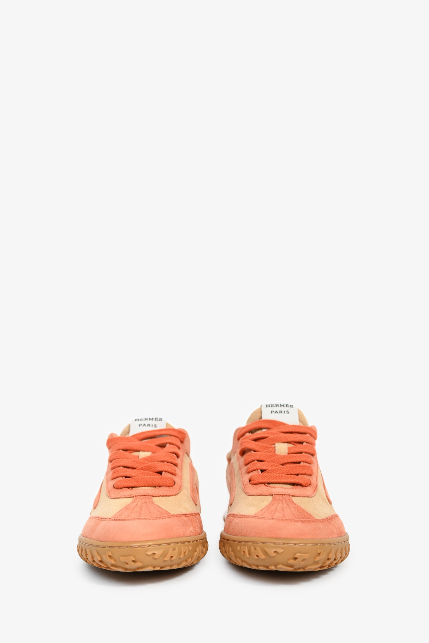 Refresh availabilityHermès Beige/Orange Goatskin Leather H 'Jet' Sneakers. Almond toe. Front tie-up closure. Elasticized shoe collar. Tonal stitching.
