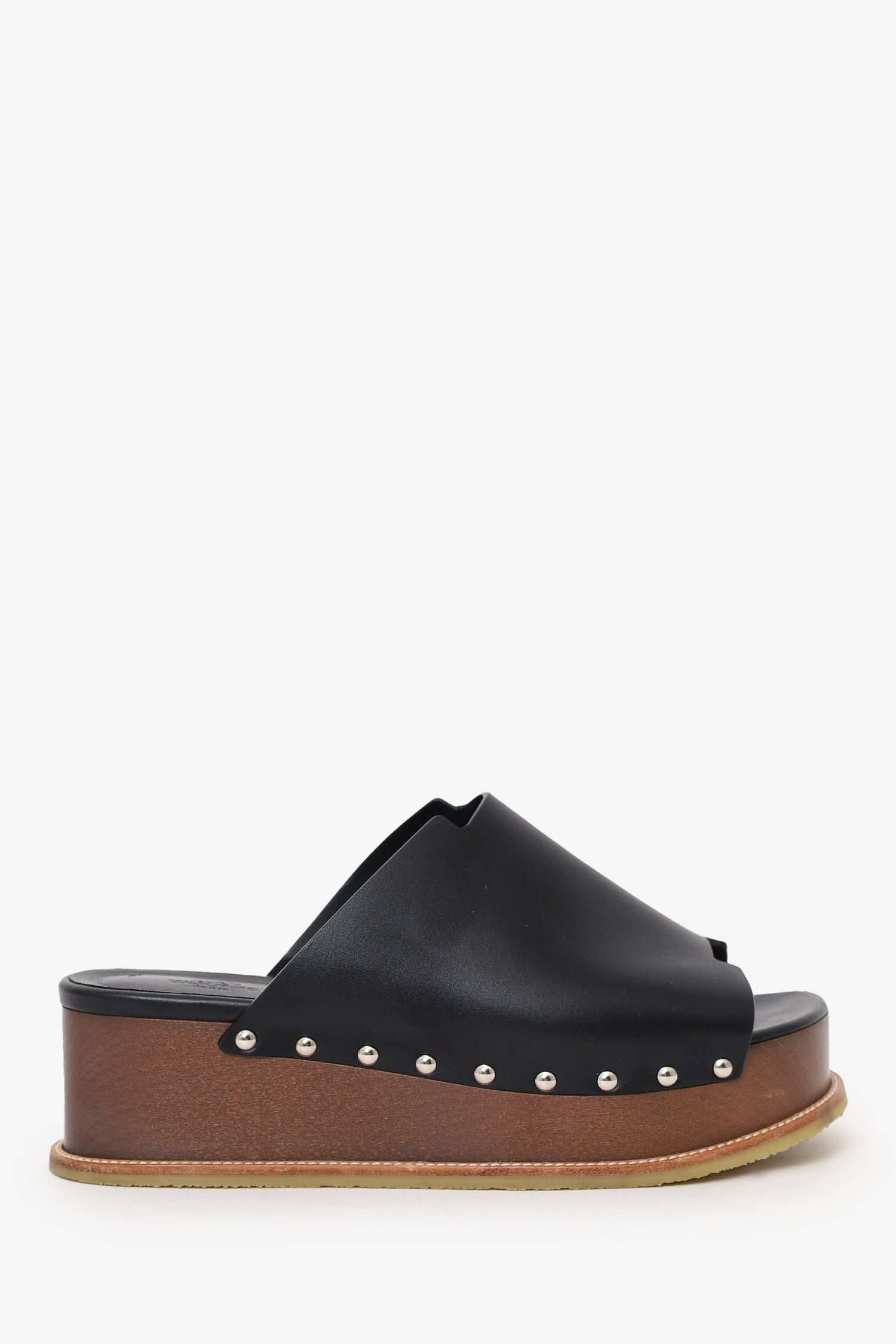 Refresh availabilityHermès Black Calfskin Ellipse Sandals. Slip-on. Open-square toe. Stud embellishment on sides. Silver-tone hardware. Tonal stitching.