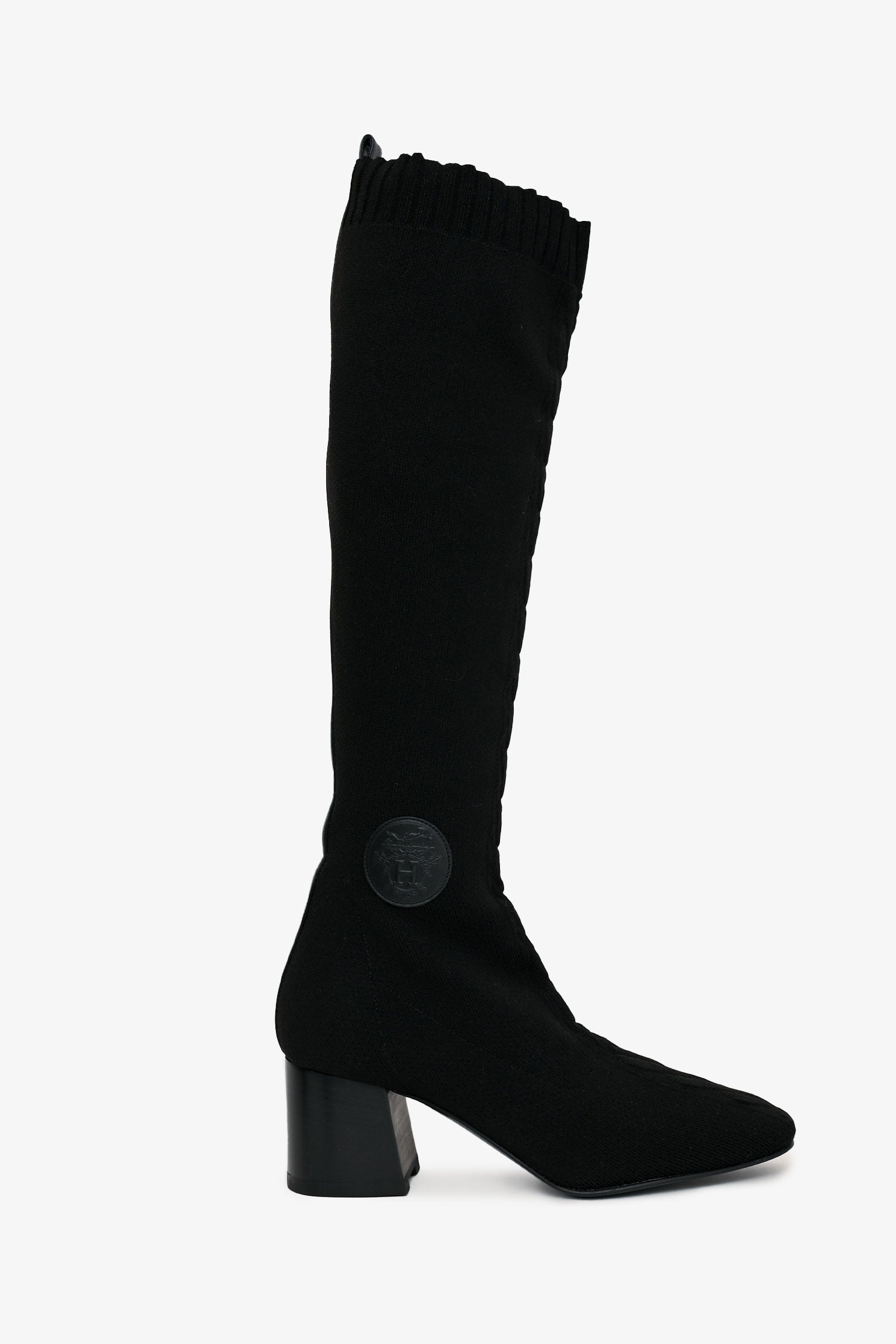 Refresh availabilityHermès Black Fontaine 60 Knee High Boots. Almond toe. Pull-on. Stacked block heel. Leather logo on the sides. Tonal stitching.