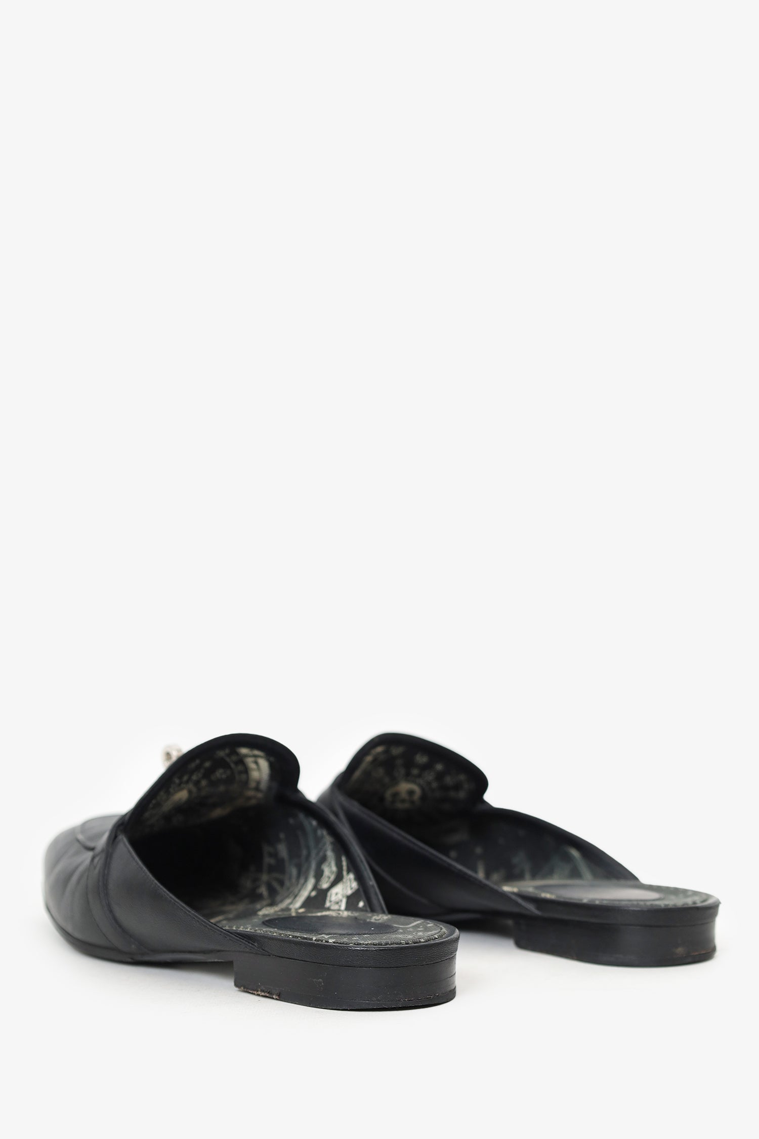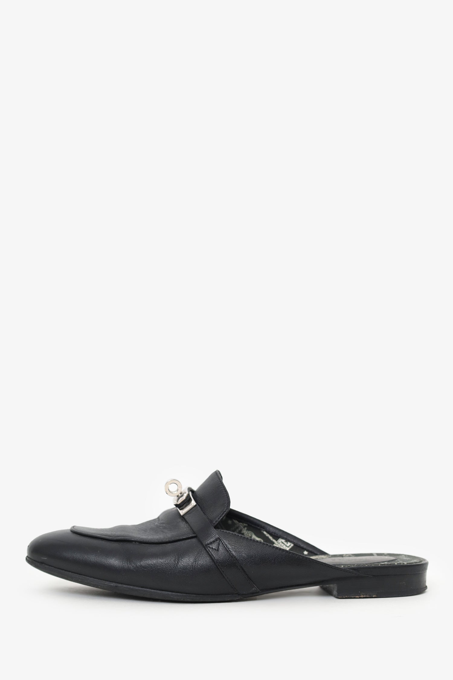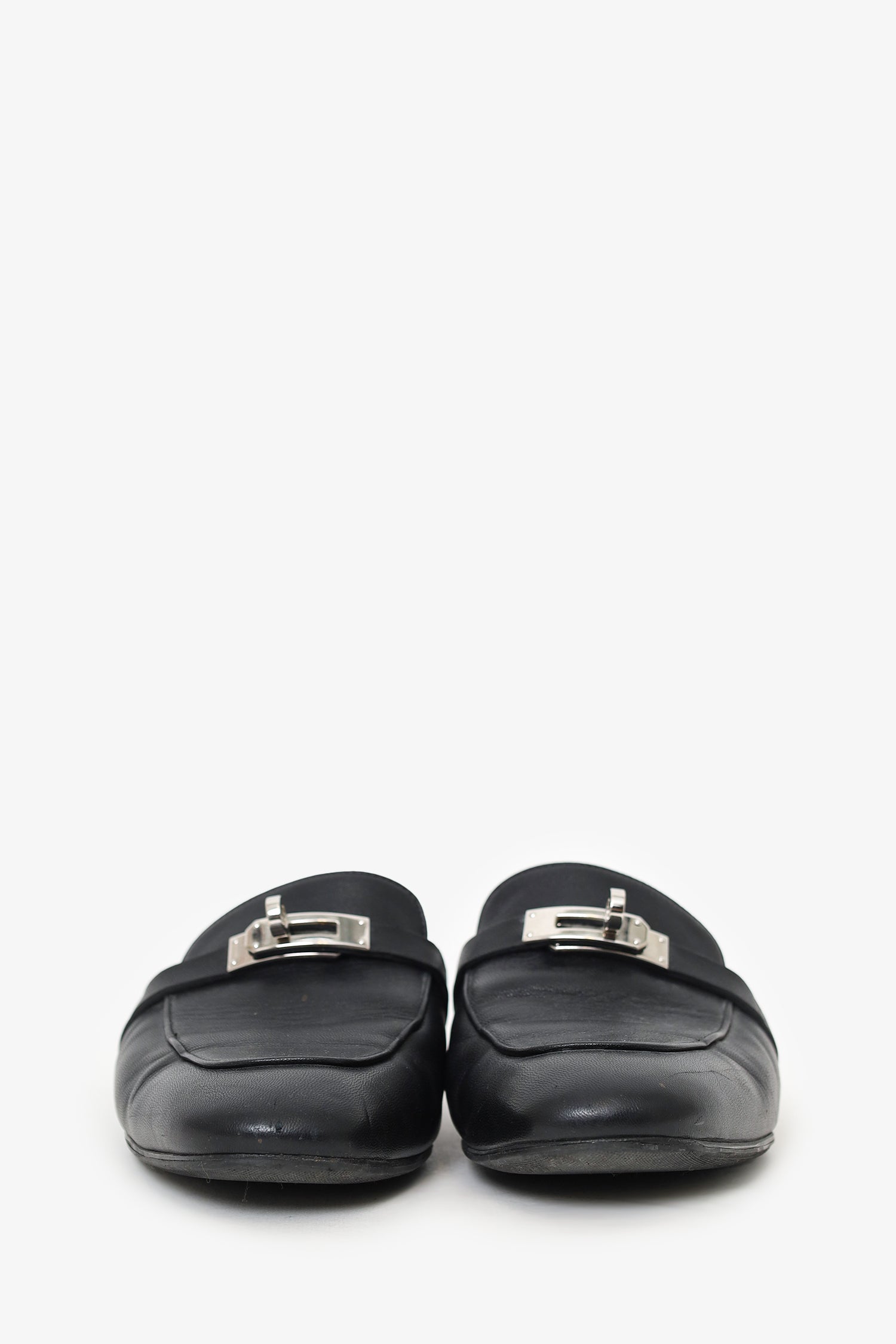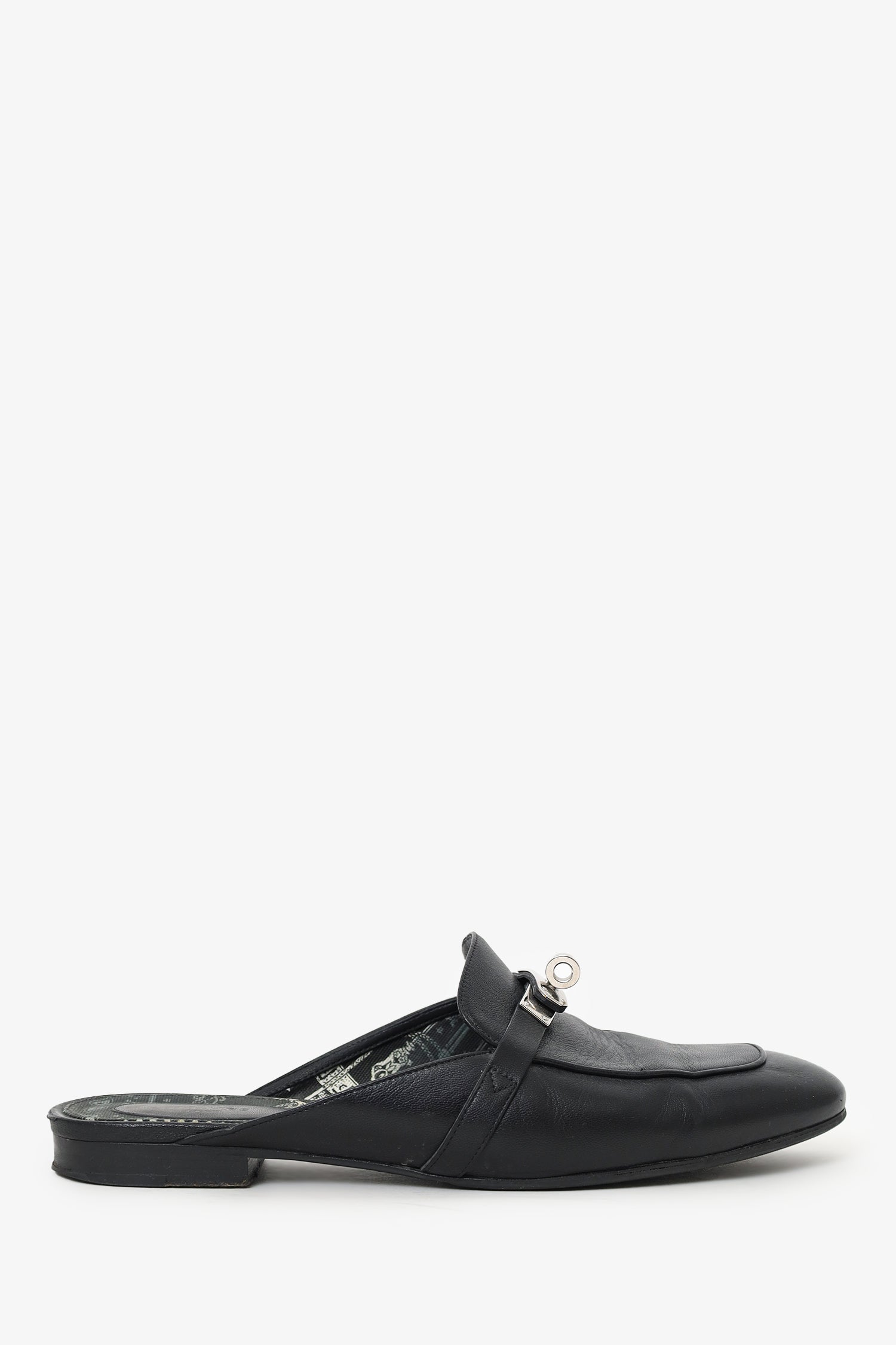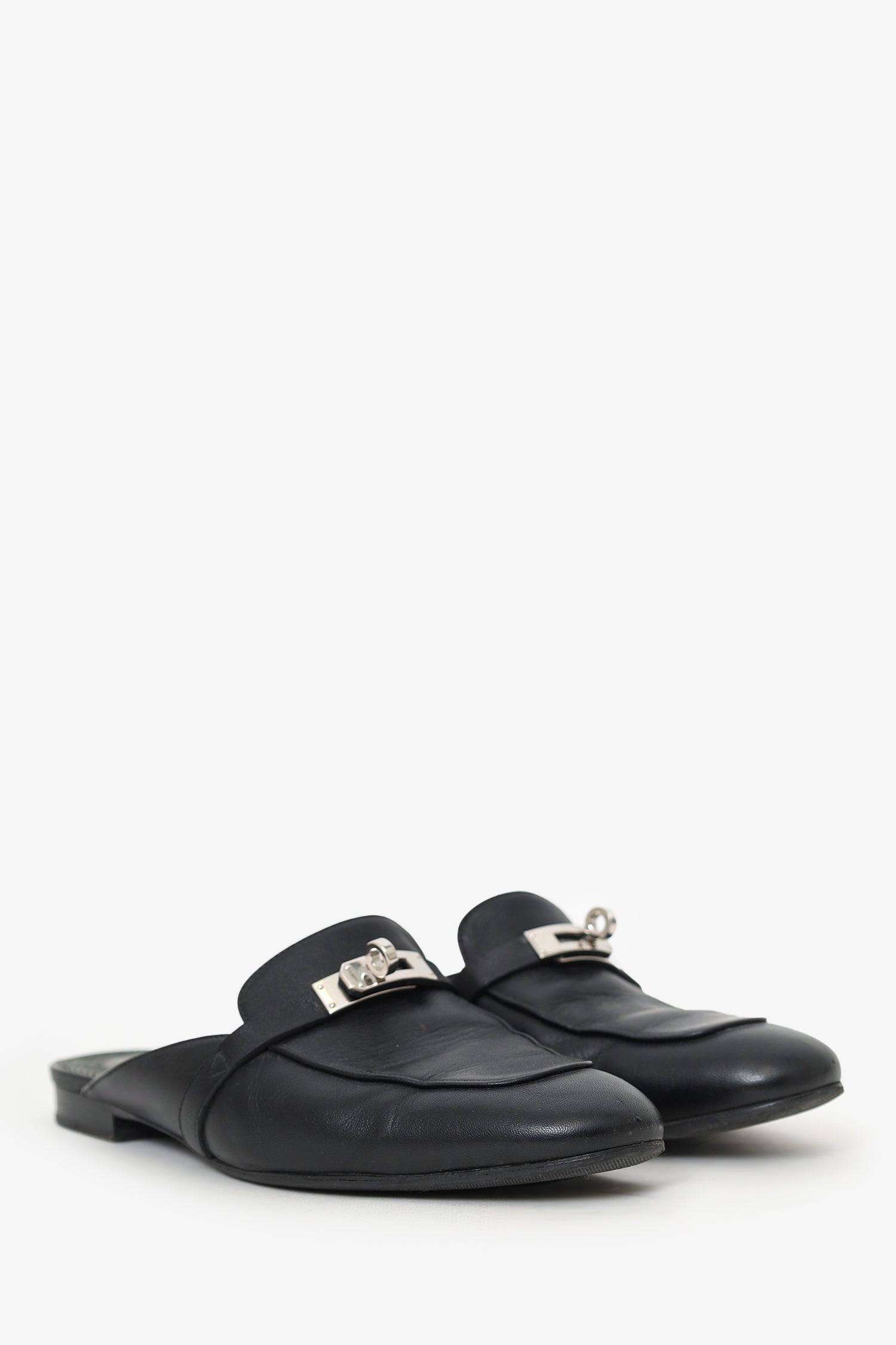 Refresh availabilityHermès Black Leather OZ Kelly Mules. Slip-on. Pointed-round toe. Silver-tone hardware. Tonal stitching.