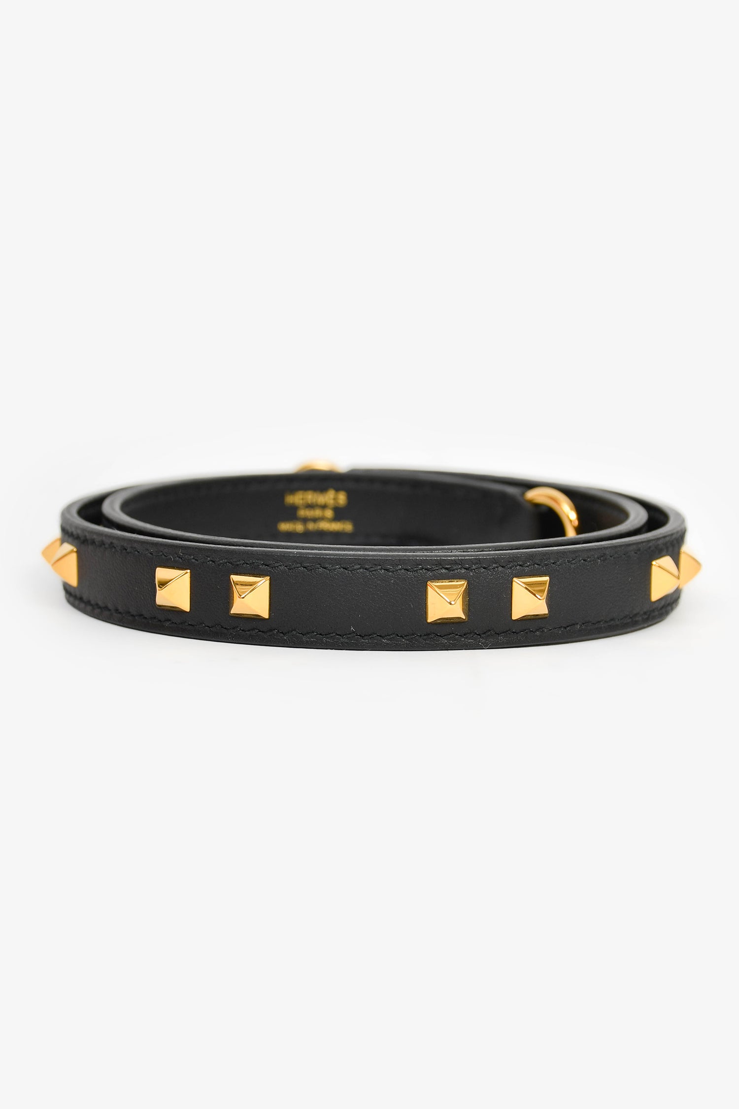 Refresh availabilityHermes Black Leather Studded Bag Strap. Gold-tone hardware. Lobster clamps. Coated trim. Tonal stitching.