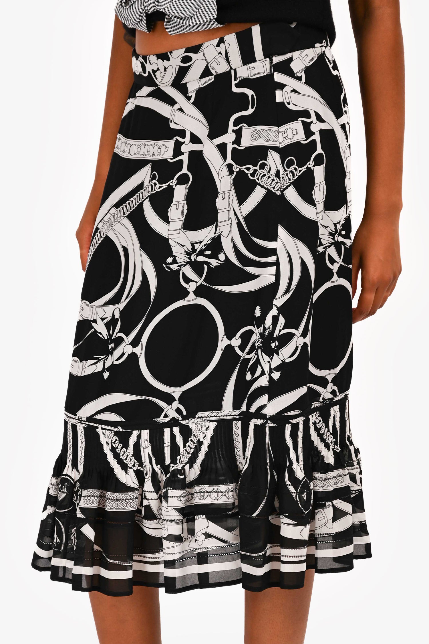 Refresh availabilityHermès Black/White Patterned Silk Ruffle Midi Skirt. Concealed side zip closure. Ruffle hem. Tonal stitching.