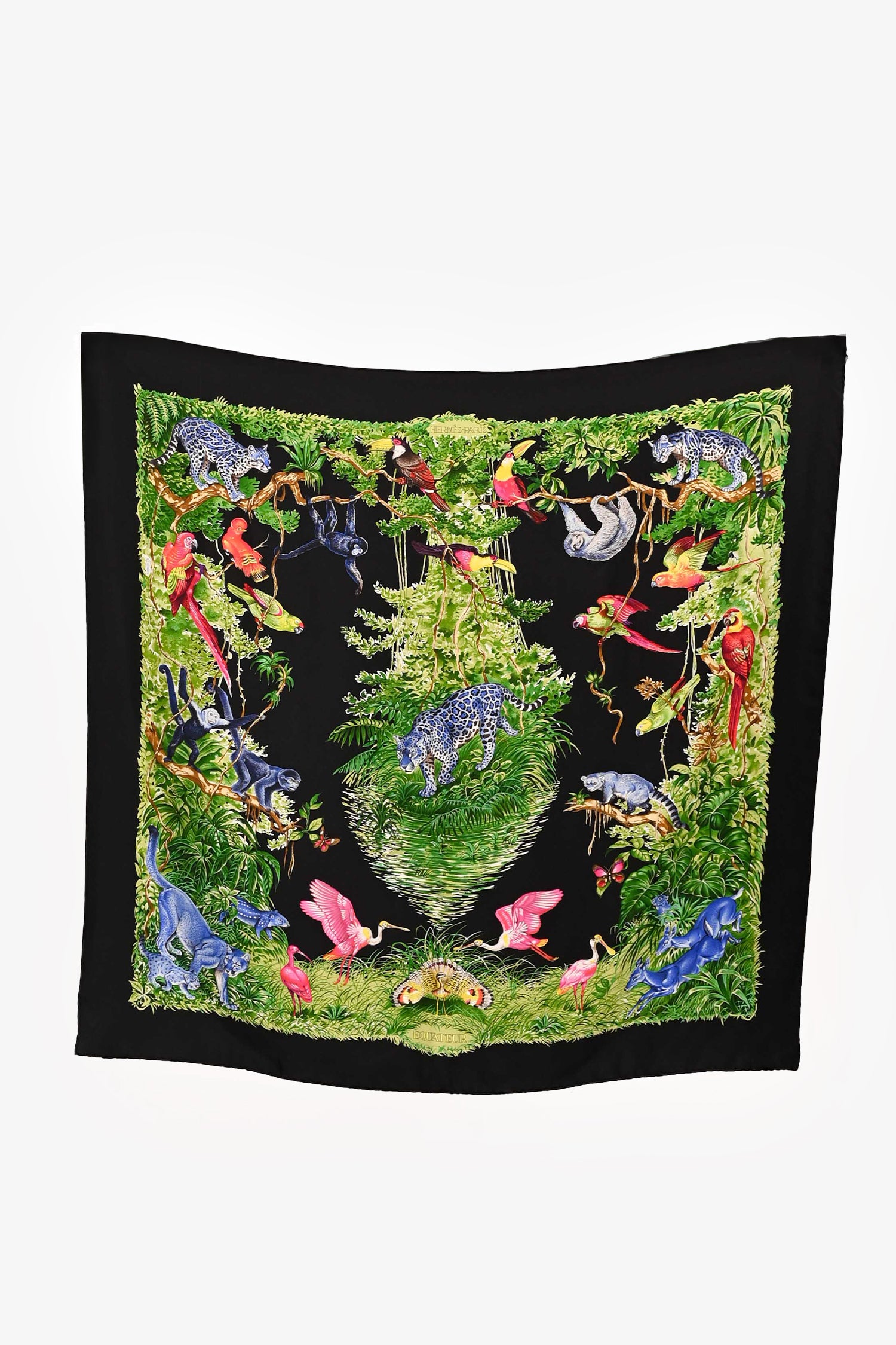 Refresh availabilityHermès Black/Green Multicolour Animal Print 'Equateur' Silk Scarf.