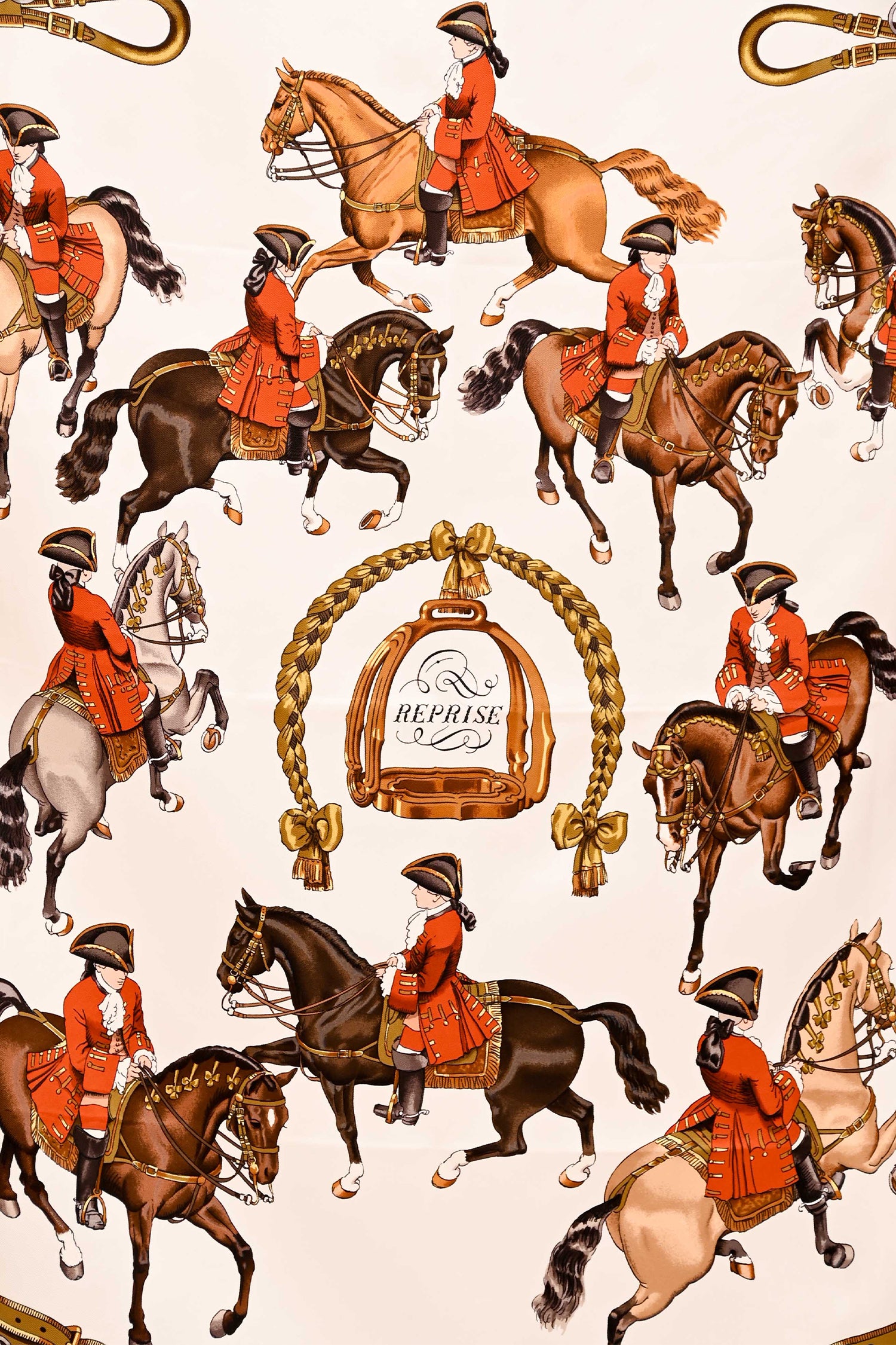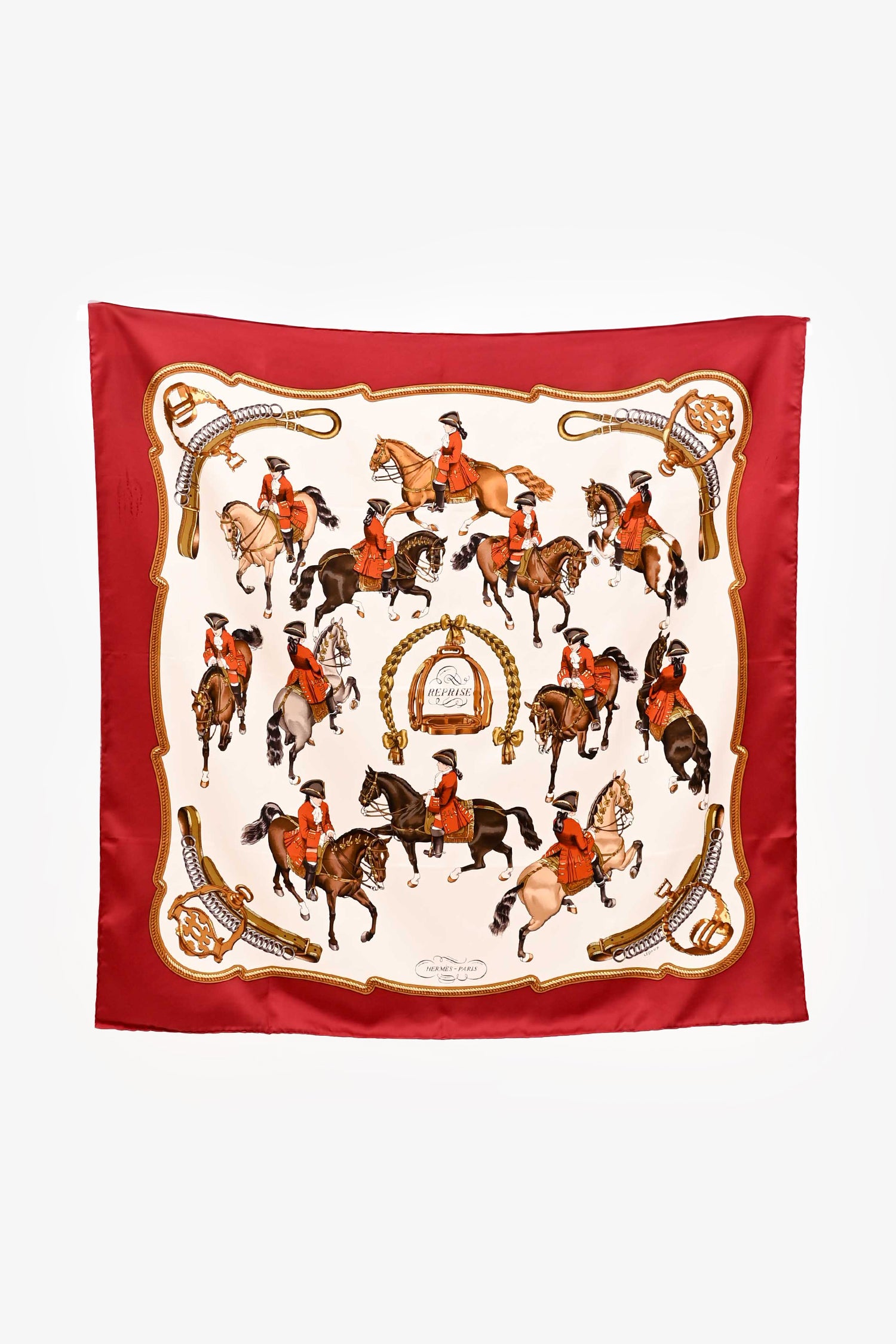 Refresh availabilityHermès Burgundy/White Silk Printed 'Reprise' Scarf. Rolled edges. Square silhouette. Tonal stitching.