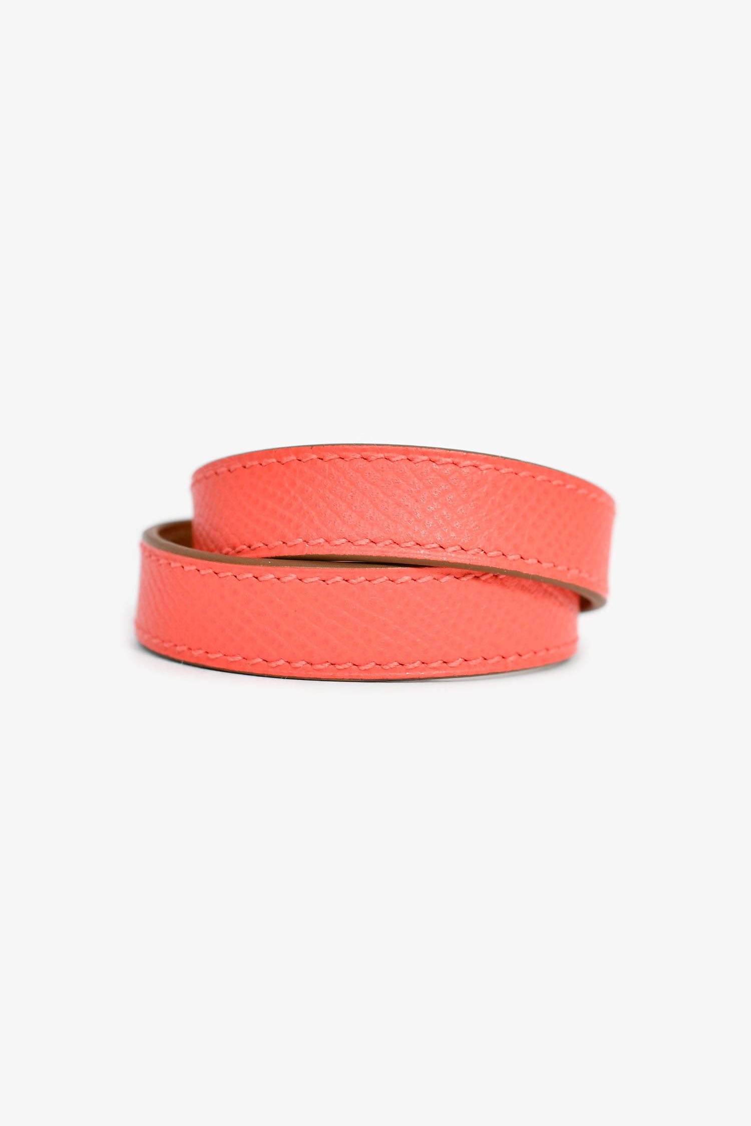 Refresh availabilityHermes Coral Leather Double Tour Bracelet. Silver-tone hardware. Turn-lock closure. Wrap-around leather straps. Tonal and contrast stitching.