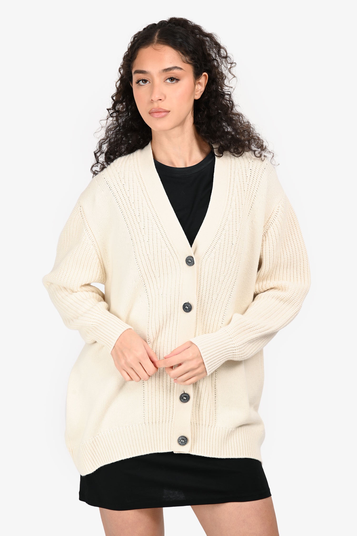 Refresh availabilityHermès Cream Cashmere Logo Oversized Cardigan. Slip-on. V-neckline. Button closure in the front. Ribbed neckline, cuffs, and hemline. Tonal stitching.