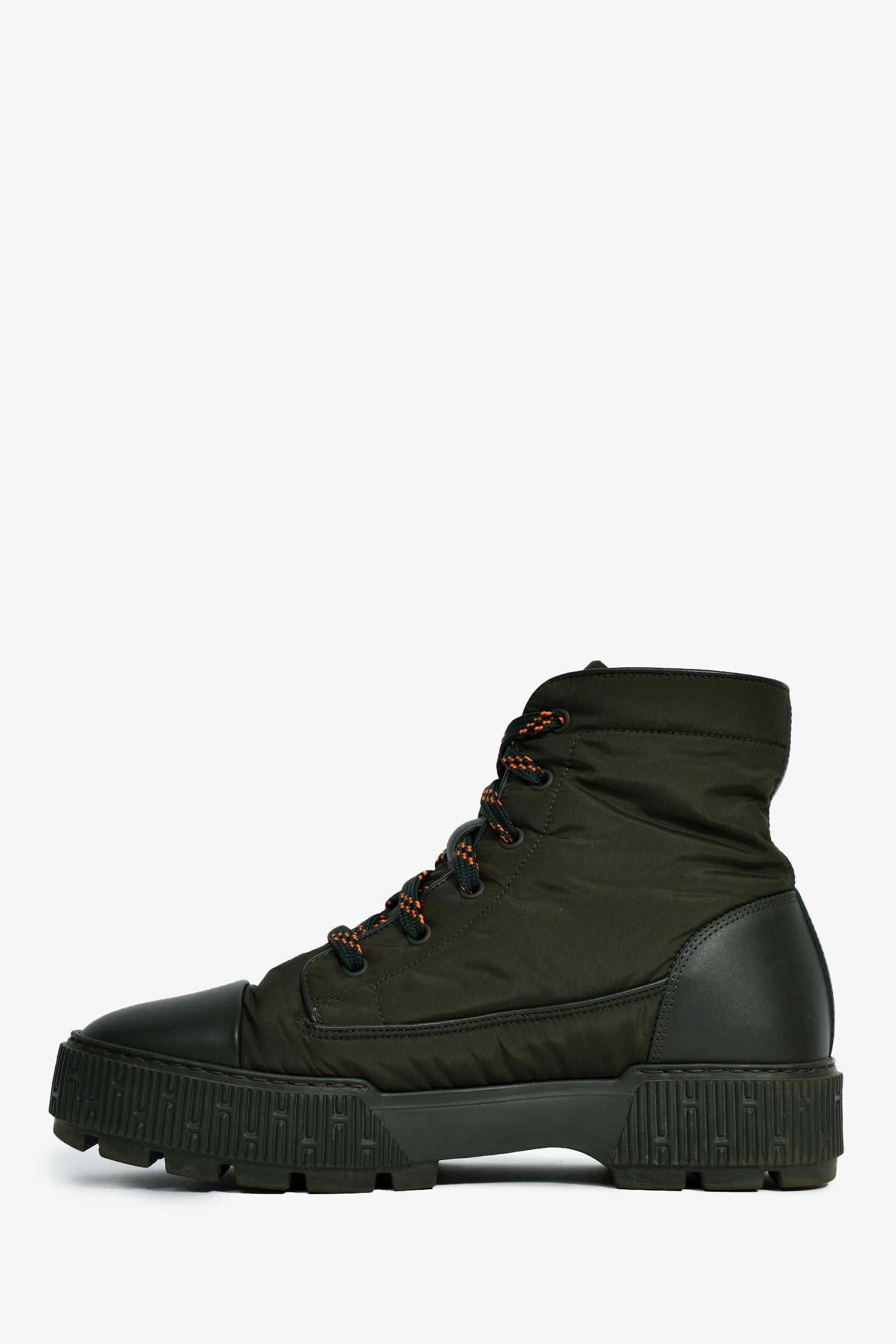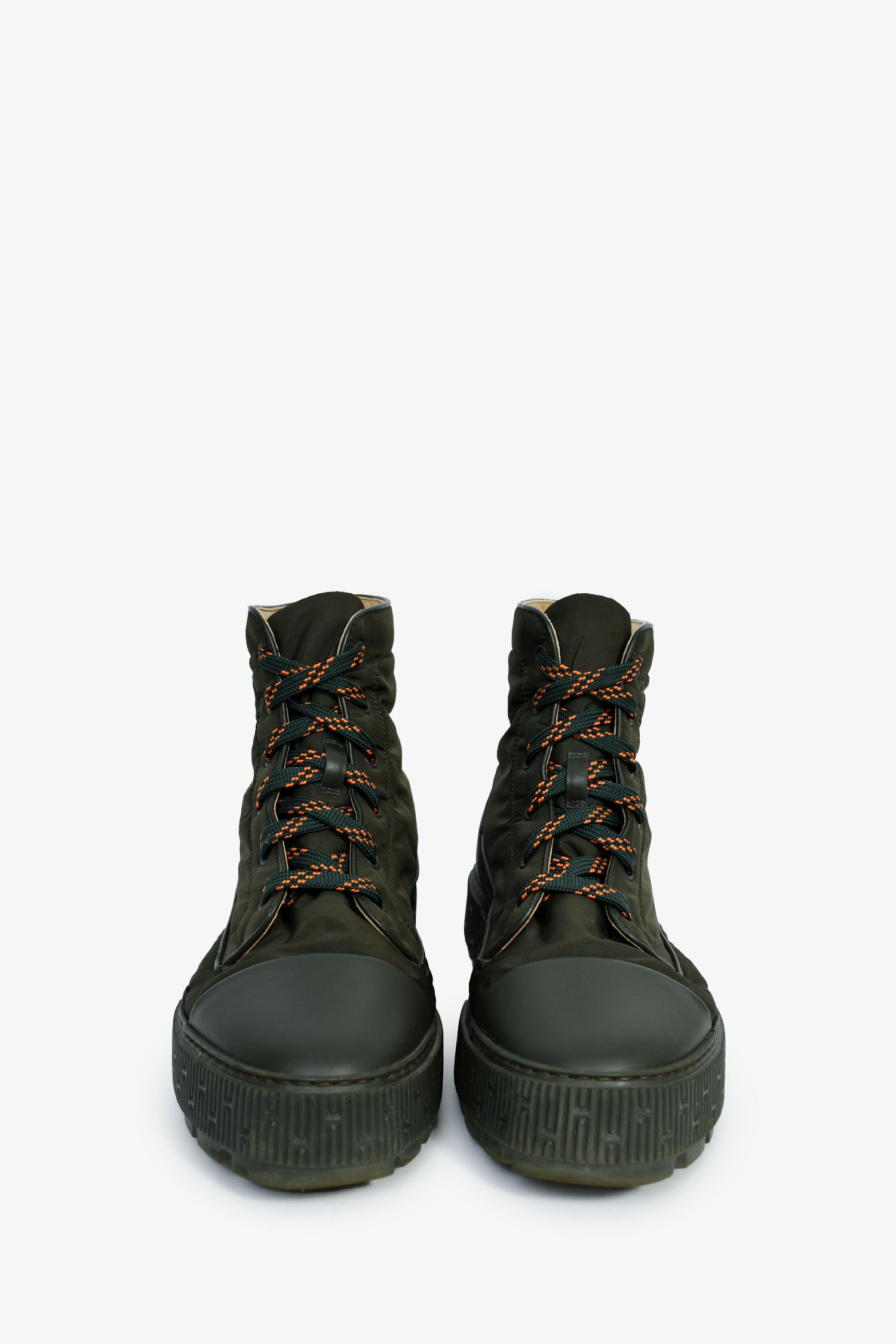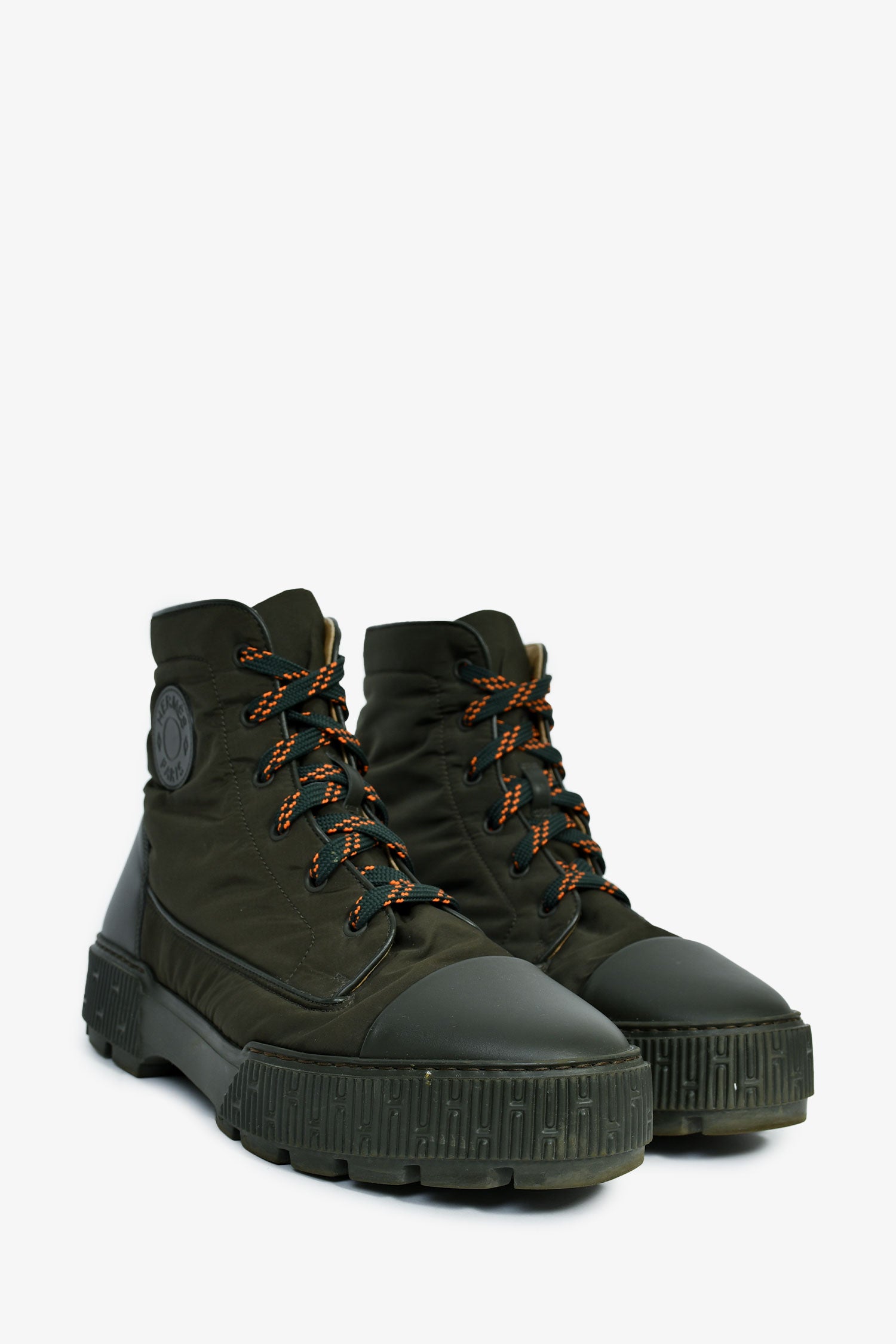 Refresh availabilityHermes Forest Green Nylon 'Fresh' Combat Boots. Round toe. Nylon exterior. Leather trim. Lace-up closure. Leather and nylon interior. Tonal stitching.