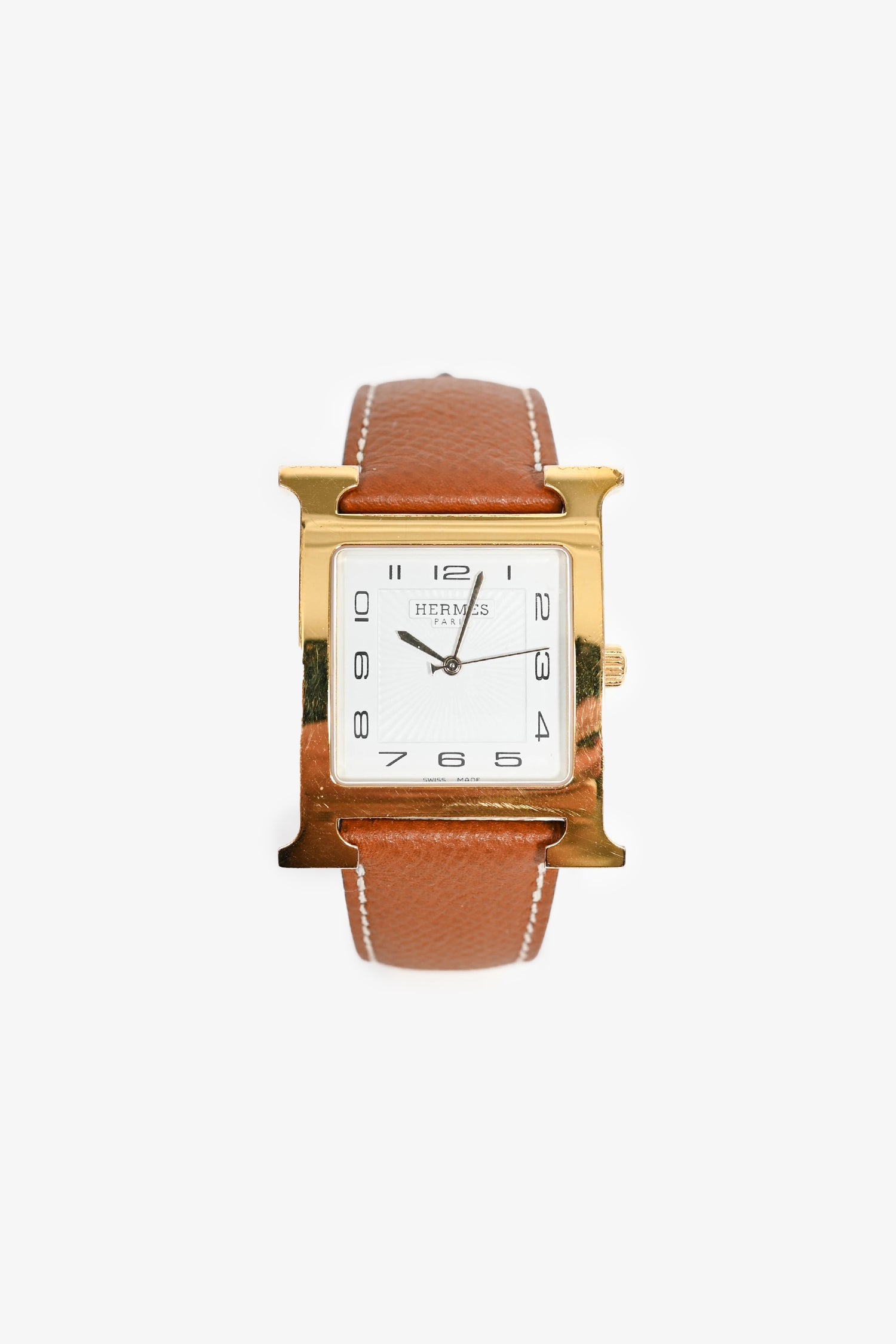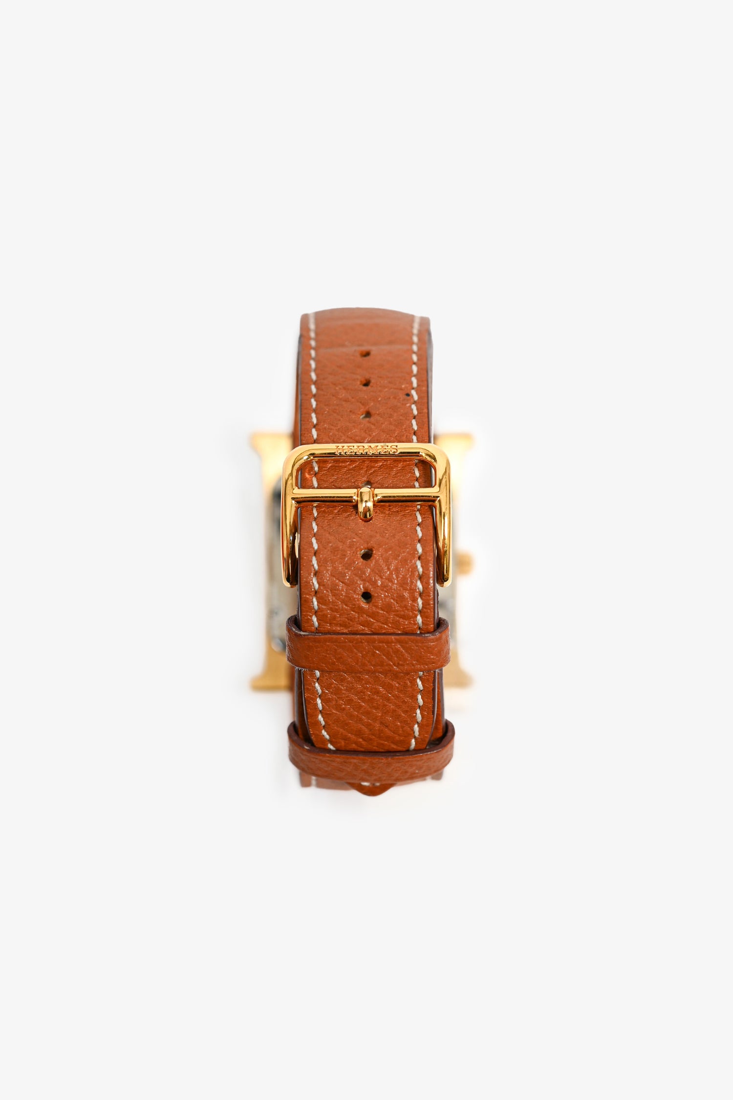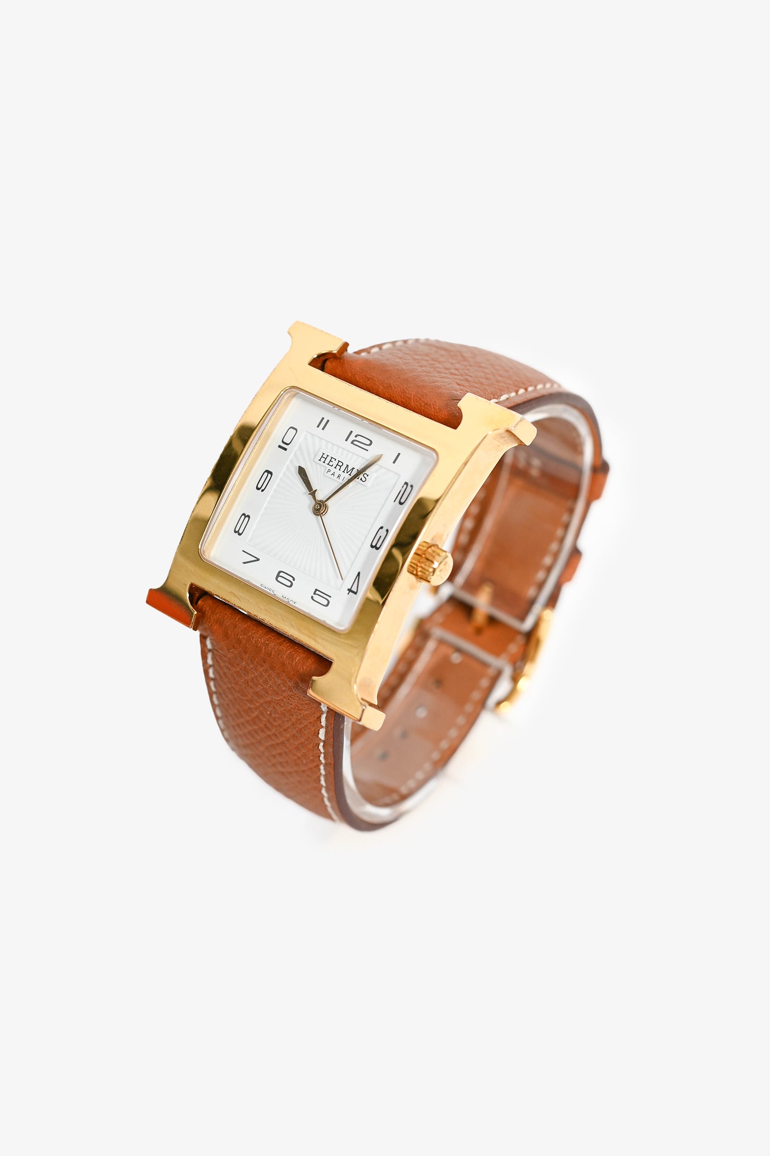 Refresh availabilityHermès Gold Epsom Leather Medium 30mm 'Heure' Watch. Quartz movement. Sapphire crystal watch glass. Rear pin buckle closure. Contrast stitching.