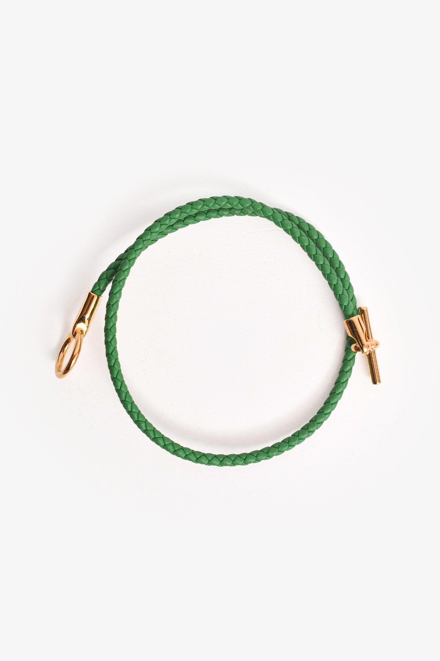 Refresh availabilityHermès Green Glenan Double Tour Bracelet. Gold-tone hardware. Toggle closure. Woven leather throughout. Tonal stitching.