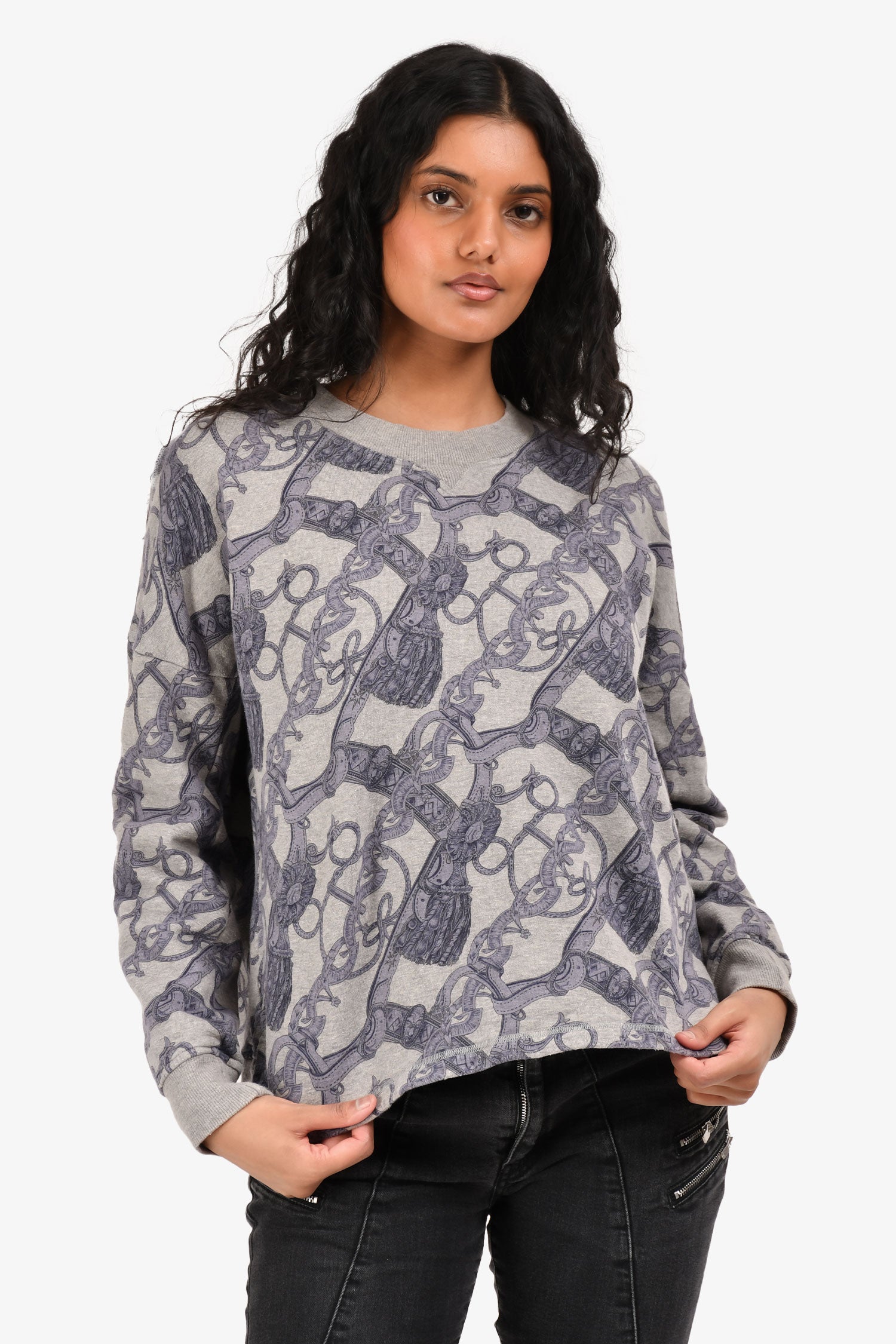 Refresh availabilityHermès Grey Blue 'Bride De Cour' Printed Crewneck Sweatshirt. Ribbed neckline, cuffs and hem. Small side slit on both sides. Tonal stitching.