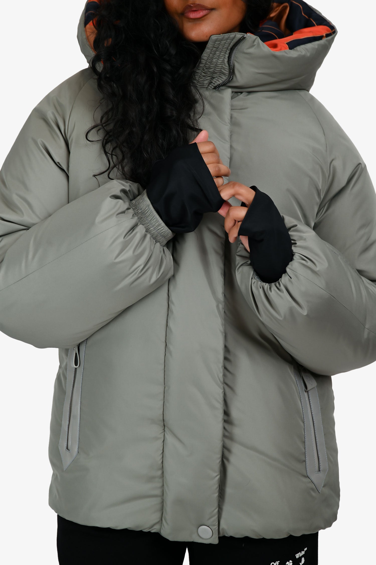 Refresh availabilityHermès Grey Bomber Style Hooded Down Jacket. Pull-on. Front 2-way zip and snap button-up closures. 2 front zip pockets. Elasticized cuffs. Lined interior. Tonal stitching.