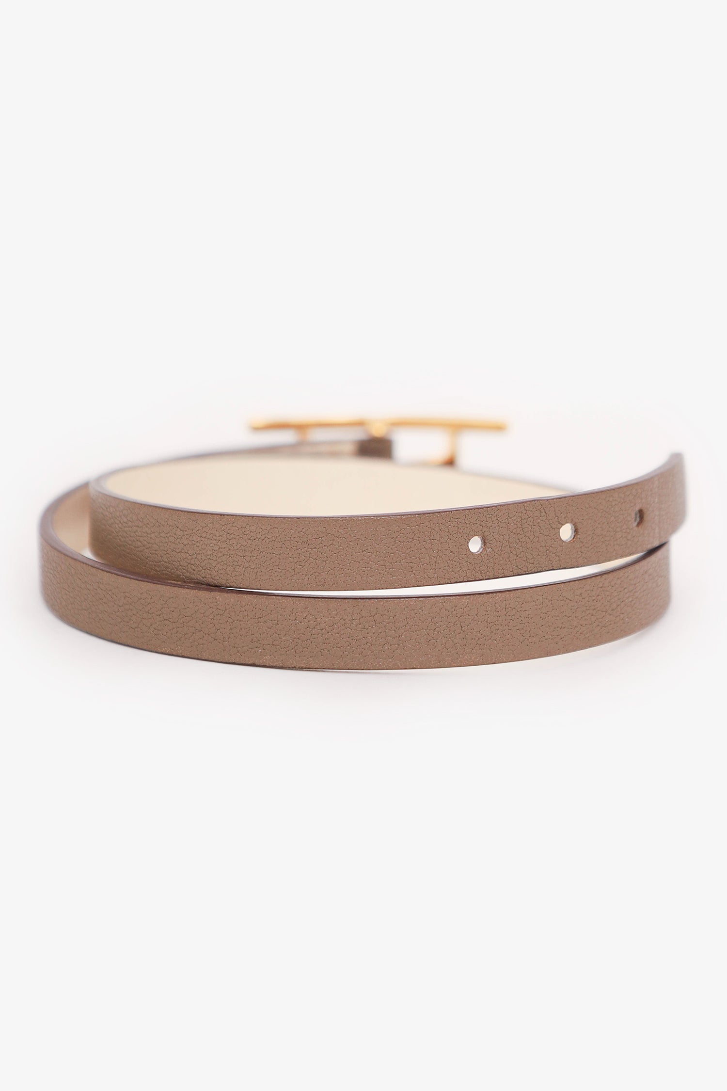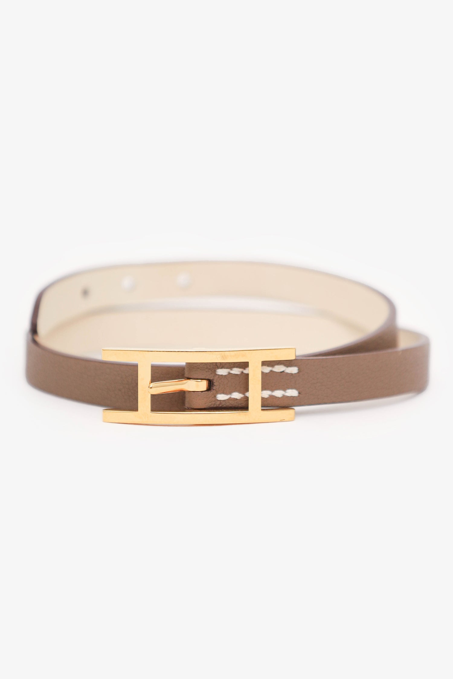 Refresh availabilityHermés Grey Leather Behapi Double Tour Bracelet. Pull-through adjustable closure. Gold-tone hardware. Contrast stitching.