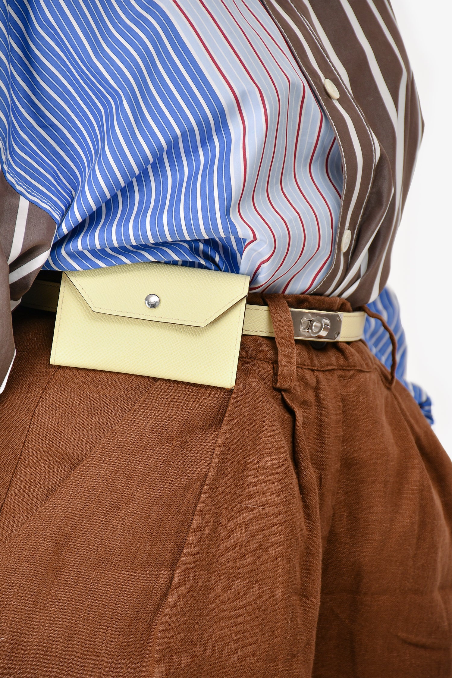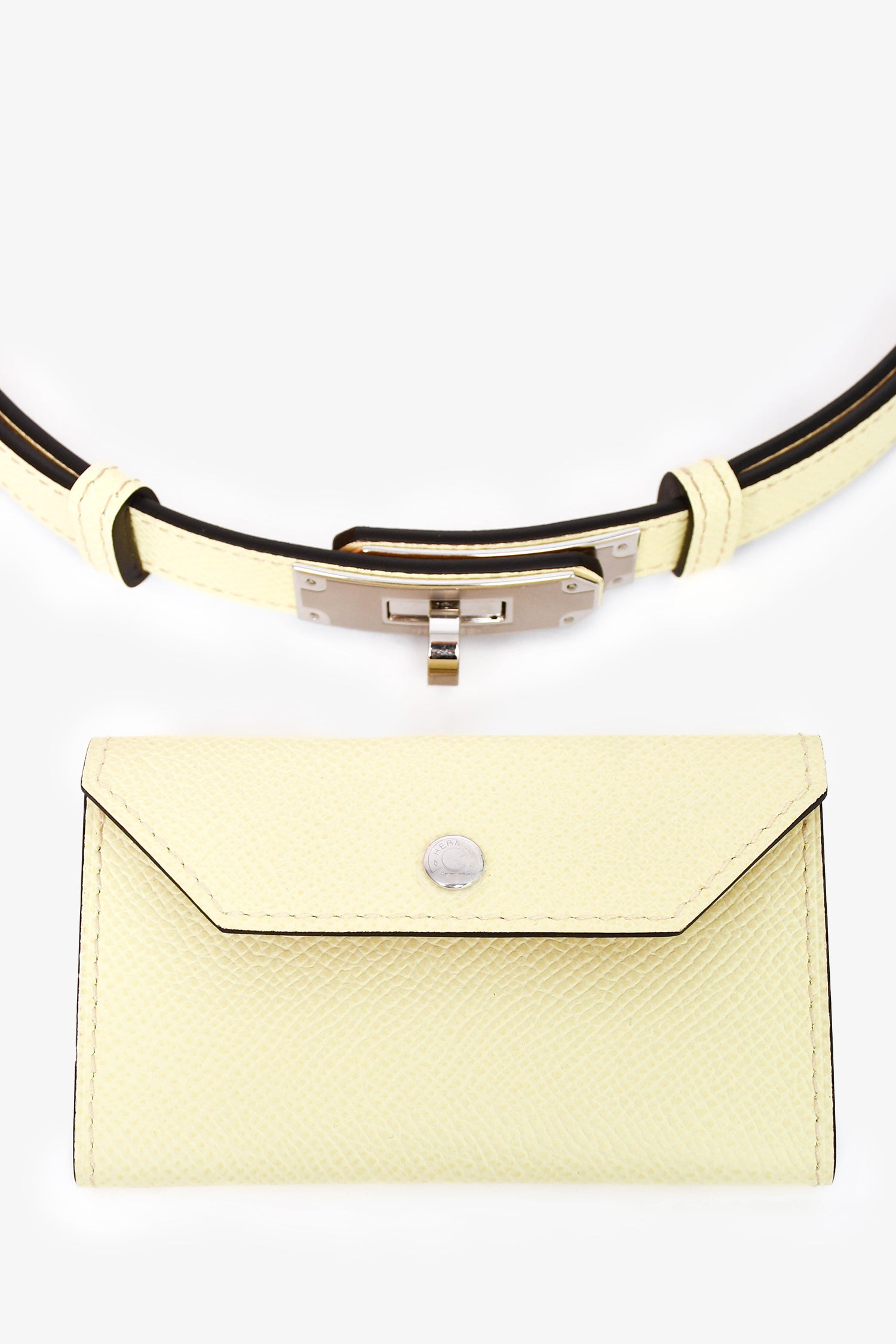 Refresh availabilityHermès Light Lemon Epsom Calfskin 'Kelly' Pocket 18 Belt. Snap-button closure on pouch. Turn-lock closure on belt. Silver-toned hardware. Tonal stitching. Comes with dust bag and original box.