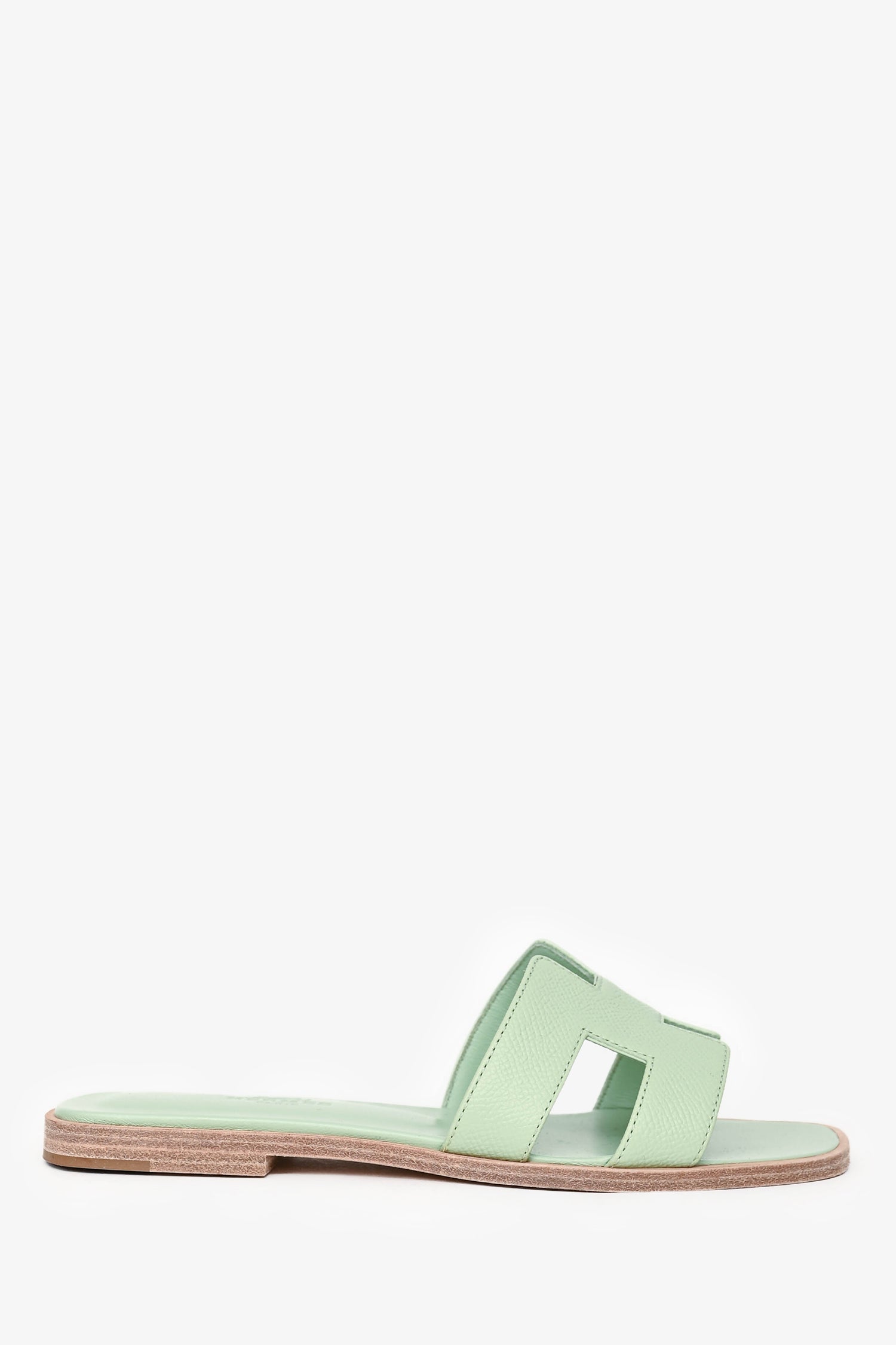 Refresh availabilityHermès Locust Vert Epsom Leather Oran Sandals. Leather insoles. Square toe. Leather 'H' vamp. Tonal stitching.