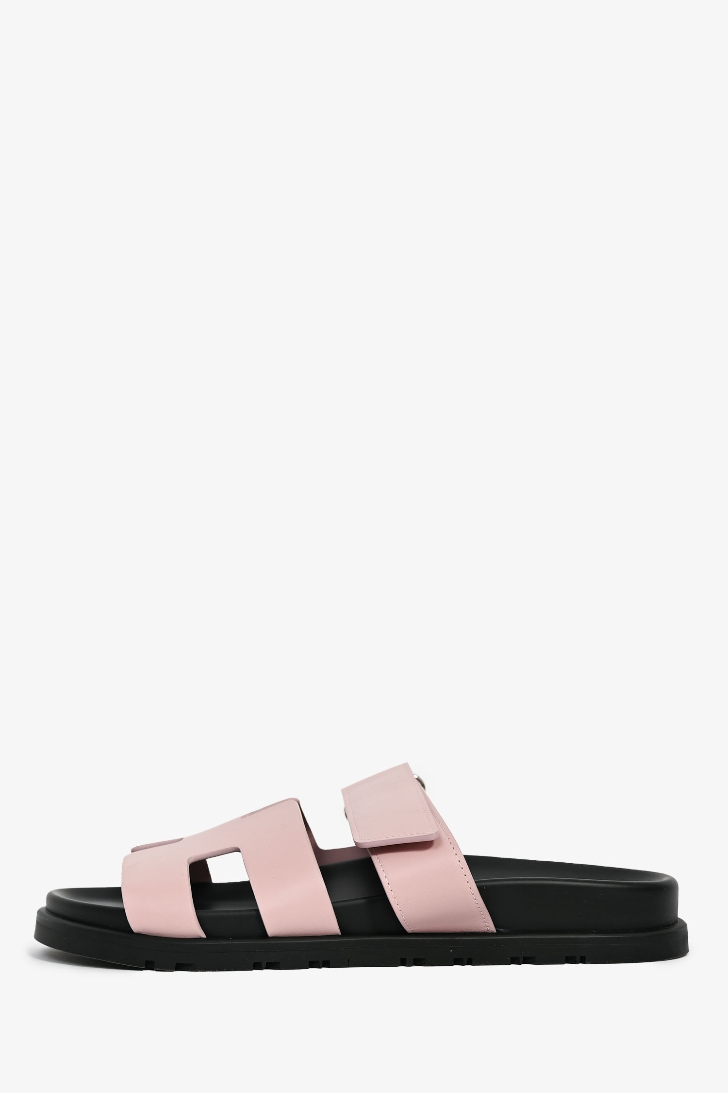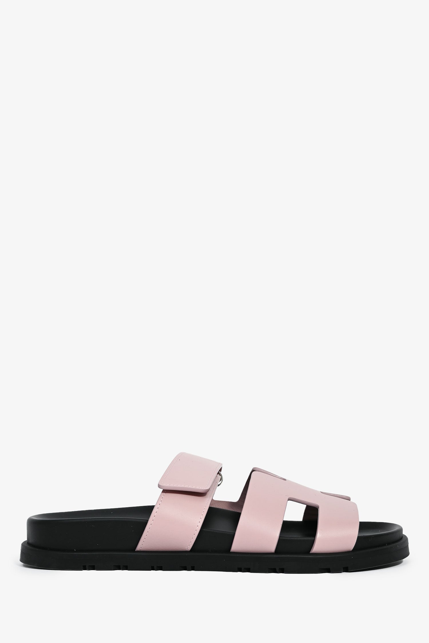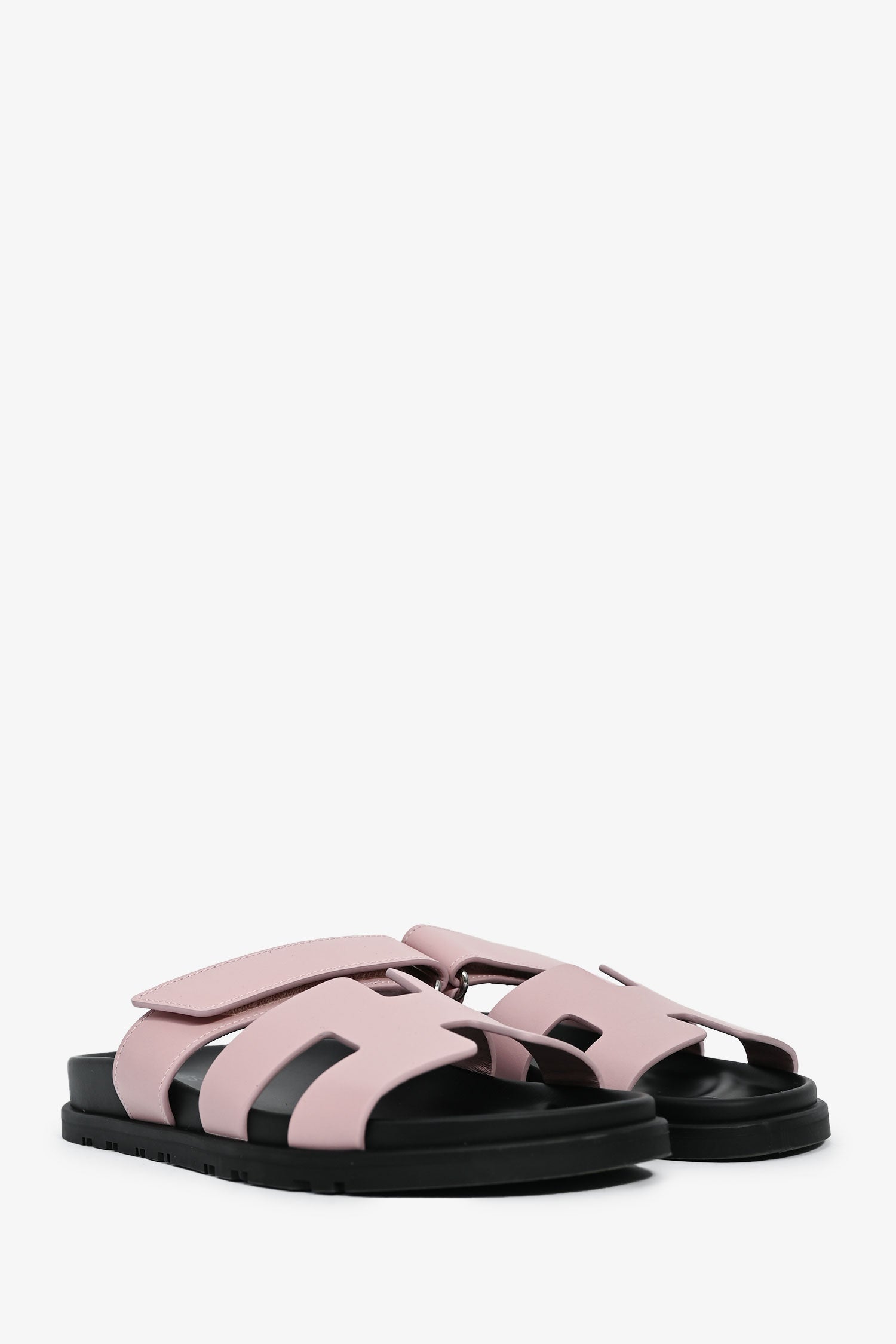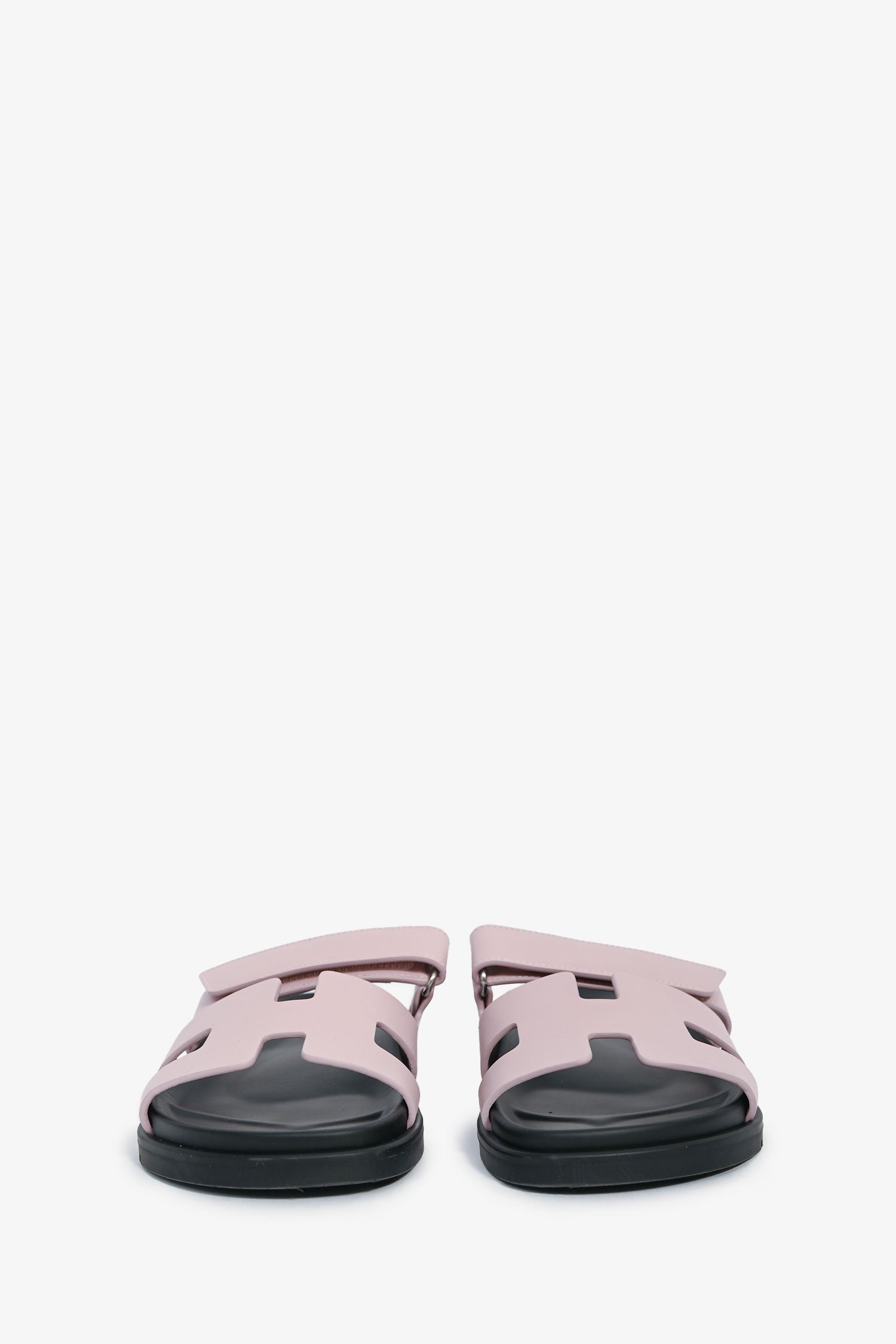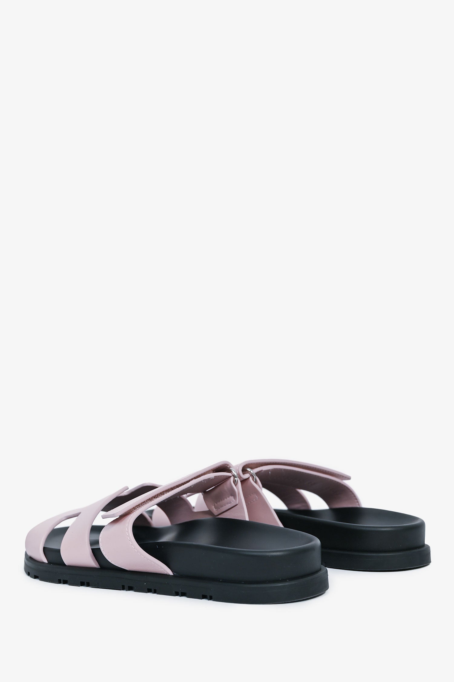 Refresh availabilityHermès Mauve Leather Chypre Sandals. Open-toe. Slip-on. Adjustable velcro straps. Silver-tone hardware. Tonal Stitching.