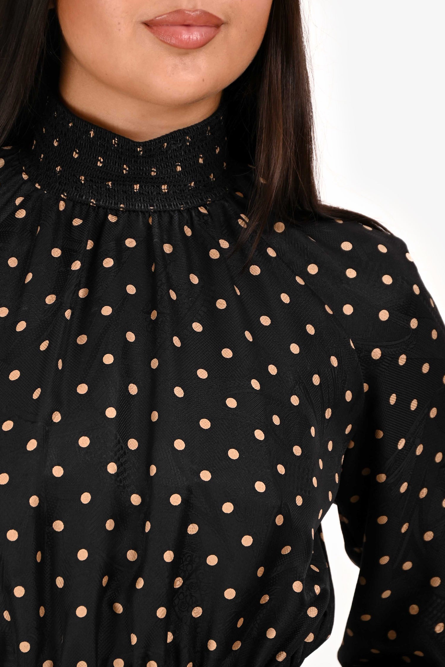 Refresh availabilityHermès Navy/Nude Silk Polka Dot High-Neck Midi Dress. Rear zip closure. Elasticized waist. Unlined.