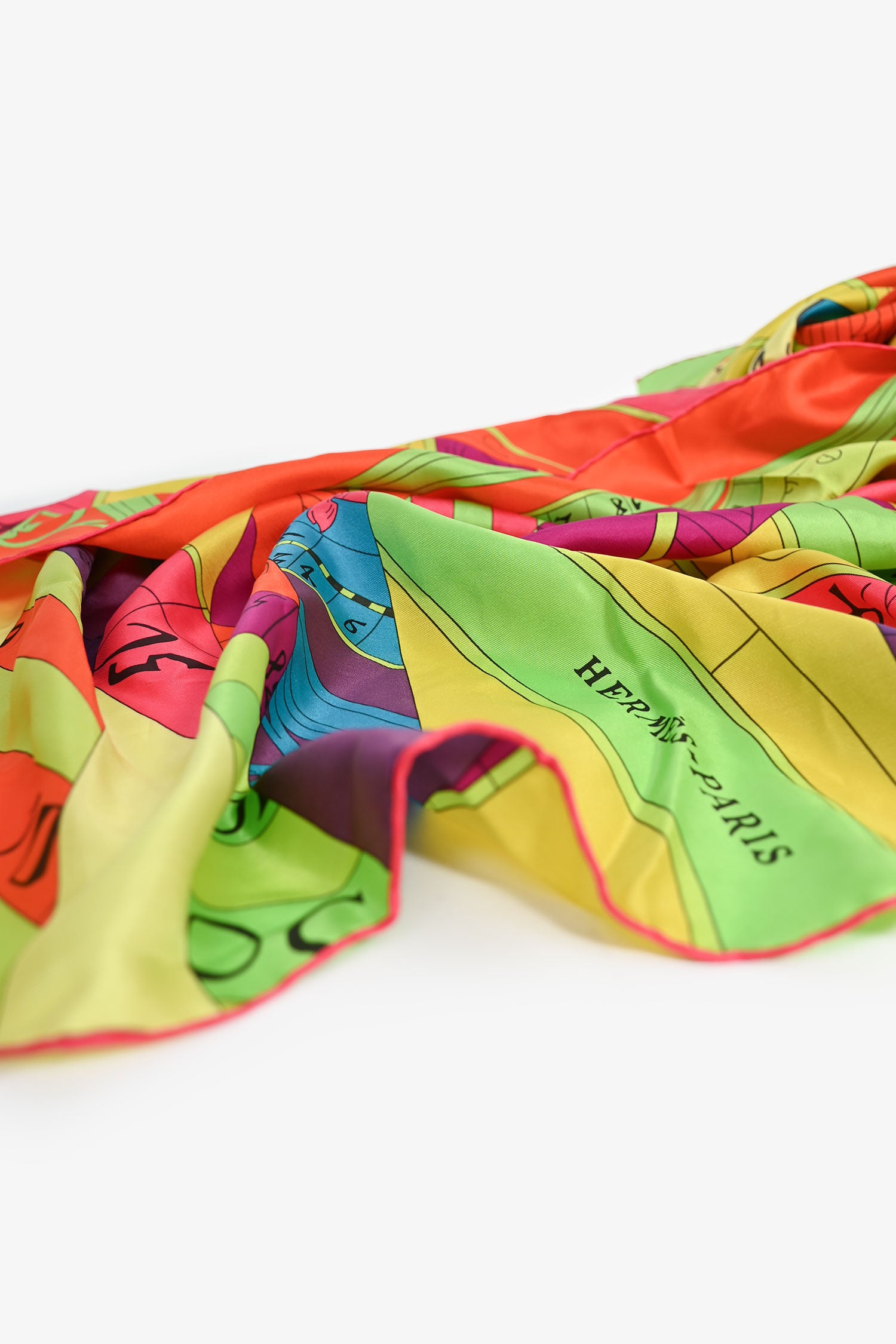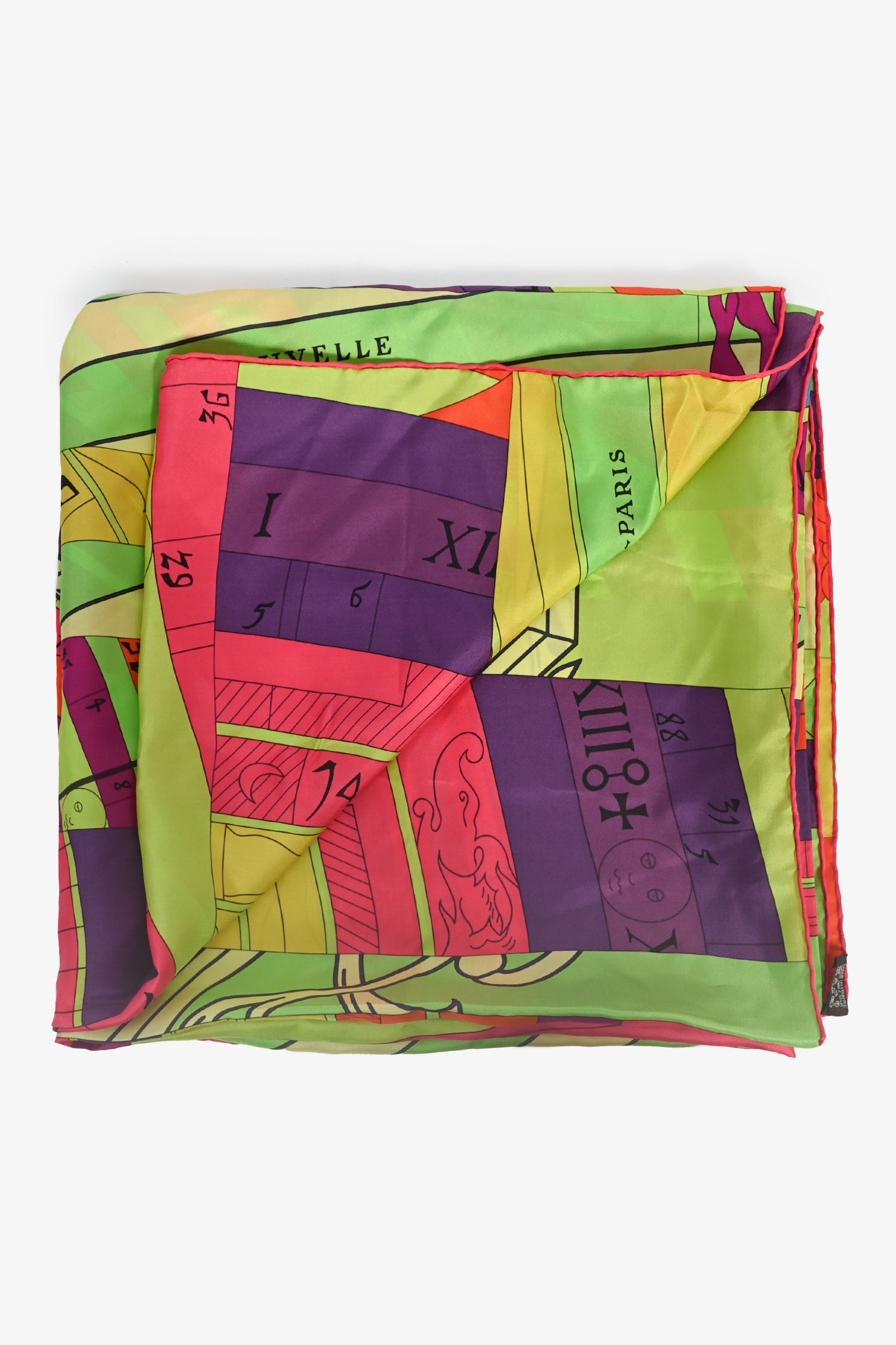 Refresh availabilityHermès Neon Multicoloured Silk 'Astrologie Nouvelle' 130cm Scarf. Tonal stitching.