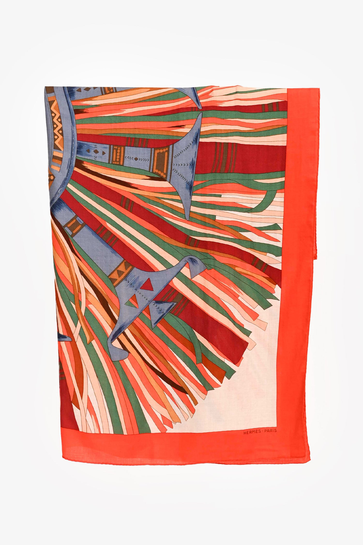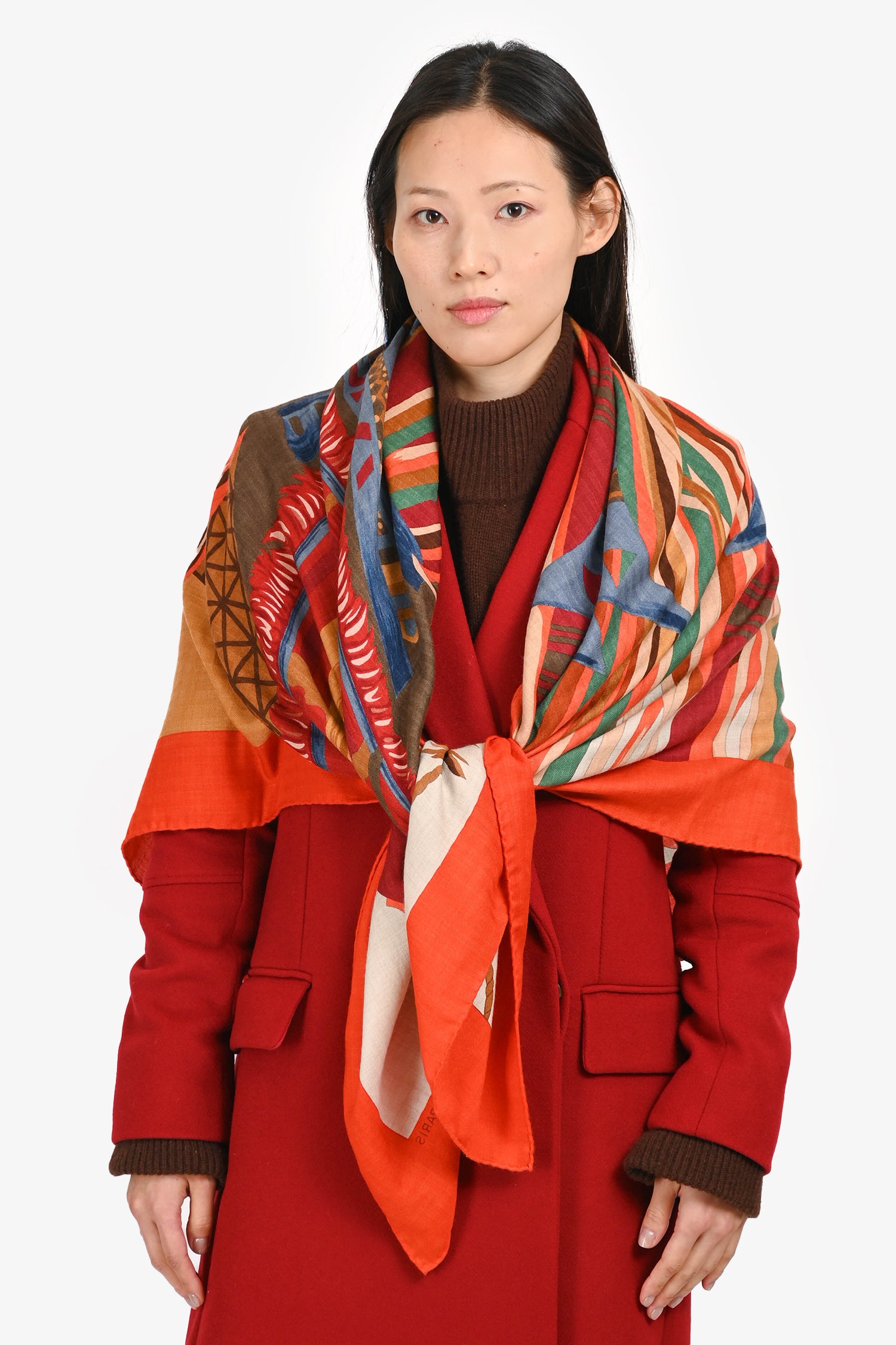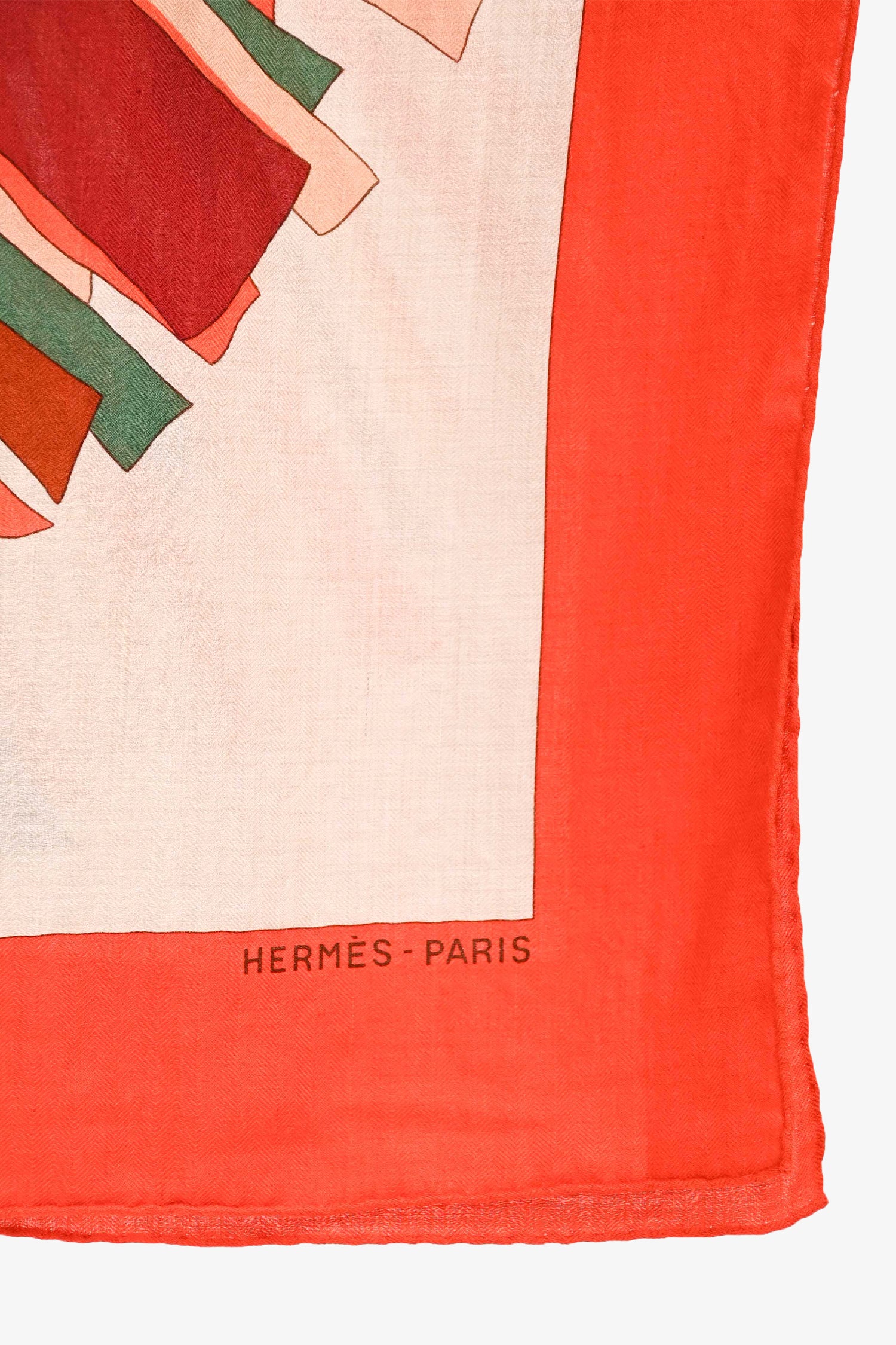 Refresh availabilityHermès Orange Cashmere/Silk Graphic Print Carré 140. Tonal stitching.