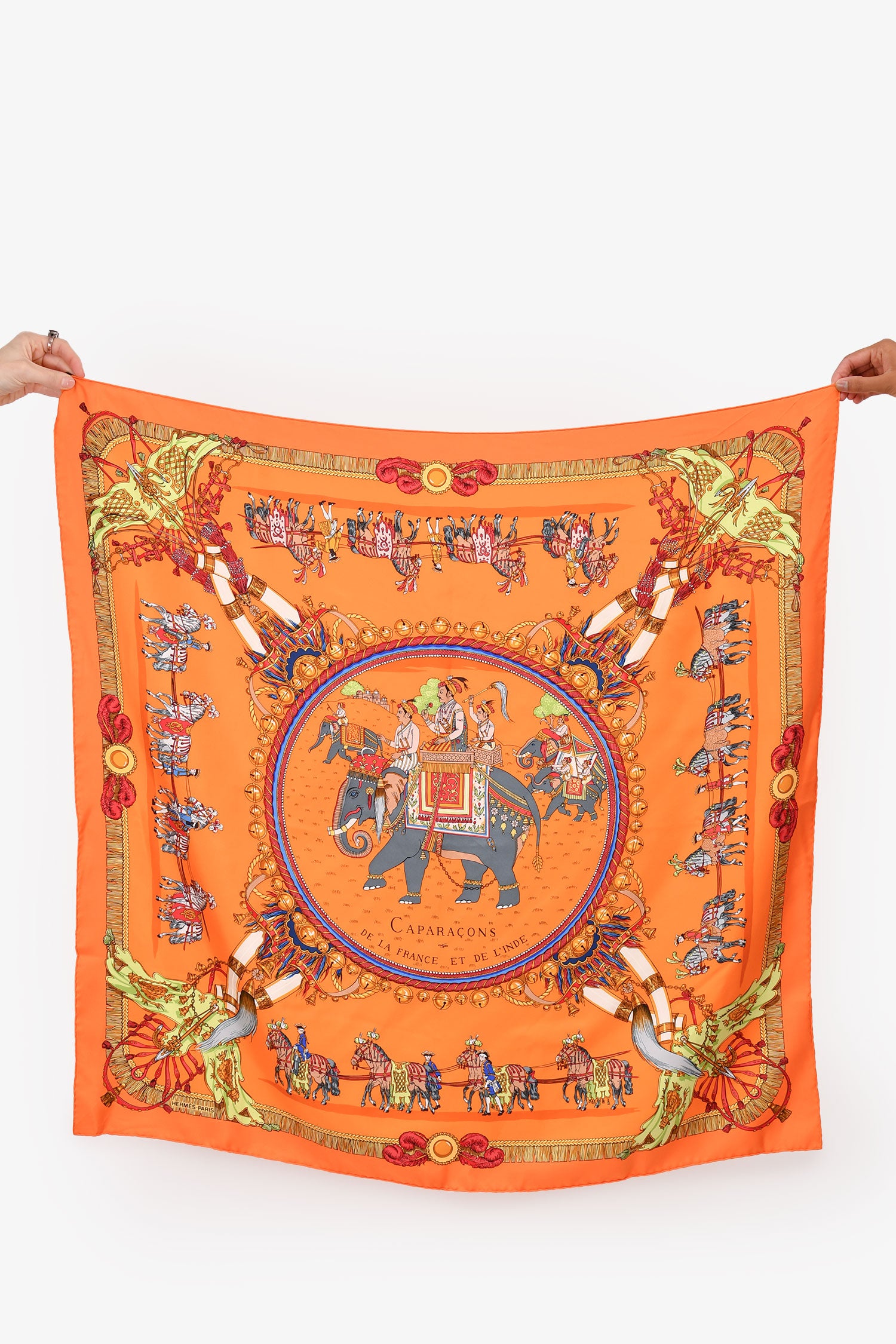 Refresh availabilityHermès Orange Printed Silk 'Caparaçons De la France et de L'inde' 90cm Square Scarf.