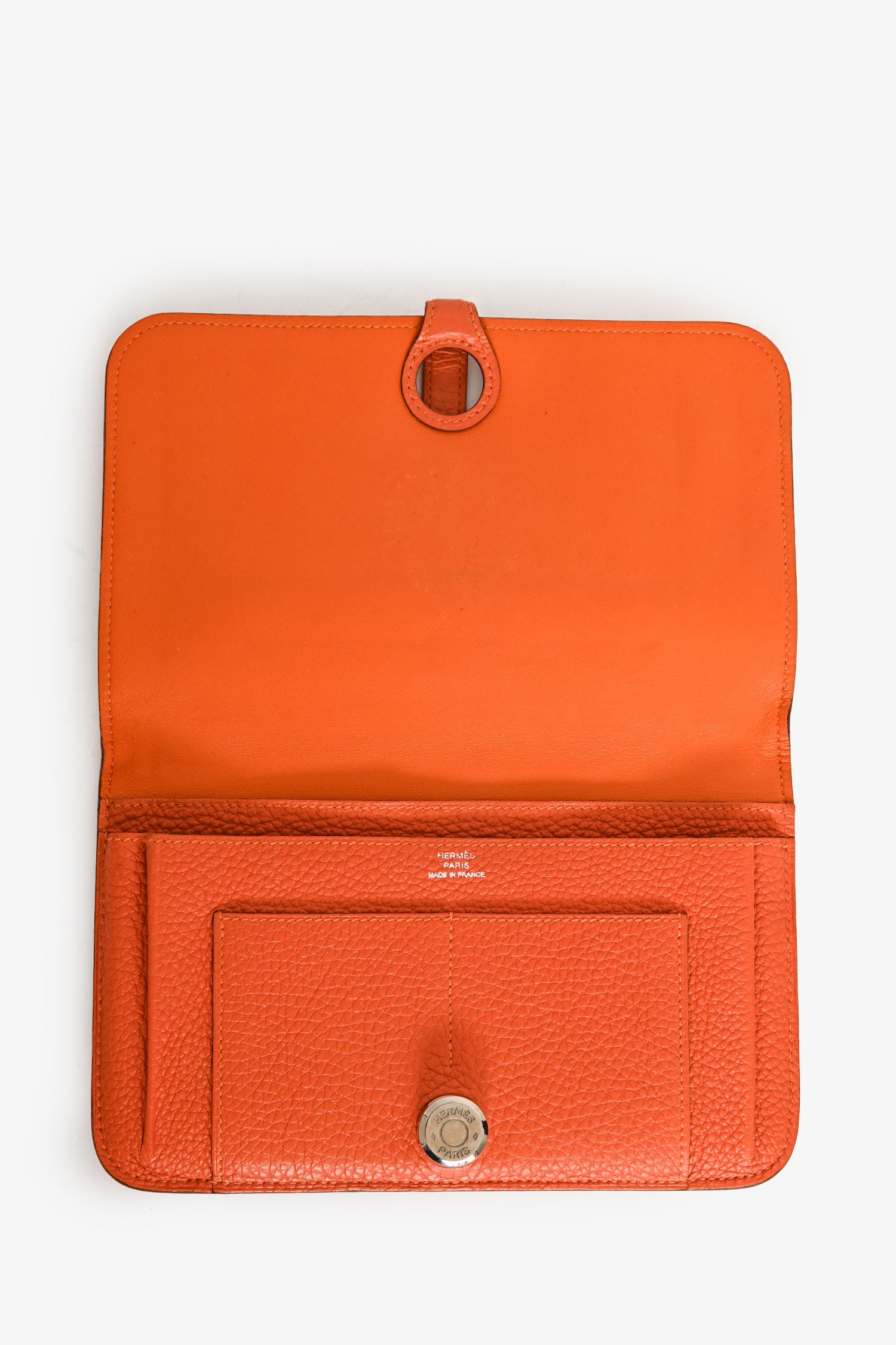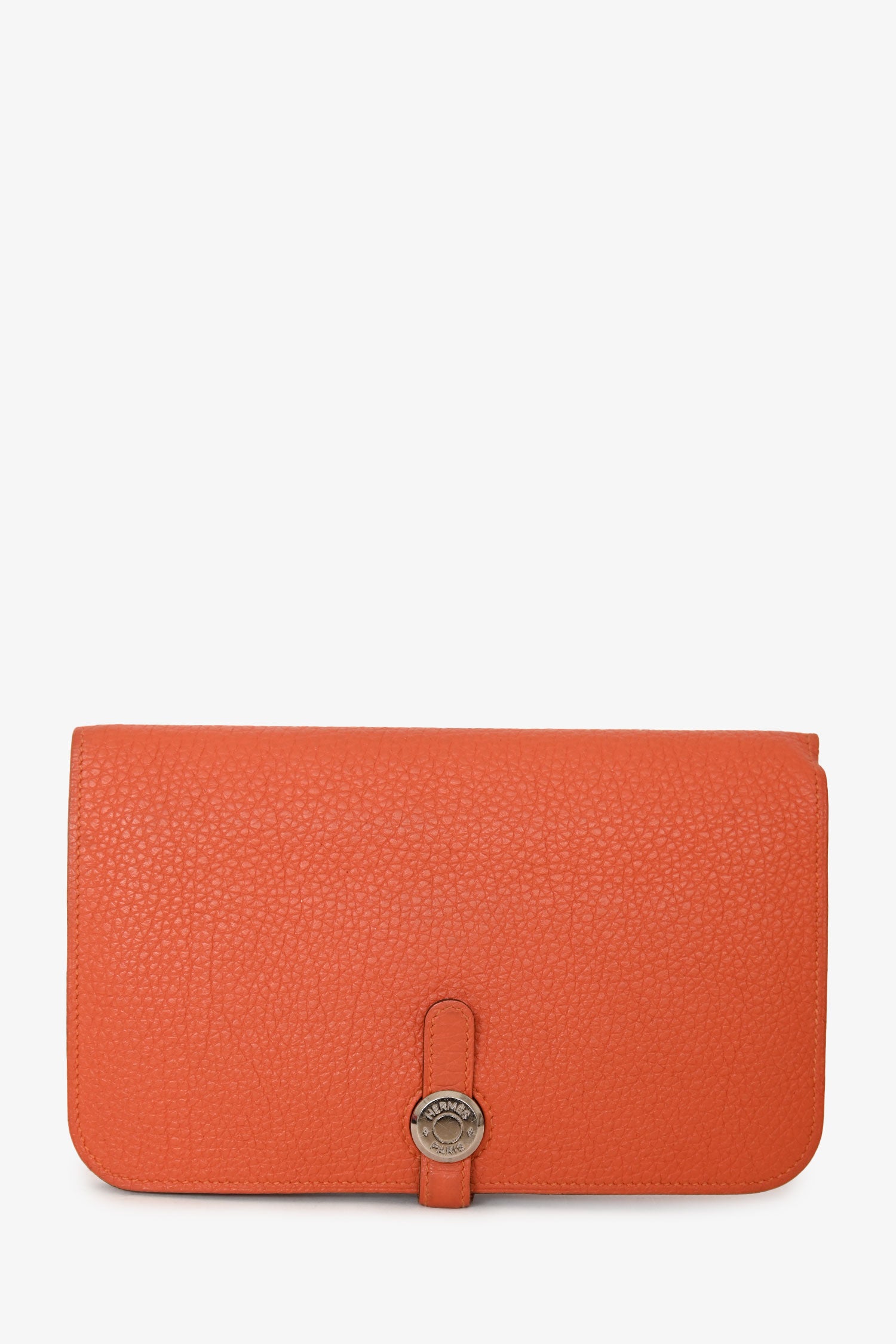 Refresh availabilityHermès Orange Togo Leather Dogon Wallet. Flap closure with leather tab and toggle fastening. 2 interior compartments; 5 interior slip pockets. Silver-tone hardware. Tonal stitching.