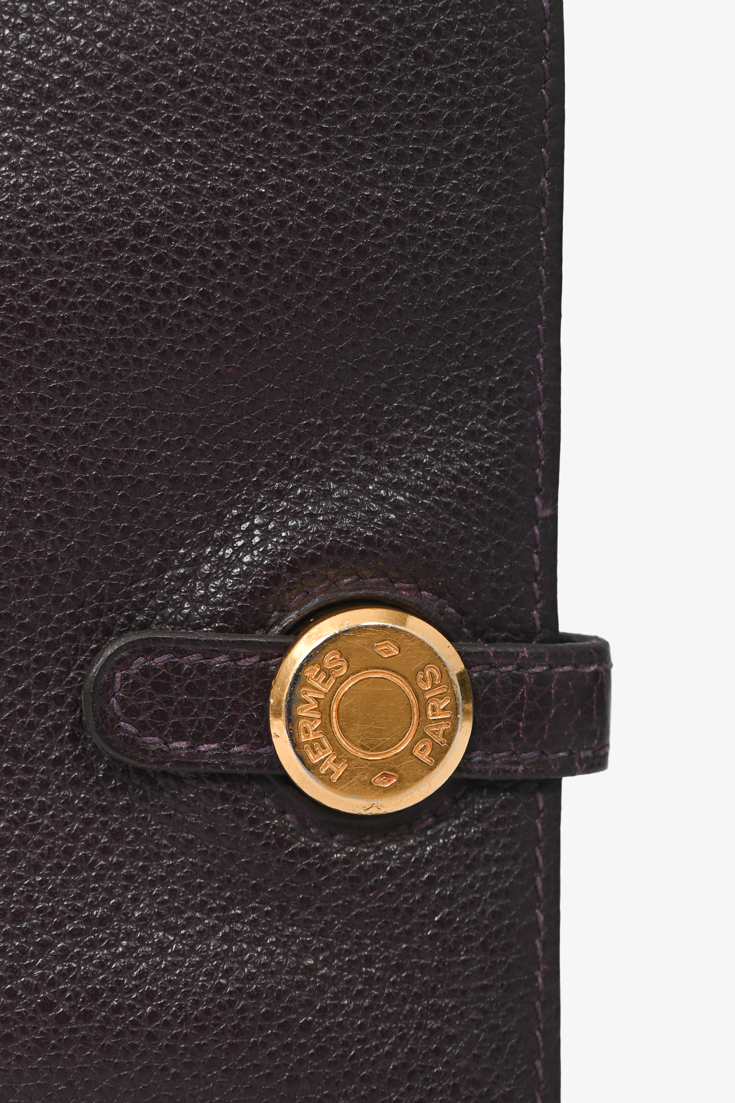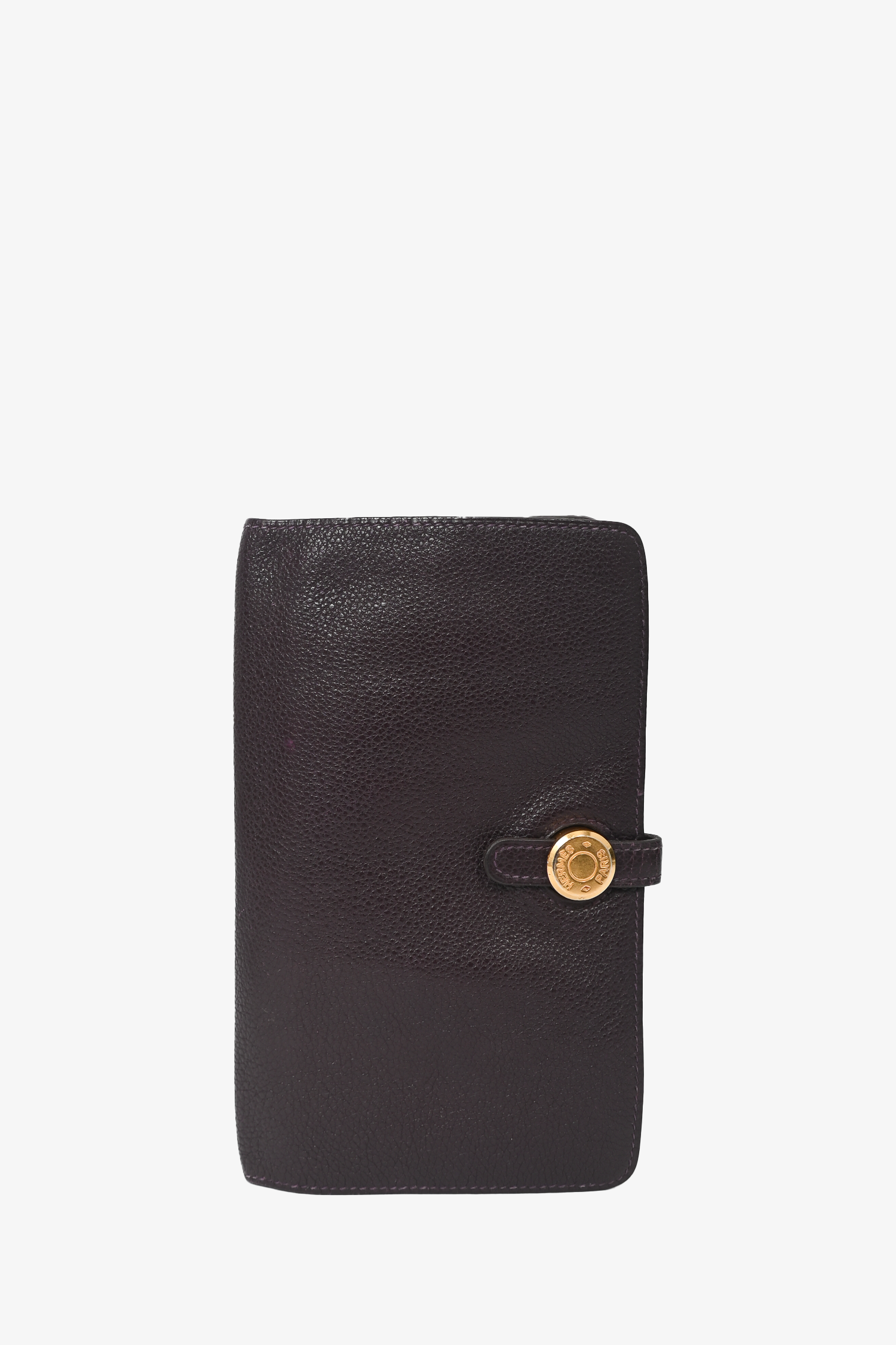Refresh availabilityHermes Dark Purple Clemence Leather Dogon Duo Wallet. Front fold-over strap closure. 6 card slots. 1 billfold compartment. Gold-tone hardware. Tonal stitching.
