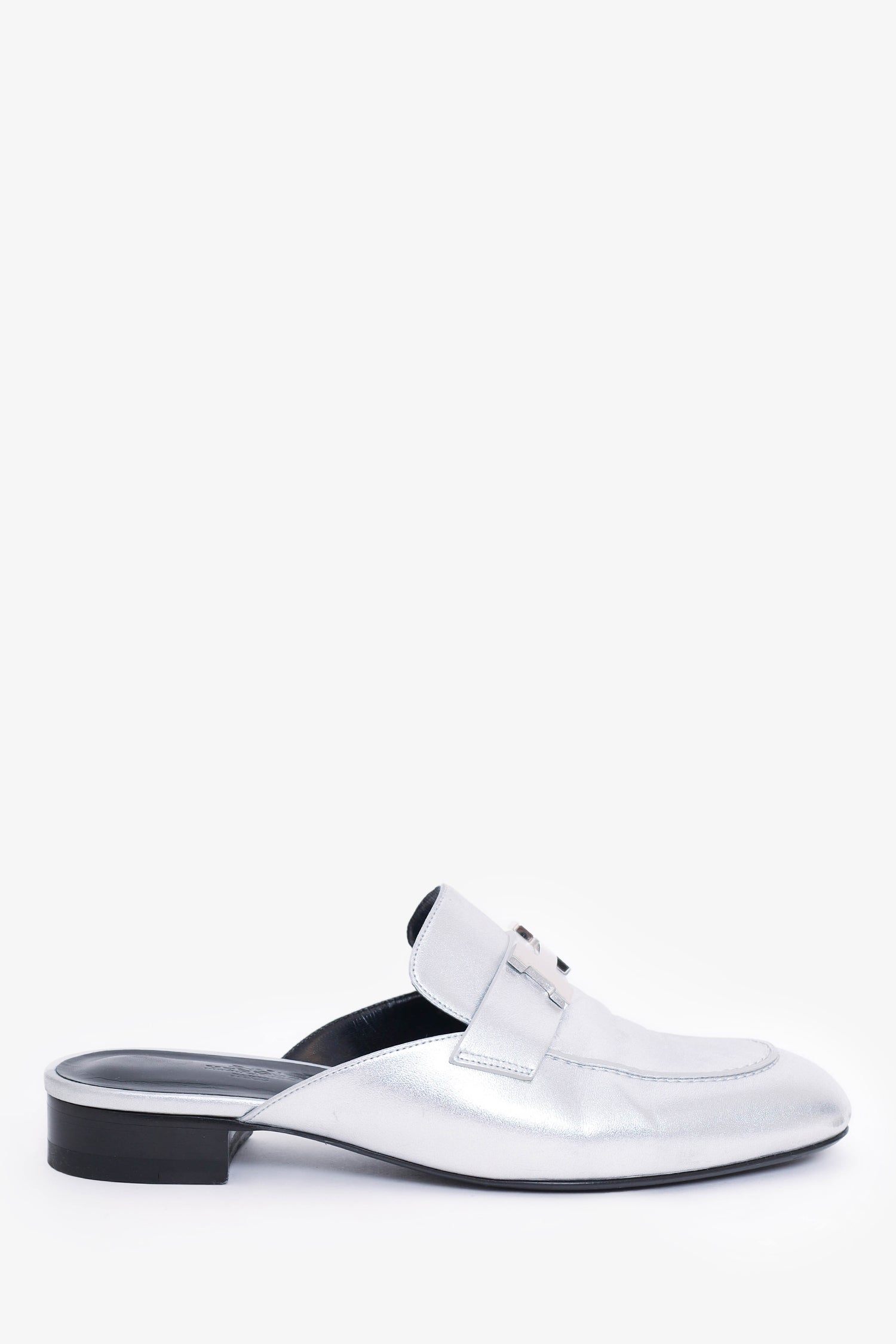 Refresh availabilityHermès Silver Metallic Trocadero H Logo Mules. Slip-on. Silver-tone hardware. Tonal stitching.