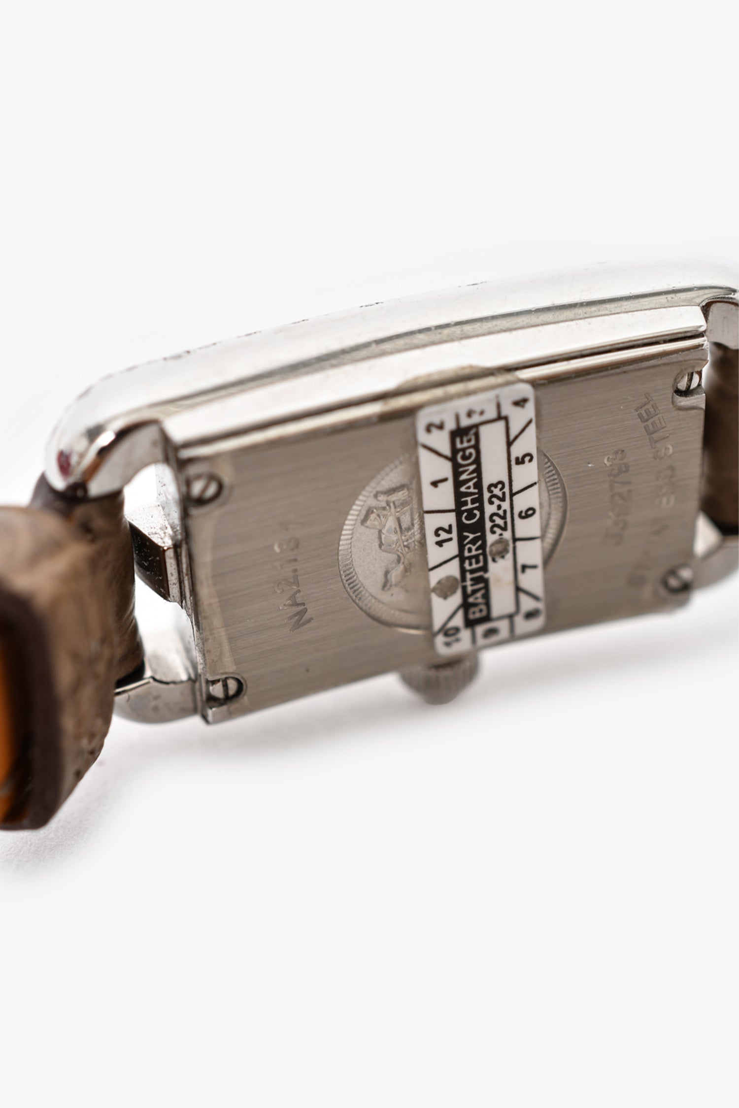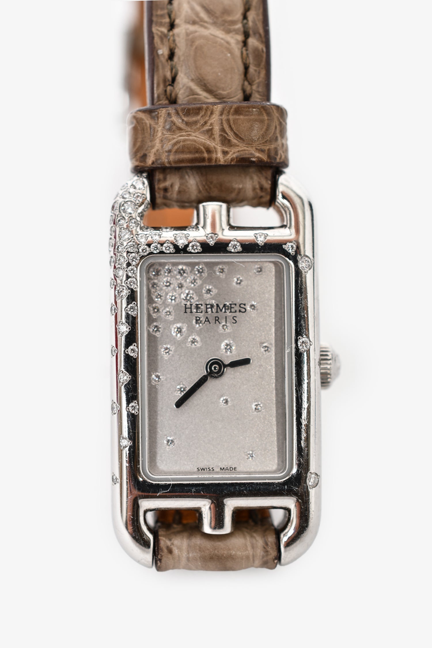 Refresh availabilityHermes Taupe Alligator Leather Stainless Steel 'Nantucket Jeté de Diamants' Watch. Diamonds sprinkled setting. quartz movement. Buckle closure. Tonal stitching. Rectangular watch face.
