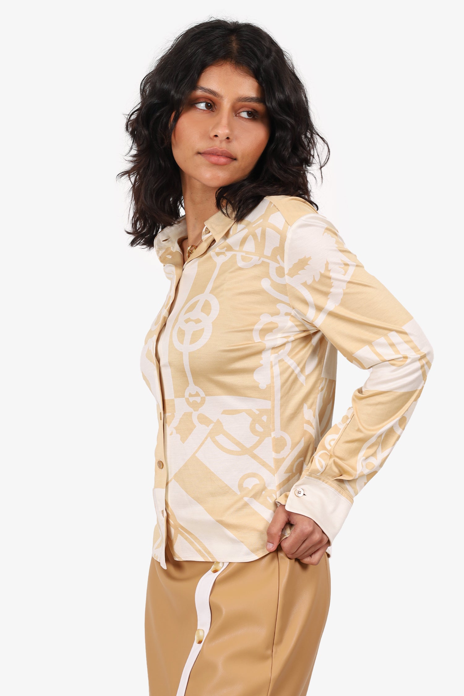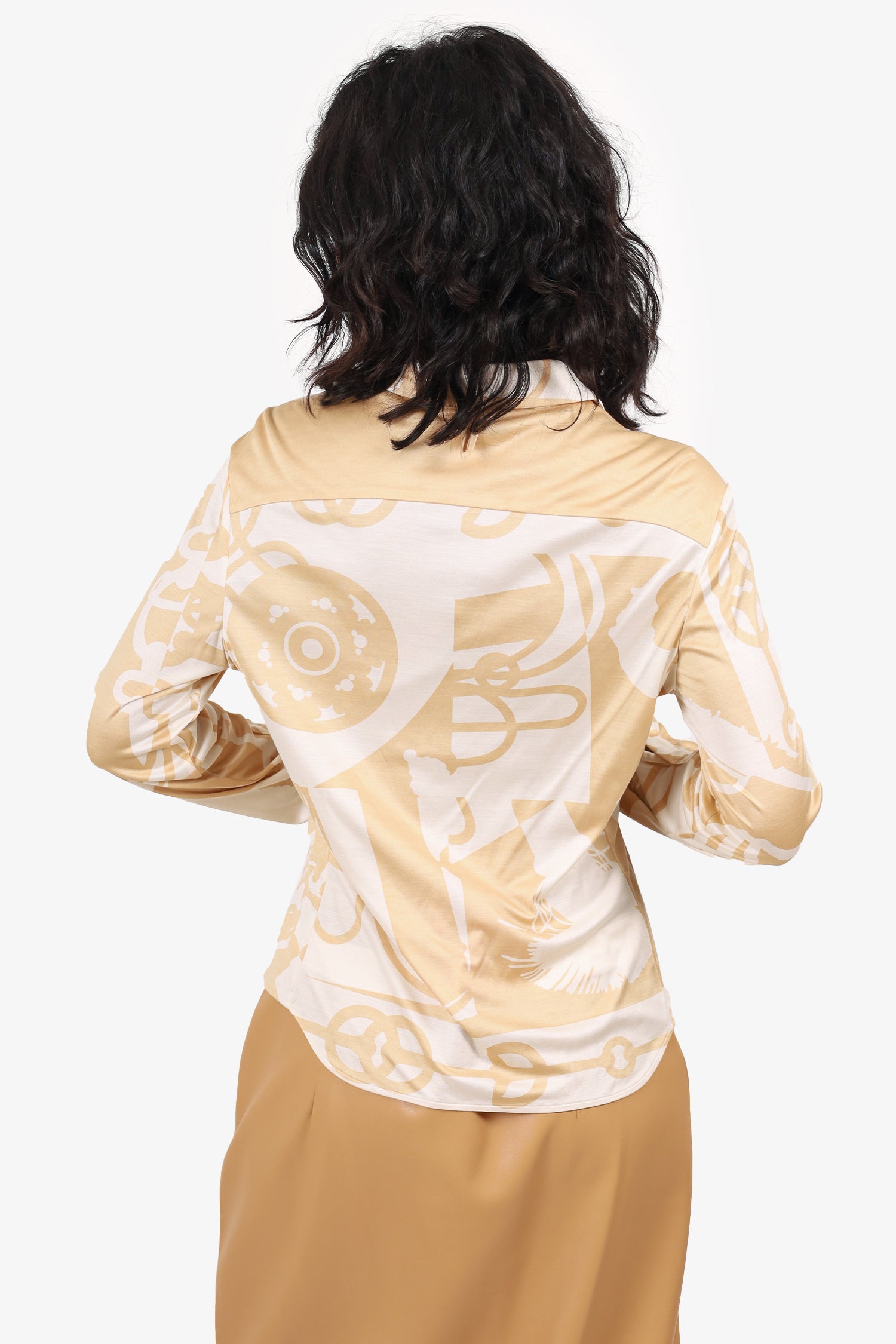 Refresh availabilityHermès White/Beige Silk Printed Blouse. Pull-on. Collared neckline. Front button-up closure. Sleeve cuffs with button-up closure. Tonal stitching.
