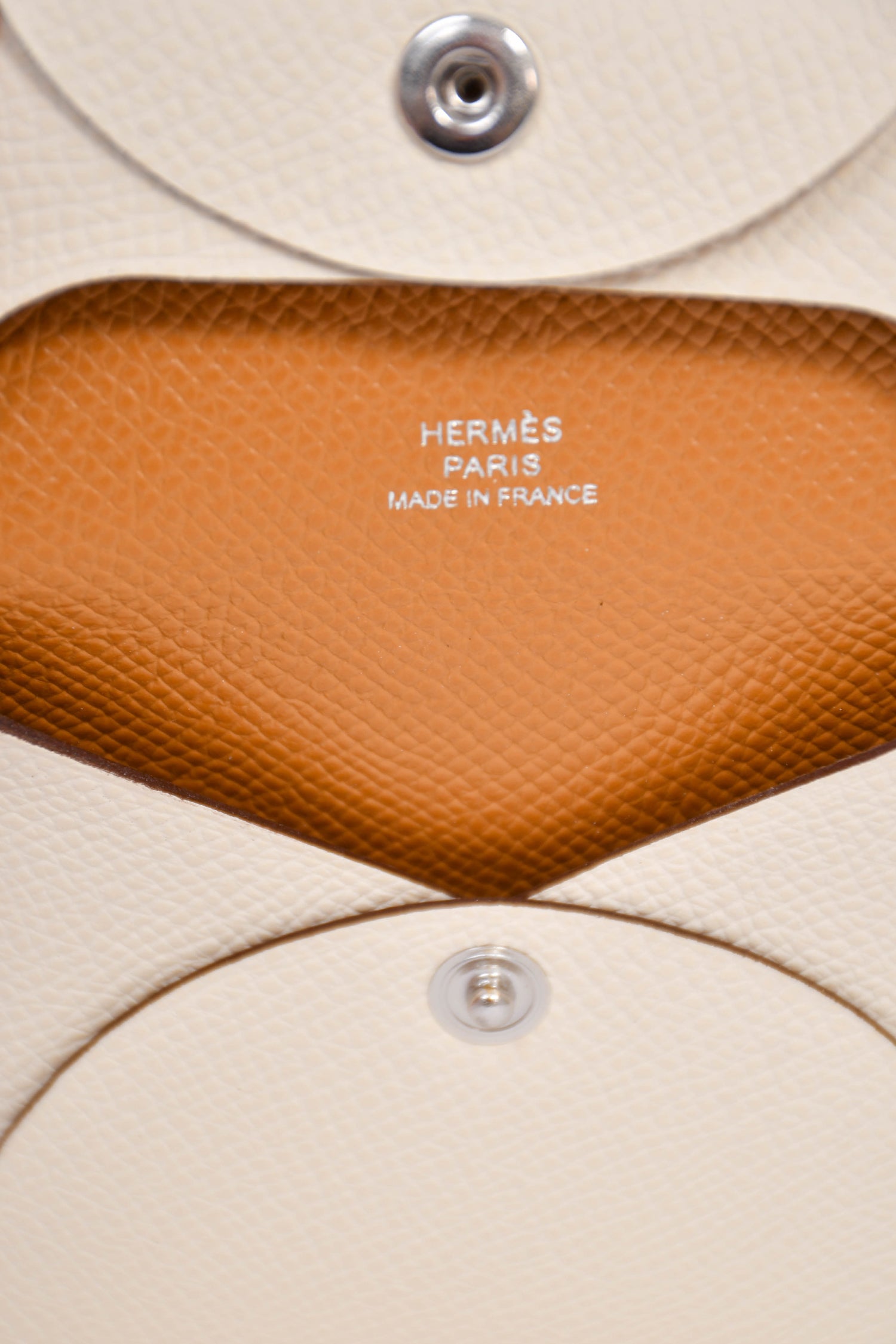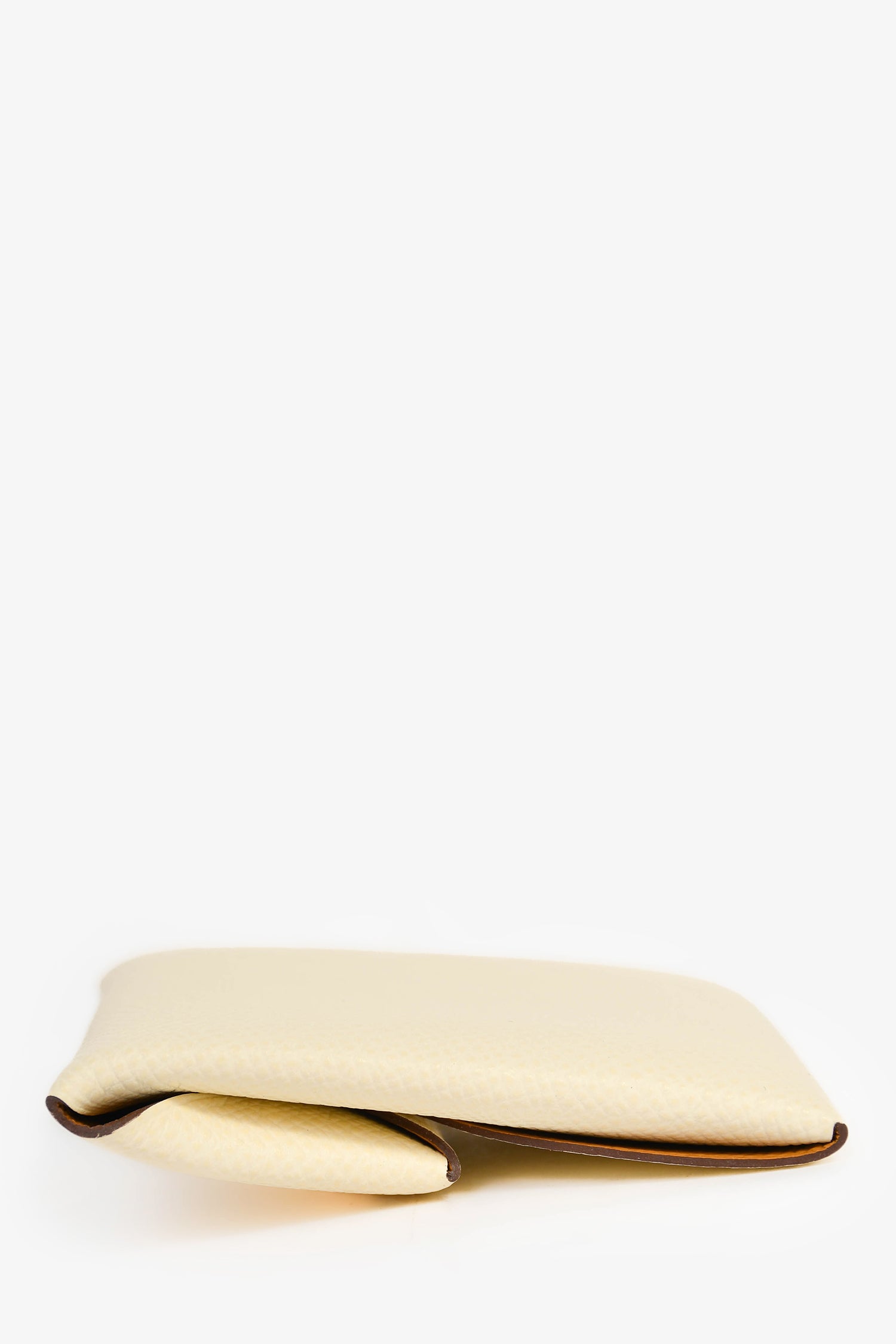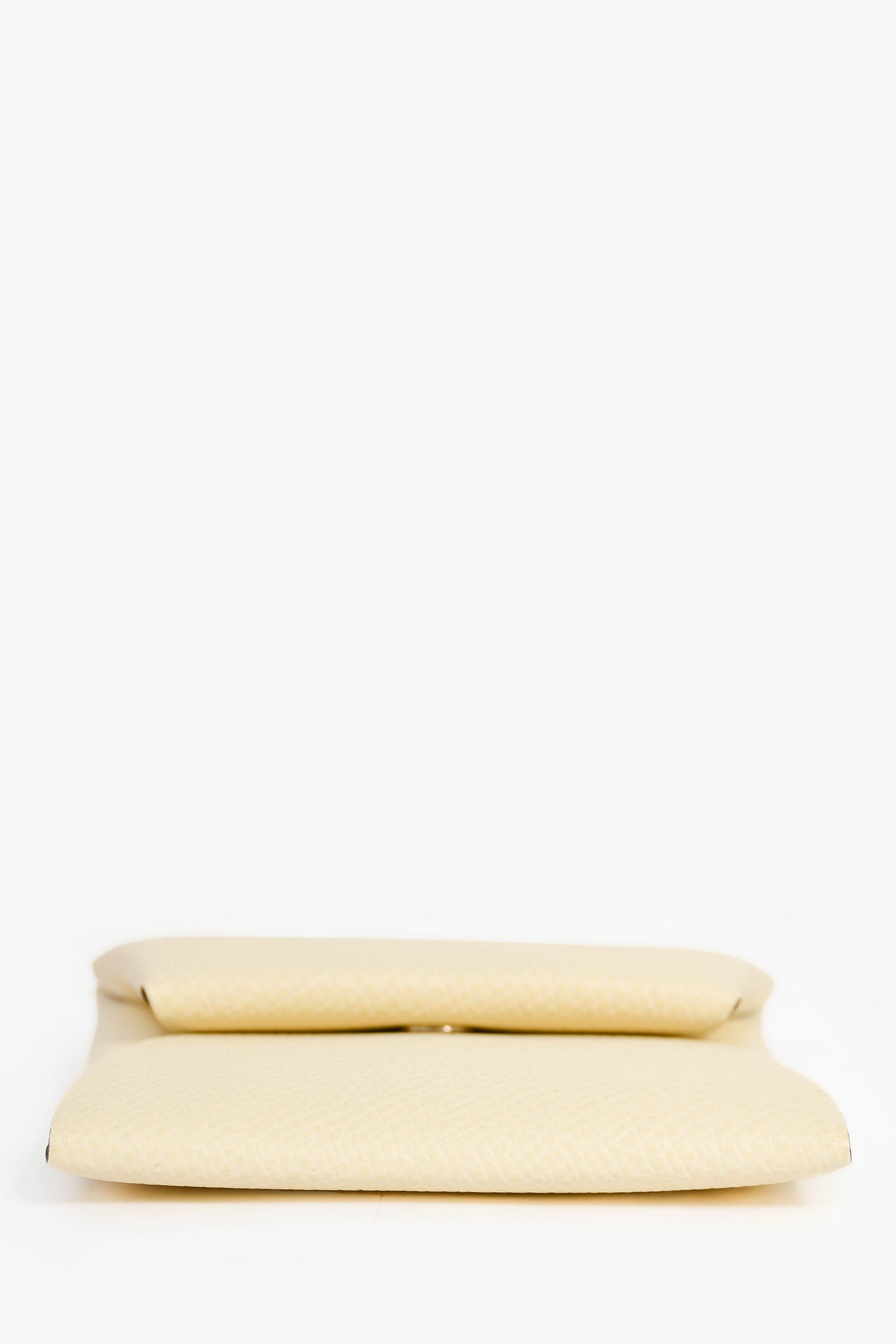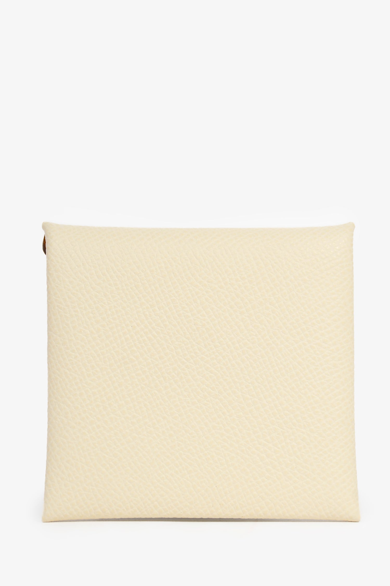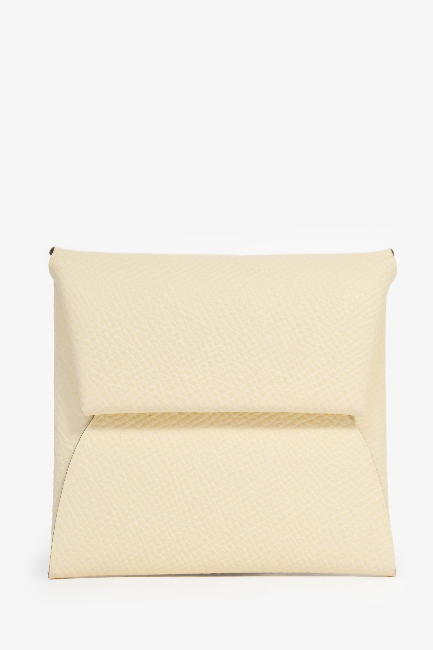Refresh availabilityHermes White Leather 'Calvi' Coin Pouch. Fold-over flap with a snap closure. Fold-in corners. Silver-tone hardware.