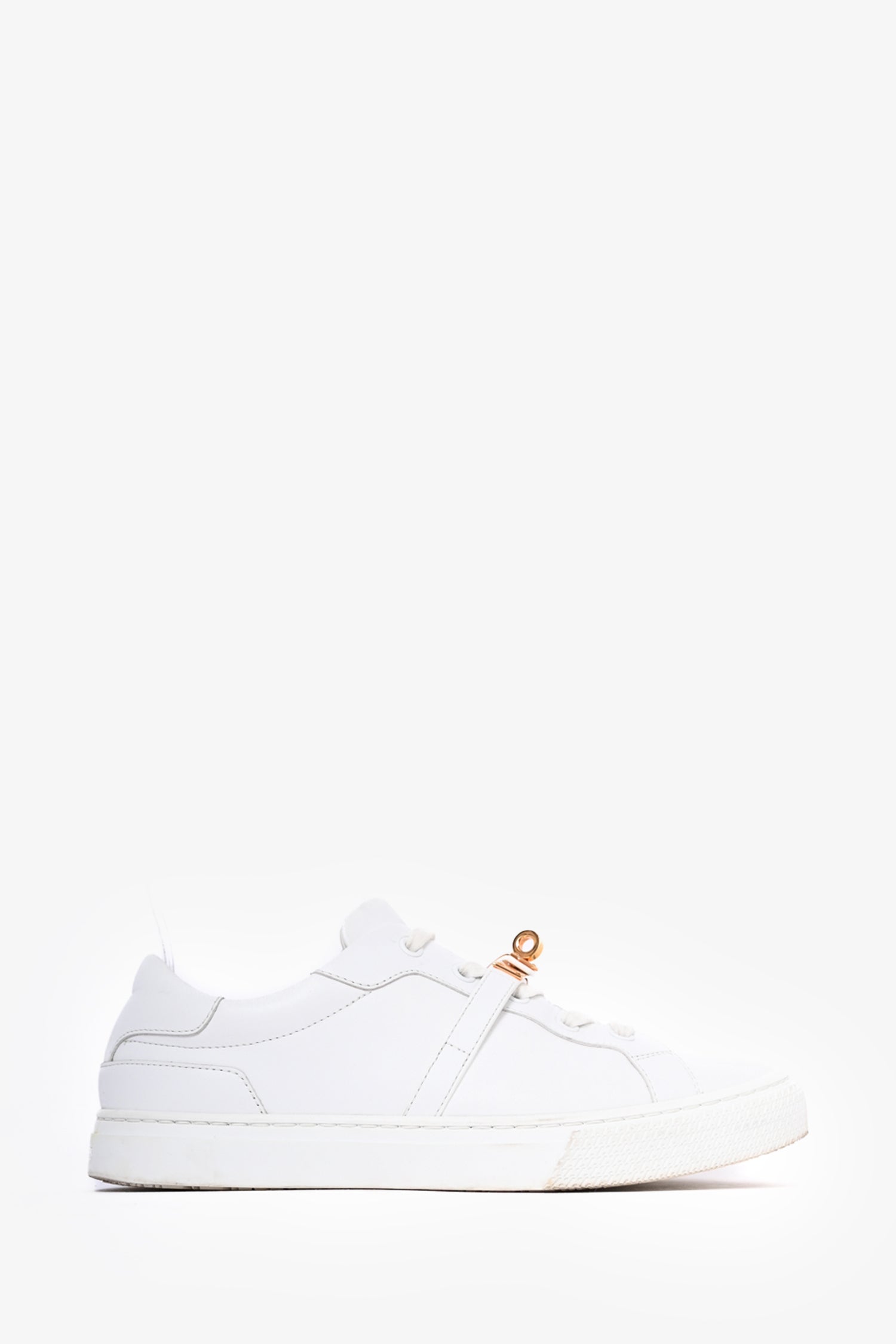 Refresh availabilityHermes White Leather Rose Gold Kelly Sneakers. Rose-gold Kelly closure. Lace-up front closure. Tonal stitching. Comes with additional laces.